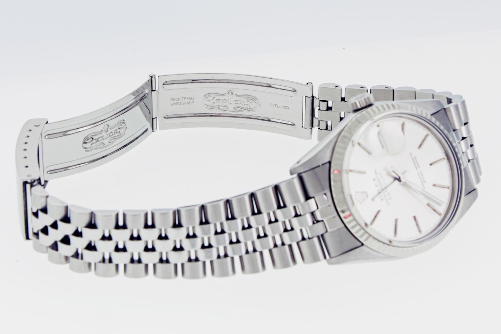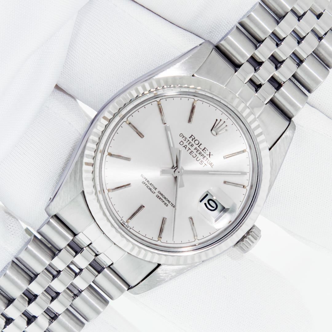 One Mens Pre Owned Rolex Datejust Polished Bright with Satin Finish, This Watch Has Been Serviced & Electronically Tested, Rolex Stainless Steel Case: 36mm, Rolex Stainless Steel Crown, Bezel: 14K White Gold Fluted Bezel. Custom Crystal: New Plastic With Date Window. Custom Hands: New Luminescent Hands. Rolex Movement: Automatic Winding Movement. Rolex Dial: Silver Index Dial With Dash Track. Date Window: 3 O'Clock Position Date Display, Quickset, Model: Datejust, Condition: G-6 Extra Fine. Rolex Bracelet: Stainless Steel Jubilee Band. Bracelet: 7.0 Inch Length, Adjustable. Standard Clasp, With Rolex Logo. This Watch Has Been Serviced Time Tested And Is In Excellent Condition It Is Free Of All Scratches And Dents.