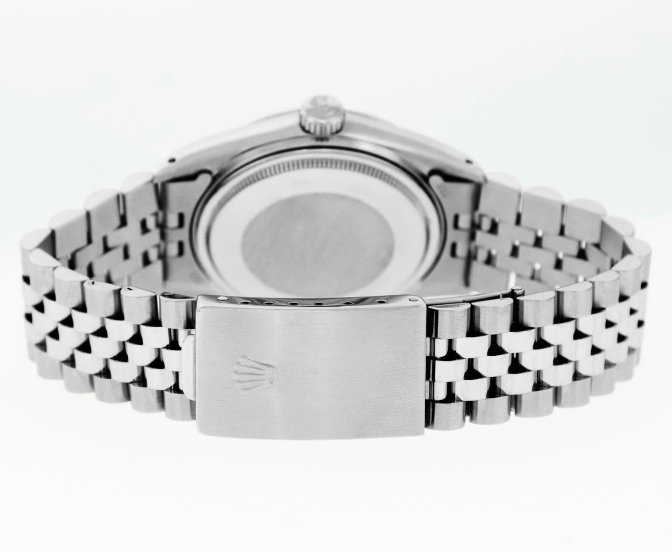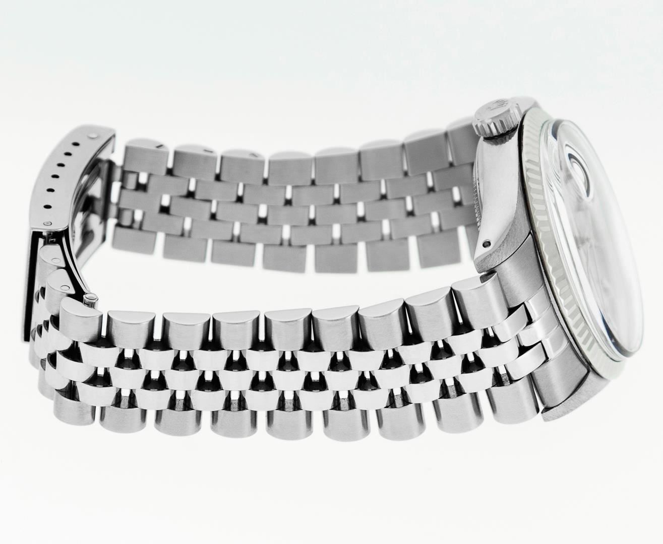 One Mens Pre Owned Stainless Steel Rolex Datejust Polished, Serviced & Electronically Tested, Rolex Stainless Steel Case: 36mm, Rolex Stainless Steel Crown, Bezel: 14K White Gold Fluted Bezel. Custom Crystal: Acrylic Crystal With Magnified Date Window, Custom Hands: New Luminescent Hands. Rolex Movement: Automatic Winding Movement 3035. Rolex Dial: Silver Index With Dash Track & Lumi Dot. Date Window: 3 O'Clock Position Date Display, Quickset, Model: Datejust, Condition: G-6 Extra Fine. Rolex Bracelet: Stainless Steel Jubilee Band. Bright Polish & Satin Finish. 7.0 Inch Length, Adjustable. Standard Clasp, With Rolex Logo. This Watch Has Been Serviced Time Tested And Is In Excellent Condition It Is Free Of All Scratches And Dents.