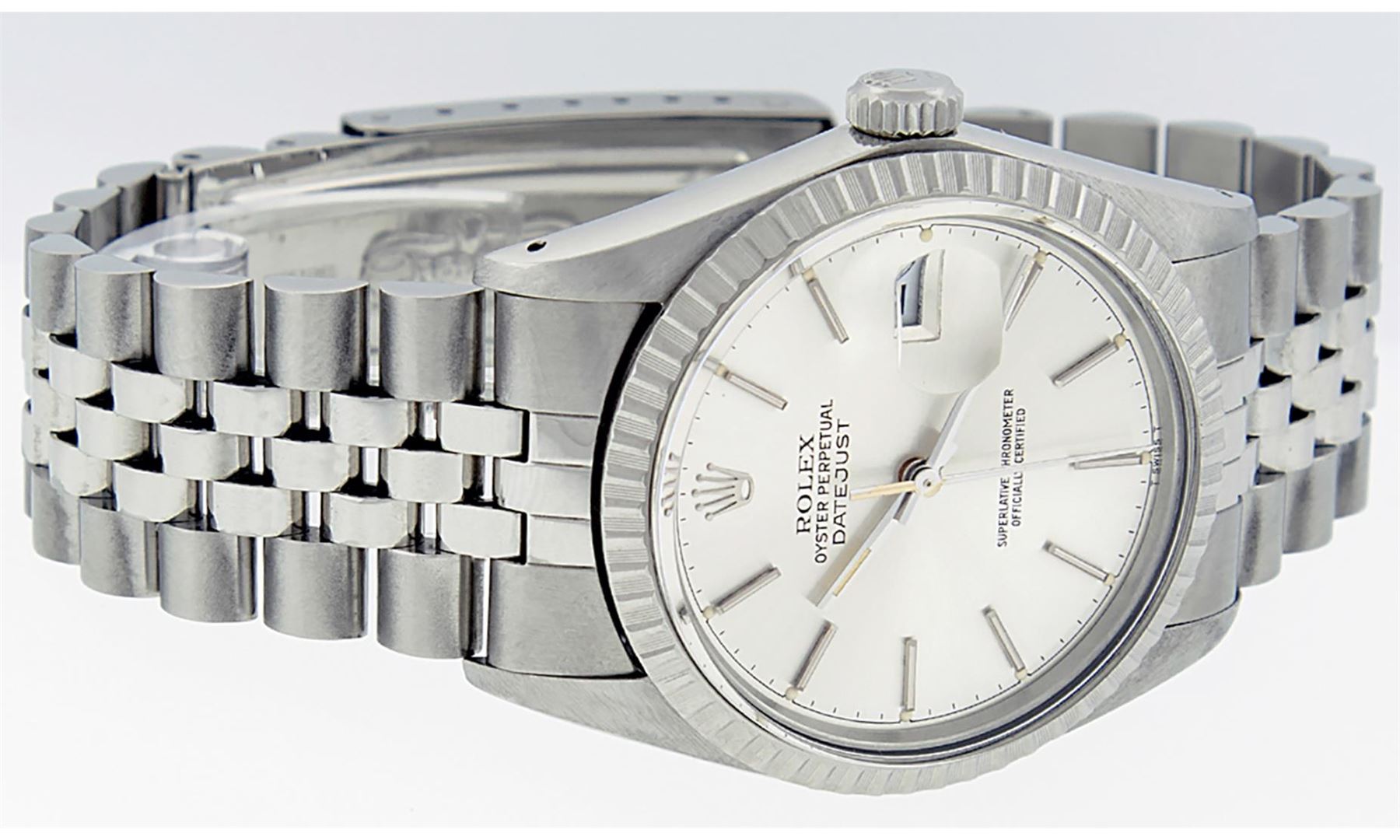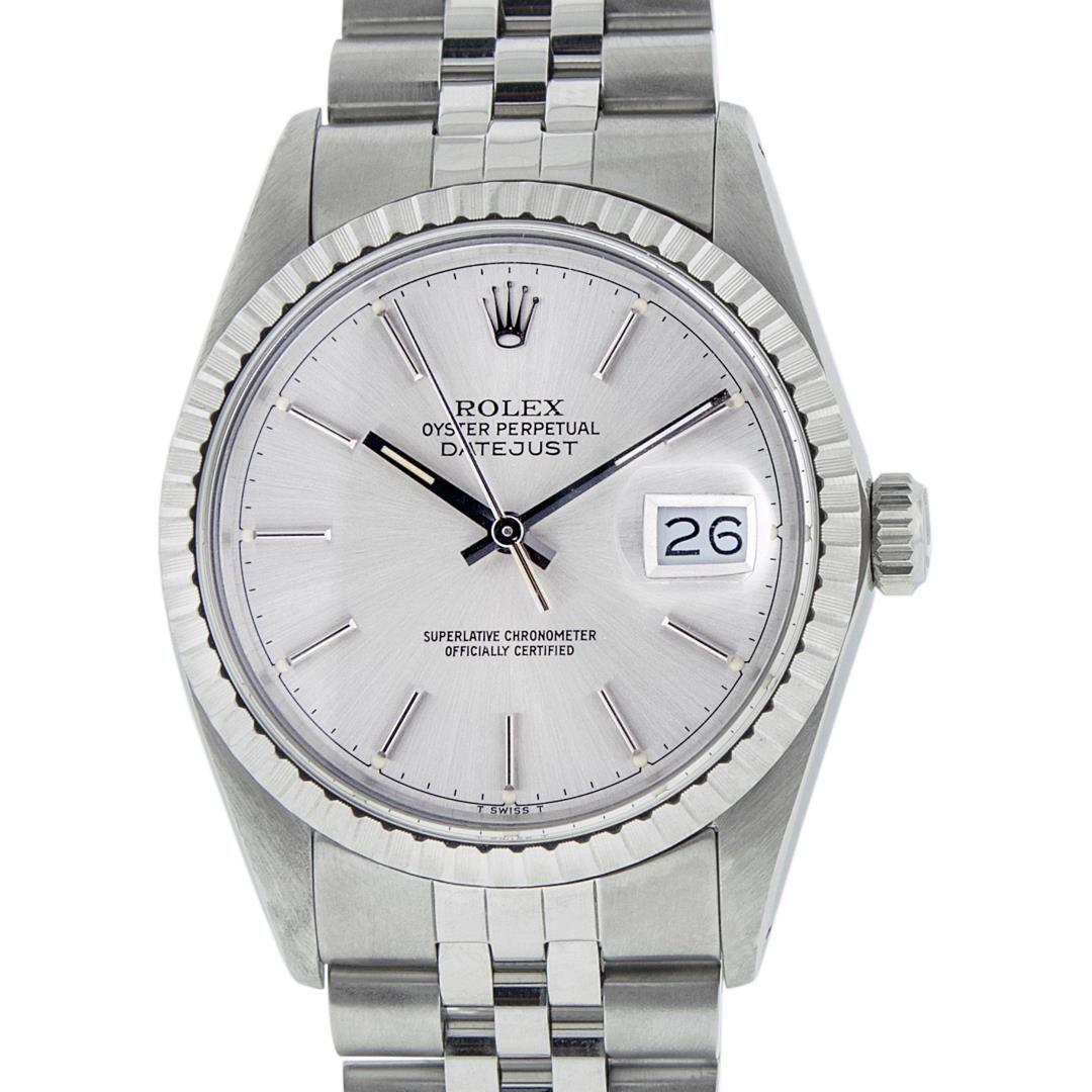 One Mens Pre Owned Stainless Steel Rolex Datejust Polished, Serviced & Electronically Tested, Rolex Stainless Steel Case: 36mm, Stainless Steel Crown, Rolex Bezel: Stainless Steel Engine Turn Bezel. Custom Crystal: Acrylic With Date Window. Hands: Luminescent Hands. Rolex Movement: Automatic Winding Movement 3035. Rolex Dial: Silver Index With Dash Track And Lumi Dots. Date Window: 3 O'Clock Position Date Display, Quickset, Model: Datejust, Condition: G-6 Extra Fine. Rolex Bracelet: Stainless Steel Jubilee Band. Bright Polish & Satin Finish. 7.0 Inch Length, Adjustable. Standard Clasp, With Rolex Logo. This Watch Has Been Serviced Time Tested And Is In Excellent Condition It Is Free Of All Scratches And Dents.