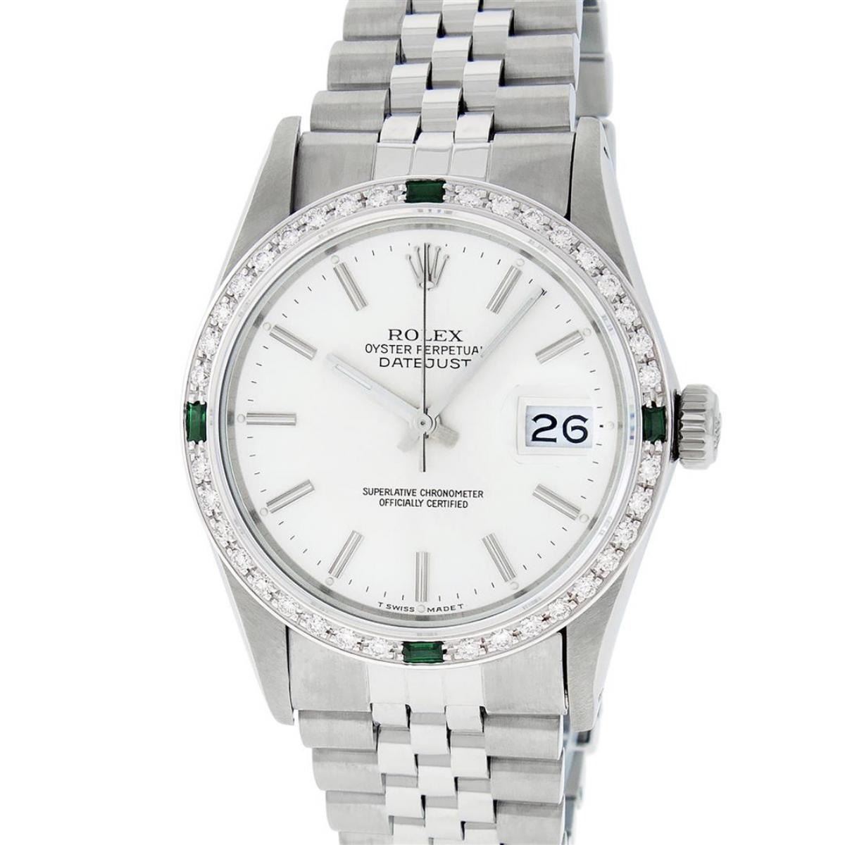 One Mens Stainless Steel Rolex Datejust Polished Bright with Satin Finish, This Watch Has Been Serviced & Electronically Tested, Stainless Steel Case: 36mm, Stainless Steel Crown, Custom Bezel: New 18K White Gold Synthetic Emerald Beadset Diamond Bezel, Diamond + Gem Count: 36 Diamonds + 4 Synthetic Emeralds, Total Weight 1.00 Carat, Clarity: SI-VS, Color: G to H. Custom Crystal: New Synthetic Sapphire Cyclops Lens. Custom Hands: New Luminescent Hands. Movement: Automatic Winding Movement. Dial: Silver Index With Dash Track & Lumi Dots. Date Window: 3 O'Clock Position Date Display, Quickset, Model: Datejust, Condition: G-6 Extra Fine. Bracelet: Stainless Steel Jubilee. Bracelet: 7.0 Inch Length, Adjustable. Standard Clasp, With Rolex Logo. This Watch Has Been Serviced Time Tested And Is In Excellent Condition It Is Free Of All Scratches And Dents.