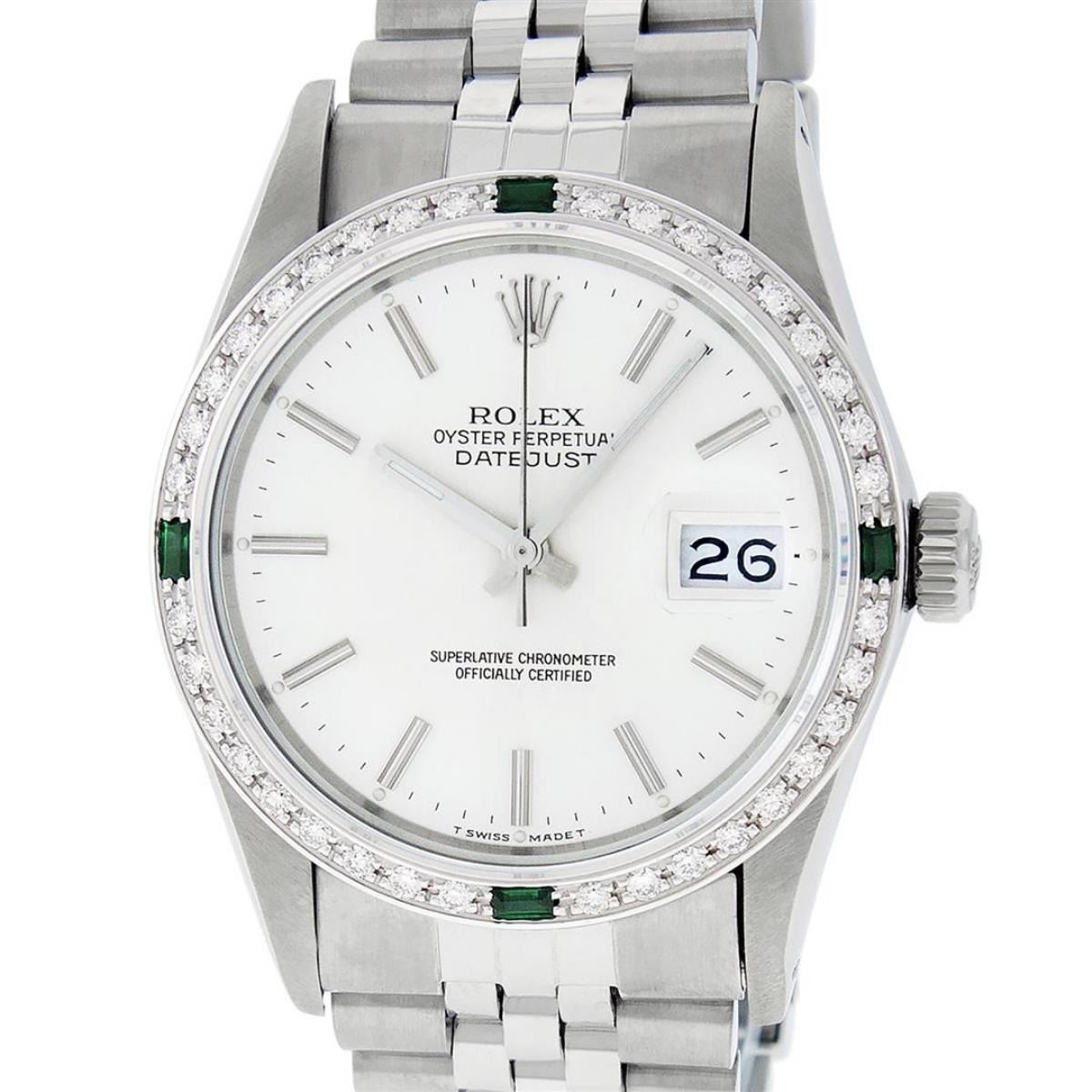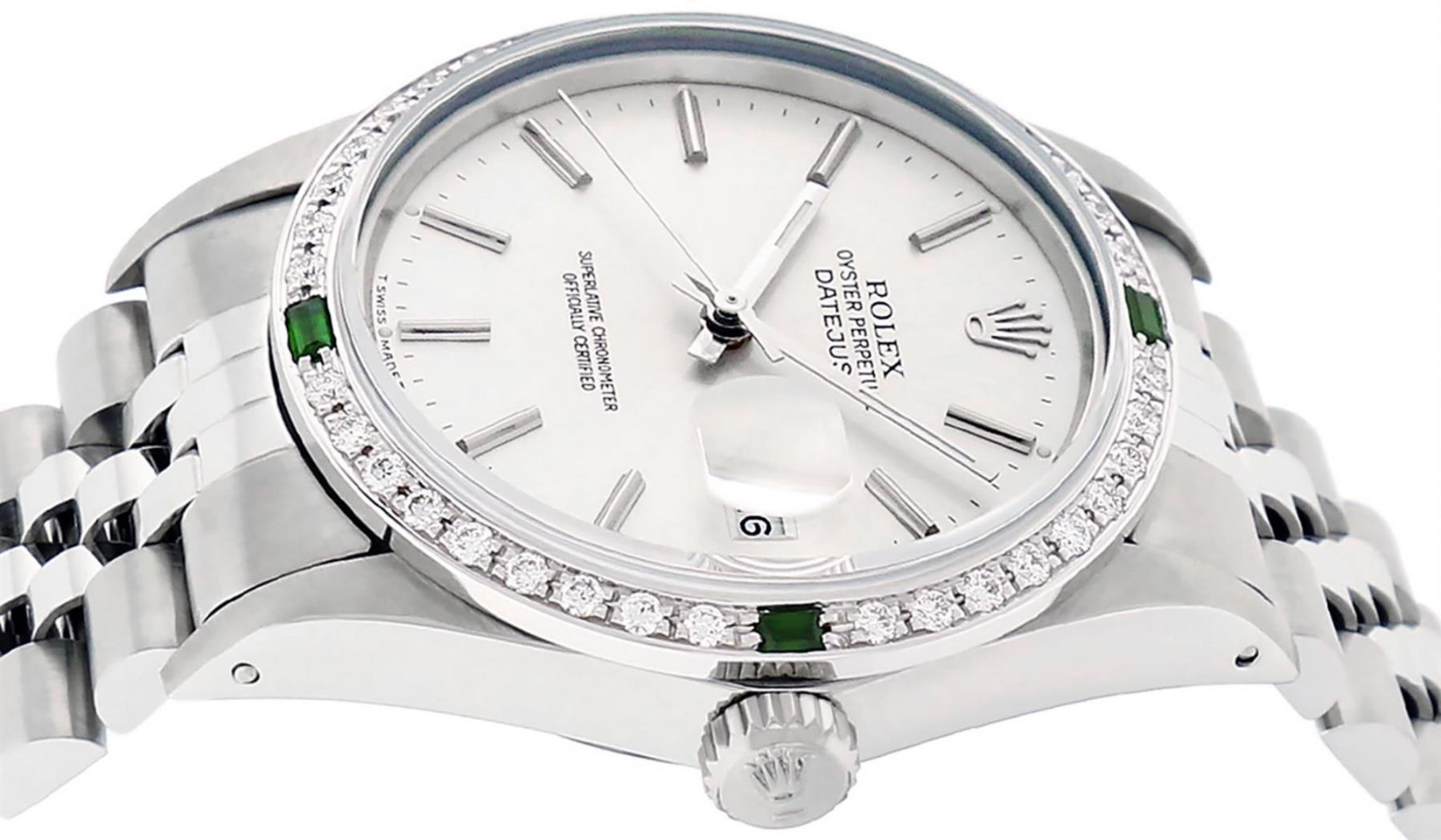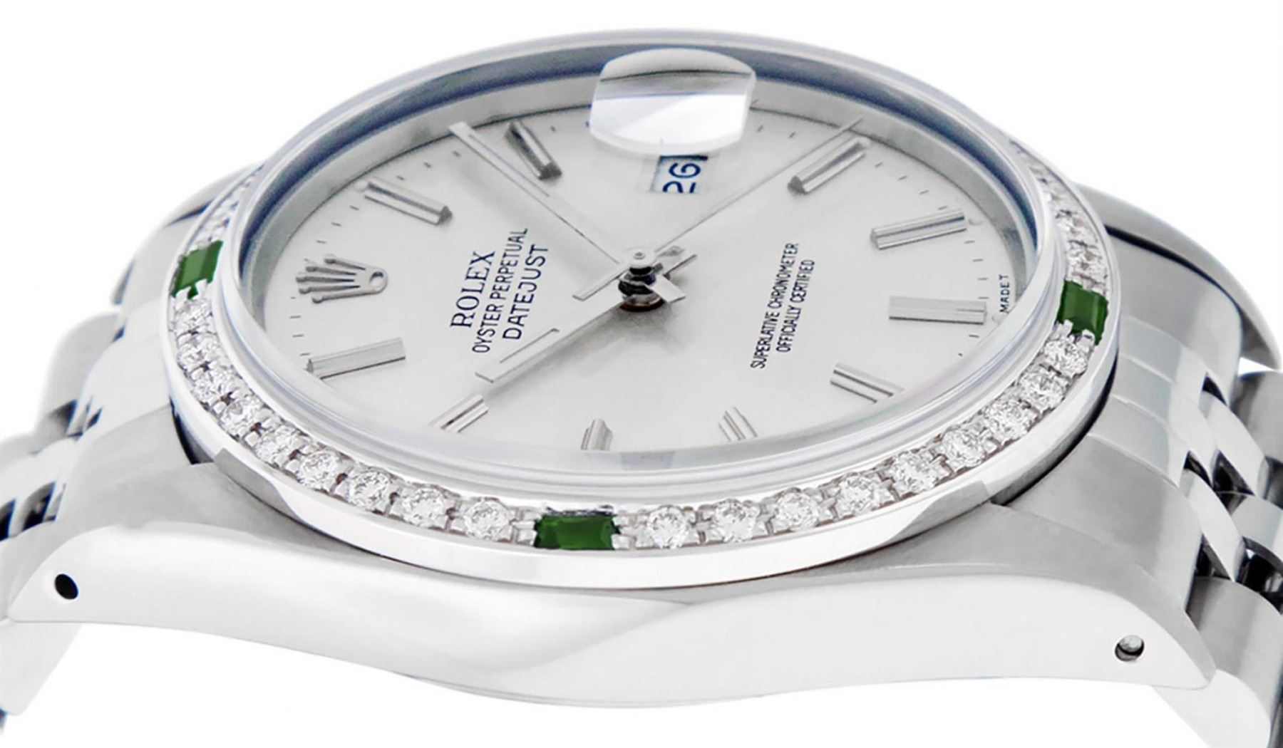 One Mens Stainless Steel Rolex Datejust Polished Bright with Satin Finish, This Watch Has Been Serviced & Electronically Tested, Stainless Steel Case: 36mm, Stainless Steel Crown, Custom Bezel: New 18K White Gold Synthetic Emerald Beadset Diamond Bezel, Diamond + Gem Count: 36 Diamonds + 4 Synthetic Emeralds, Total Weight 1.00 Carat, Clarity: SI-VS, Color: G to H. Custom Crystal: New Synthetic Sapphire Cyclops Lens. Custom Hands: New Luminescent Hands. Movement: Automatic Winding Movement. Dial: Silver Index With Dash Track & Lumi Dots. Date Window: 3 O'Clock Position Date Display, Quickset, Model: Datejust, Condition: G-6 Extra Fine. Bracelet: Stainless Steel Jubilee. Bracelet: 7.0 Inch Length, Adjustable. Standard Clasp, With Rolex Logo. This Watch Has Been Serviced Time Tested And Is In Excellent Condition It Is Free Of All Scratches And Dents.