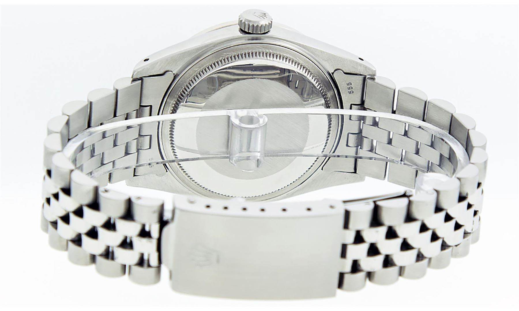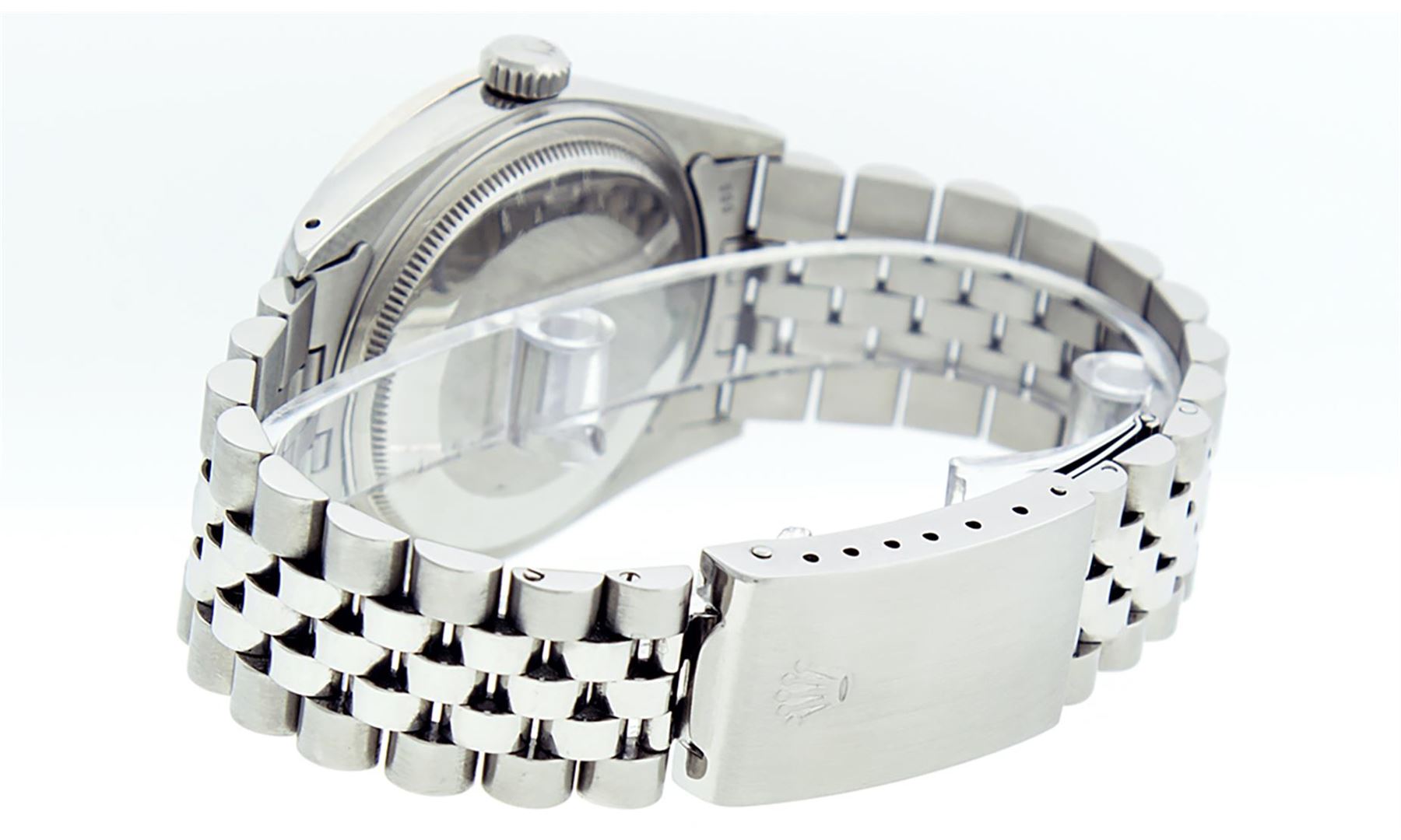 One Mens Pre Owned Stainless Steel Rolex Datejust Polished Bright with Satin Finish, This Watch Has Been Serviced & Electronically Tested, Rolex Stainless Steel Case: 36mm, Rolex Stainless Steel Crown, Custom Bezel: New 18K White Gold Emerald Beadset Diamond Bezel, Diamond + Gem Count: 36 Diamonds + 4 Emeralds, Total Weight 1.00 Carat, Clarity: SI-VS, Color: G to H. Custom Crystal: New Sapphire With Date Window. Custom Hands: New Luminescent Hands. Rolex Movement: Automatic Winding Movement. Rolex Dial: Silver Index With Dash Track & Lumi Dots. Date Window: 3 O'Clock Position Date Display, Quickset, Model: Datejust, Condition: G-6 Extra Fine. Rolex Bracelet: Stainless Steel Jubilee Band. Bracelet: 7.0 Inch Length, Adjustable. Standard Clasp, With Rolex Logo. This Watch Has Been Serviced Time Tested And Is In Excellent Condition It Is Free Of All Scratches And Dents.