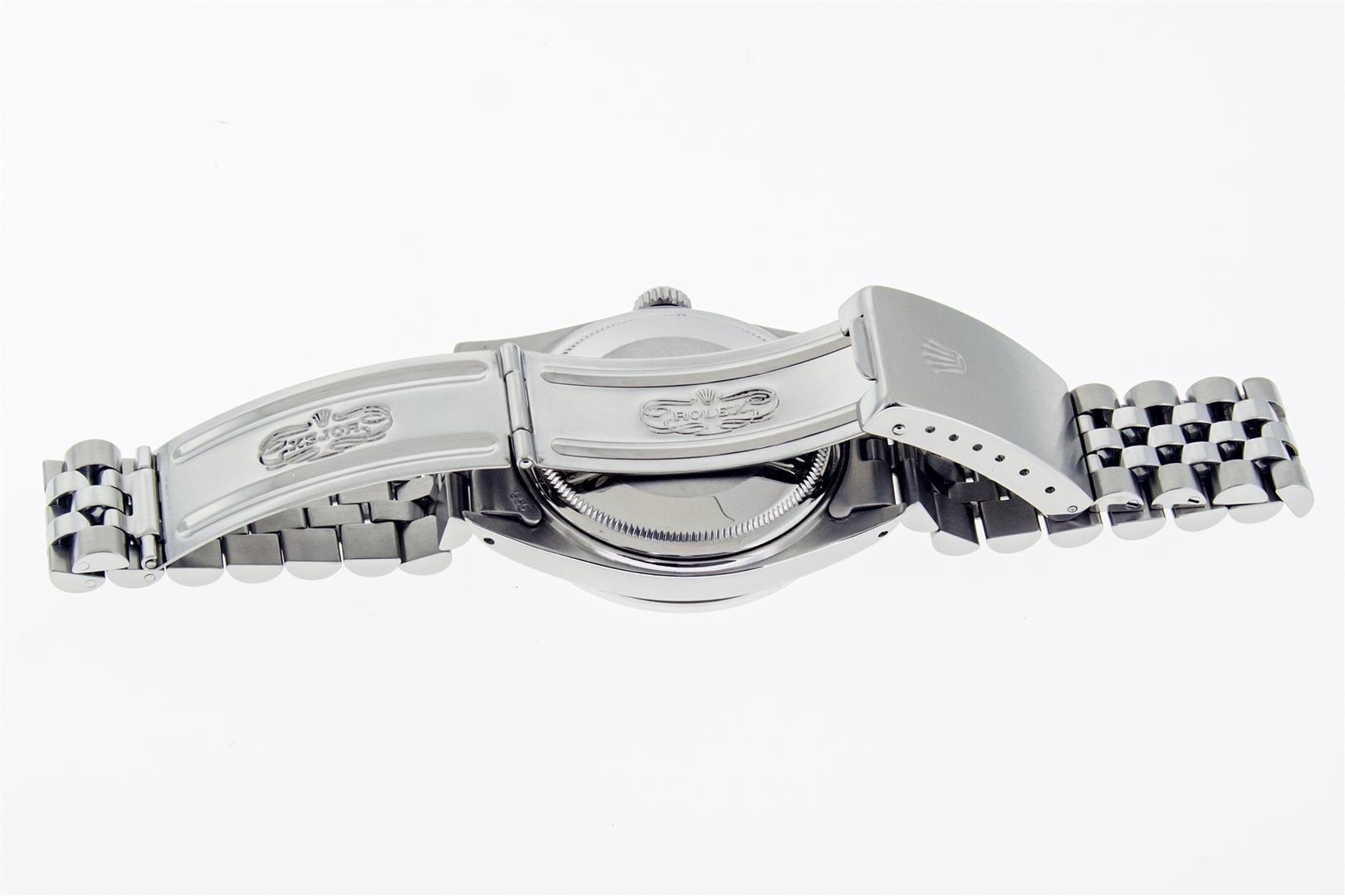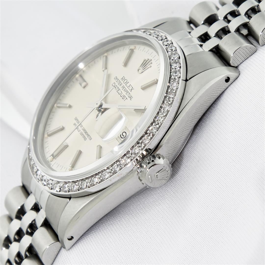 One Mens Pre Owned Rolex Datejust Polished Bright with Satin Finish, This Watch Has Been Serviced & Electronically Tested, Rolex Stainless Steel Case: 36mm, Rolex Stainless Steel Crown, Custom Bezel: New 18K White Gold Bead-set Diamond Bezel, Diamond Count: 44 Diamonds, Clarity: SI-VS, Color: G to H. Custom Crystal: New Sapphire With Date Window. Custom Hands: New Luminescent Hands. Rolex Movement: Automatic Winding Movement. Rolex Dial: Silver Index Dial With Dash Track And Lumi Dot. Date Window: 3 O'Clock Position Date Display, Quickset, Model: Datejust, Condition: G-6 Extra Fine. Rolex Bracelet: Stainless Steel Jubilee Band. Bracelet: 7.0 Inch Length, Adjustable. Standard Clasp, With Rolex Logo. This Watch Has Been Serviced Time Tested And Is In Excellent Condition It Is Free Of All Scratches And Dents.
