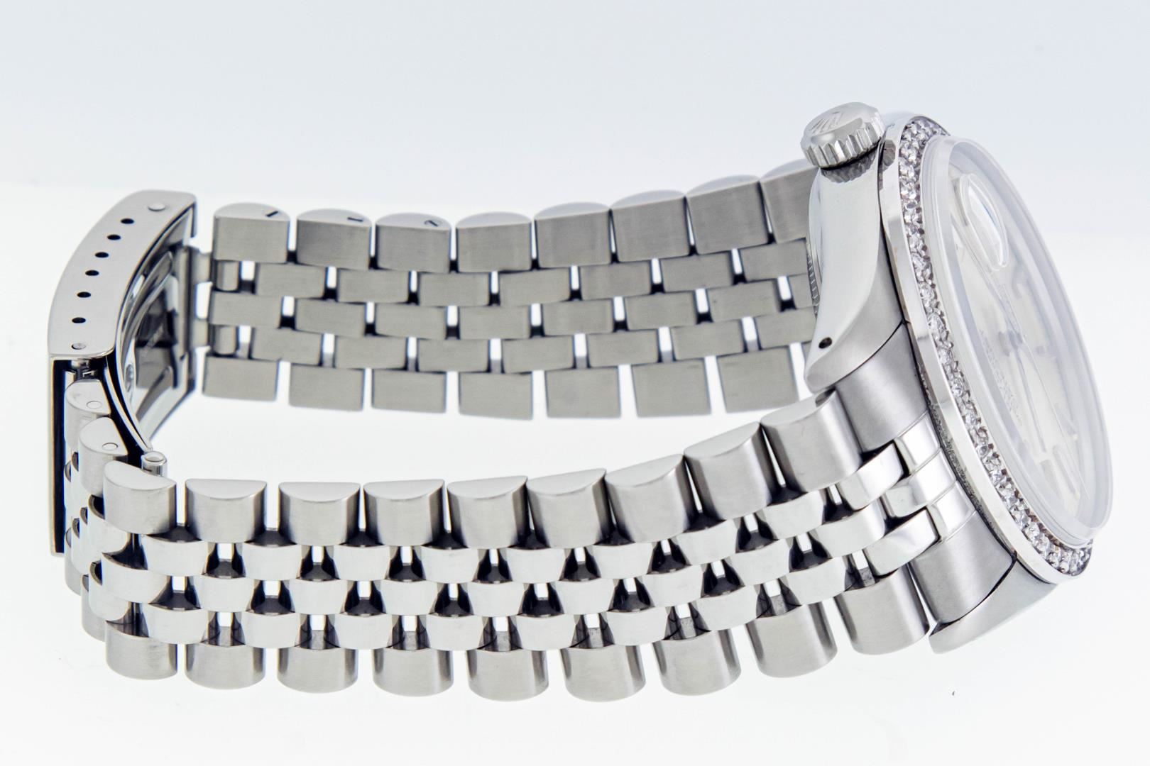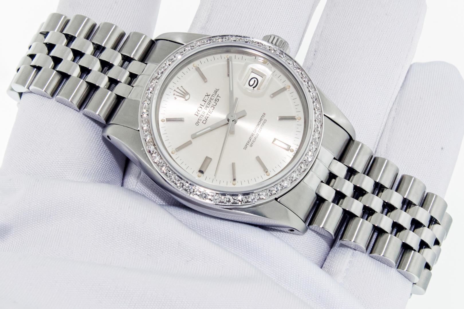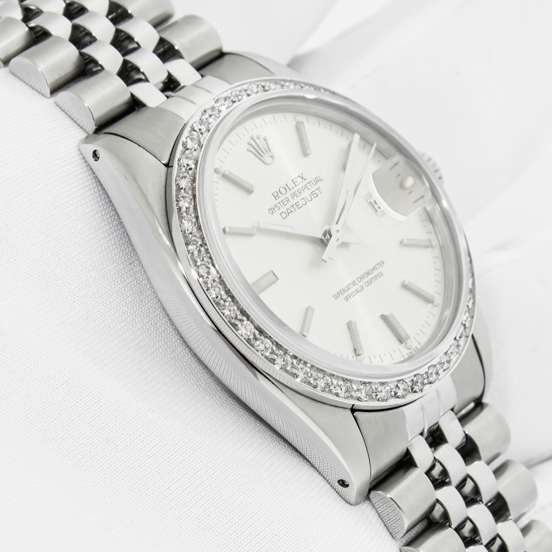 One Mens Pre Owned Rolex Datejust Polished Bright with Satin Finish, This Watch Has Been Serviced & Electronically Tested, Rolex Stainless Steel Case: 36mm, Rolex Stainless Steel Crown, Custom Bezel: New 18K White Gold Bead-set Diamond Bezel, Diamond Count: 44 Diamonds, Clarity: SI-VS, Color: G to H. Custom Crystal: New Sapphire With Date Window. Custom Hands: New Luminescent Hands. Rolex Movement: Automatic Winding Movement. Rolex Dial: Silver Index Dial With Dash Track And Lumi Dot. Date Window: 3 O'Clock Position Date Display, Quickset, Model: Datejust, Condition: G-6 Extra Fine. Rolex Bracelet: Stainless Steel Jubilee Band. Bracelet: 7.0 Inch Length, Adjustable. Standard Clasp, With Rolex Logo. This Watch Has Been Serviced Time Tested And Is In Excellent Condition It Is Free Of All Scratches And Dents.