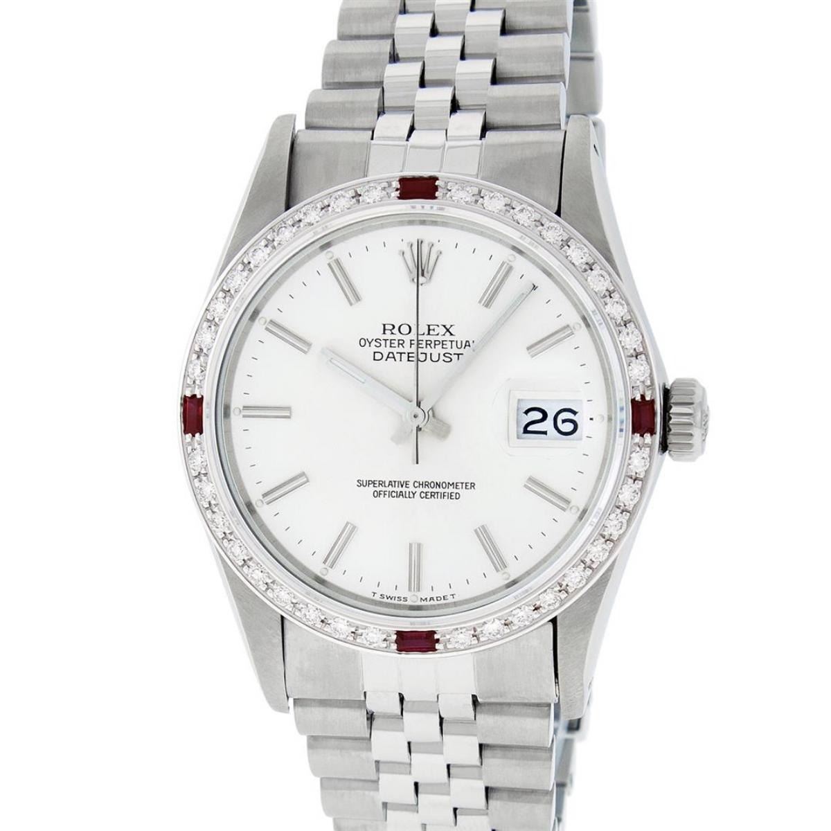 One Mens Stainless Steel Rolex Datejust Polished Bright with Satin Finish, This Watch Has Been Serviced & Electronically Tested, Stainless Steel Case: 36mm, Stainless Steel Crown, Custom Bezel: New 18K White Gold Ruby Beadset Diamond Bezel, Diamond + Gem Count:� 36 Diamonds + 4 Rubies, Total Weight 1.00 Carat, Clarity: SI-VS, Color: G to H. Custom Crystal: New Synthetic Sapphire Cyclops Lens. Custom Hands: New Luminescent Hands. Movement: Automatic Winding Movement Caliber 3035. Dial: Silver Index With Dash Track & Lumi Dots. Date Window: 3 O'Clock Position Date Display, Quickset, Model: Datejust, Condition: G-6 Extra Fine. Bracelet: Stainless Steel Jubilee. Bracelet: 7.0 Inch Length, Adjustable. Standard Clasp, With Rolex Logo. This Watch Has Been Serviced Time Tested And Is In Excellent Condition It Is Free Of All Scratches And Dents.