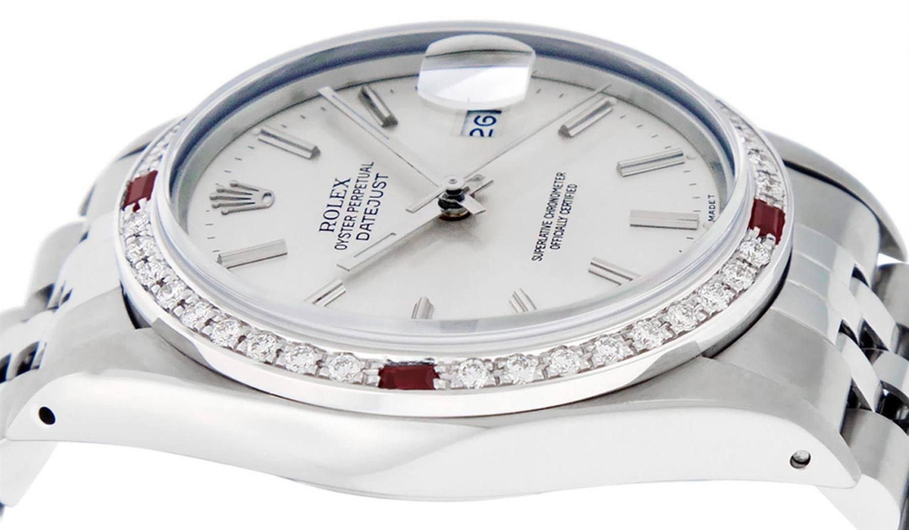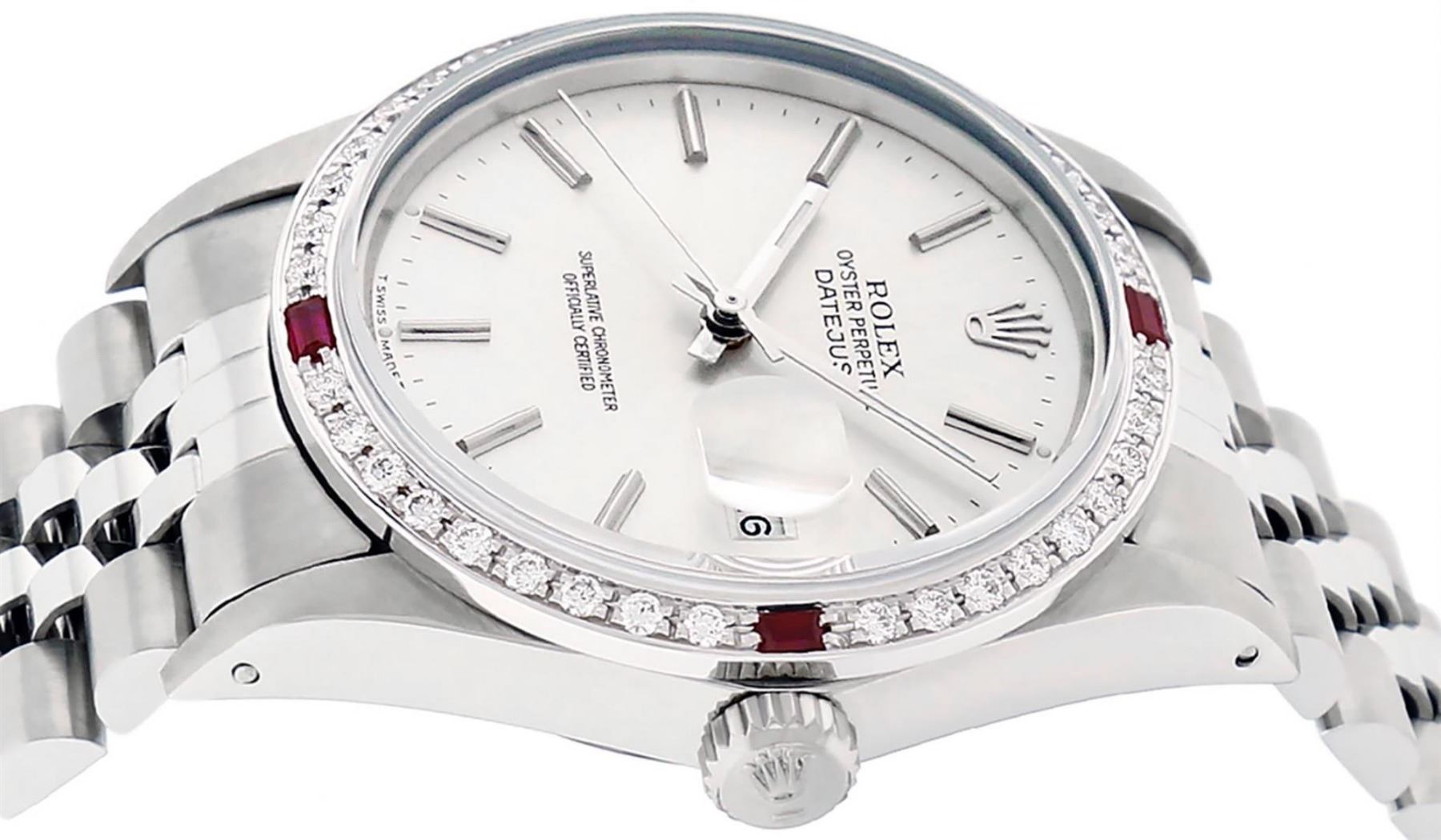 One Mens Stainless Steel Rolex Datejust Polished Bright with Satin Finish, This Watch Has Been Serviced & Electronically Tested, Stainless Steel Case: 36mm, Stainless Steel Crown, Custom Bezel: New 18K White Gold Ruby Beadset Diamond Bezel, Diamond + Gem Count: 36 Diamonds + 4 Rubies, Total Weight 1.00 Carat, Clarity: SI-VS, Color: G to H. Custom Crystal: New Synthetic Sapphire Cyclops Lens. Custom Hands: New Luminescent Hands. Movement: Automatic Winding Movement Caliber 3035. Dial: Silver Index With Dash Track & Lumi Dots. Date Window: 3 O'Clock Position Date Display, Quickset, Model: Datejust, Condition: G-6 Extra Fine. Bracelet: Stainless Steel Jubilee. Bracelet: 7.0 Inch Length, Adjustable. Standard Clasp, With Rolex Logo. This Watch Has Been Serviced Time Tested And Is In Excellent Condition It Is Free Of All Scratches And Dents.