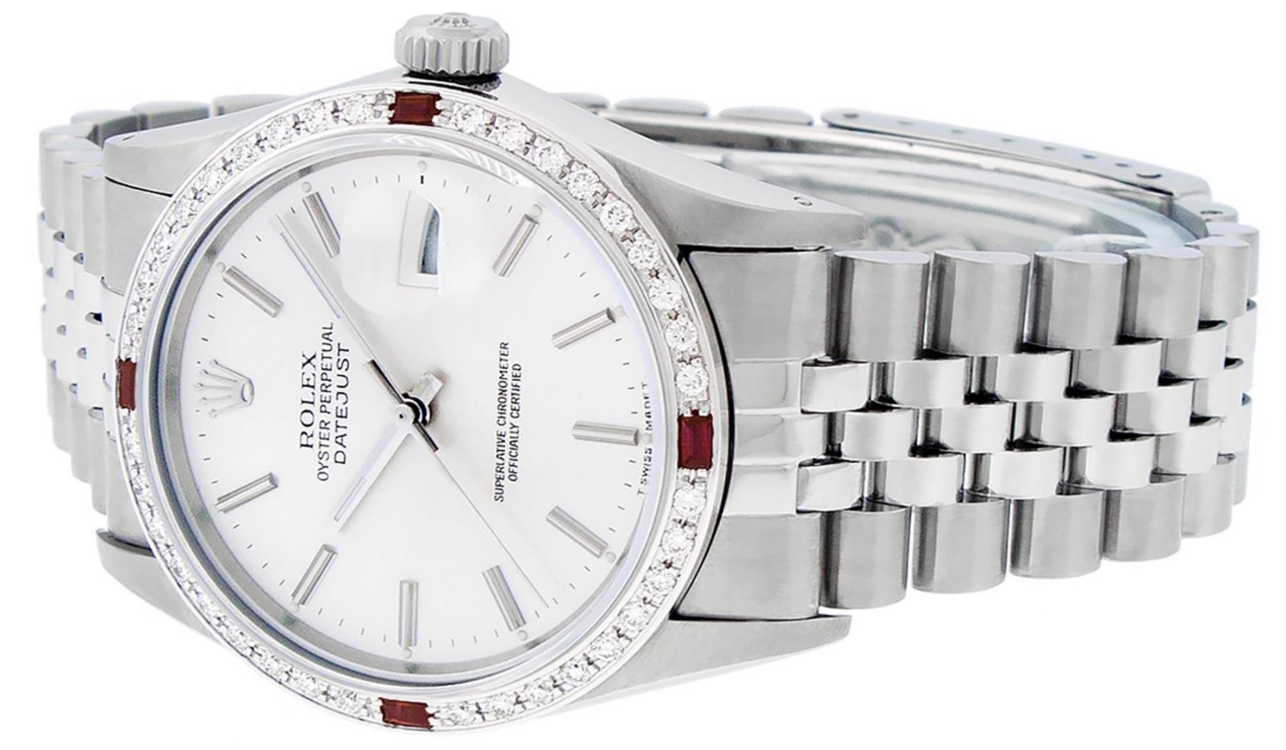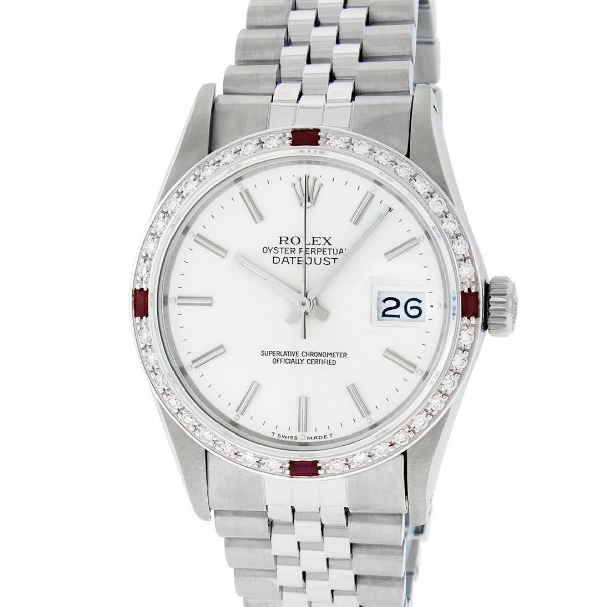 One Mens Stainless Steel Rolex Datejust Polished Bright with Satin Finish, This Watch Has Been Serviced & Electronically Tested, Stainless Steel Case: 36mm, Stainless Steel Crown, Custom Bezel: New 18K White Gold Ruby Beadset Diamond Bezel, Diamond + Gem Count: 36 Diamonds + 4 Rubies, Total Weight 1.00 Carat, Clarity: SI-VS, Color: G to H. Custom Crystal: New Synthetic Sapphire Cyclops Lens. Custom Hands: New Luminescent Hands. Movement: Automatic Winding Movement. Dial: Silver Index With Dash Track & Lumi Dots. Date Window: 3 O'Clock Position Date Display, Quickset, Model: Datejust, Condition: G-6 Extra Fine. Bracelet: Stainless Steel Jubilee. Bracelet: 7.0 Inch Length, Adjustable. Standard Clasp, With Rolex Logo. This Watch Has Been Serviced Time Tested And Is In Excellent Condition It Is Free Of All Scratches And Dents.