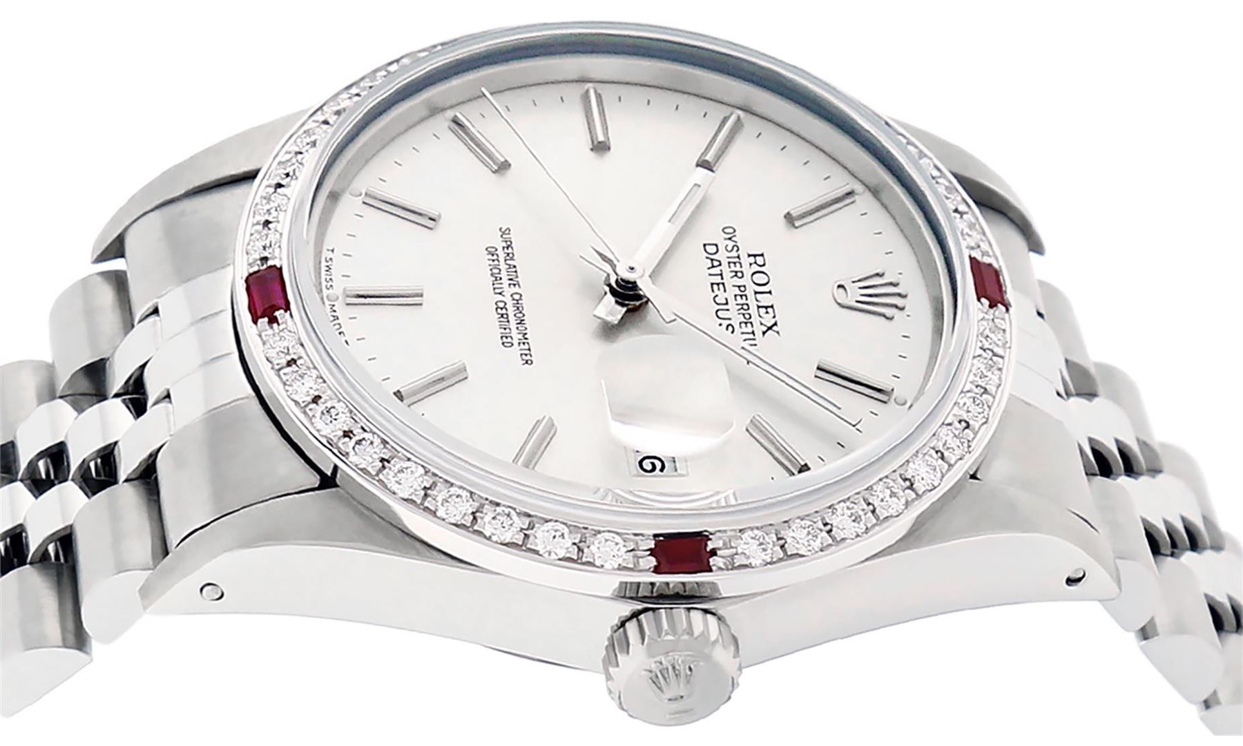 One Mens Pre Owned Stainless Steel Rolex Datejust Polished Bright with Satin Finish, This Watch Has Been Serviced & Electronically Tested, Rolex Stainless Steel Case: 36mm, Rolex Stainless Steel Crown, Custom Bezel: New 18K White Gold Ruby Beadset Diamond Bezel, Diamond + Gem Count: 36 Diamonds + 4 Rubies, Total Weight 1.00 Carat, Clarity: SI-VS, Color: G to H. Custom Crystal: New Sapphire With Magnified Date Window. Custom Hands: New Luminescent Hands. Rolex Movement: Automatic Winding Movement 3035. Rolex Dial: Silver Index With Dash Track & Lumi Dots. Date Window: 3 O'Clock Position Date Display, Quickset, Model: Datejust, Condition: G-6 Extra Fine. Rolex Bracelet: Stainless Steel Jubilee Band. Bracelet: 7.0 Inch Length, Adjustable. Standard Clasp, With Rolex Logo. This Watch Has Been Serviced Time Tested And Is In Excellent Condition It Is Free Of All Scratches And Dents.