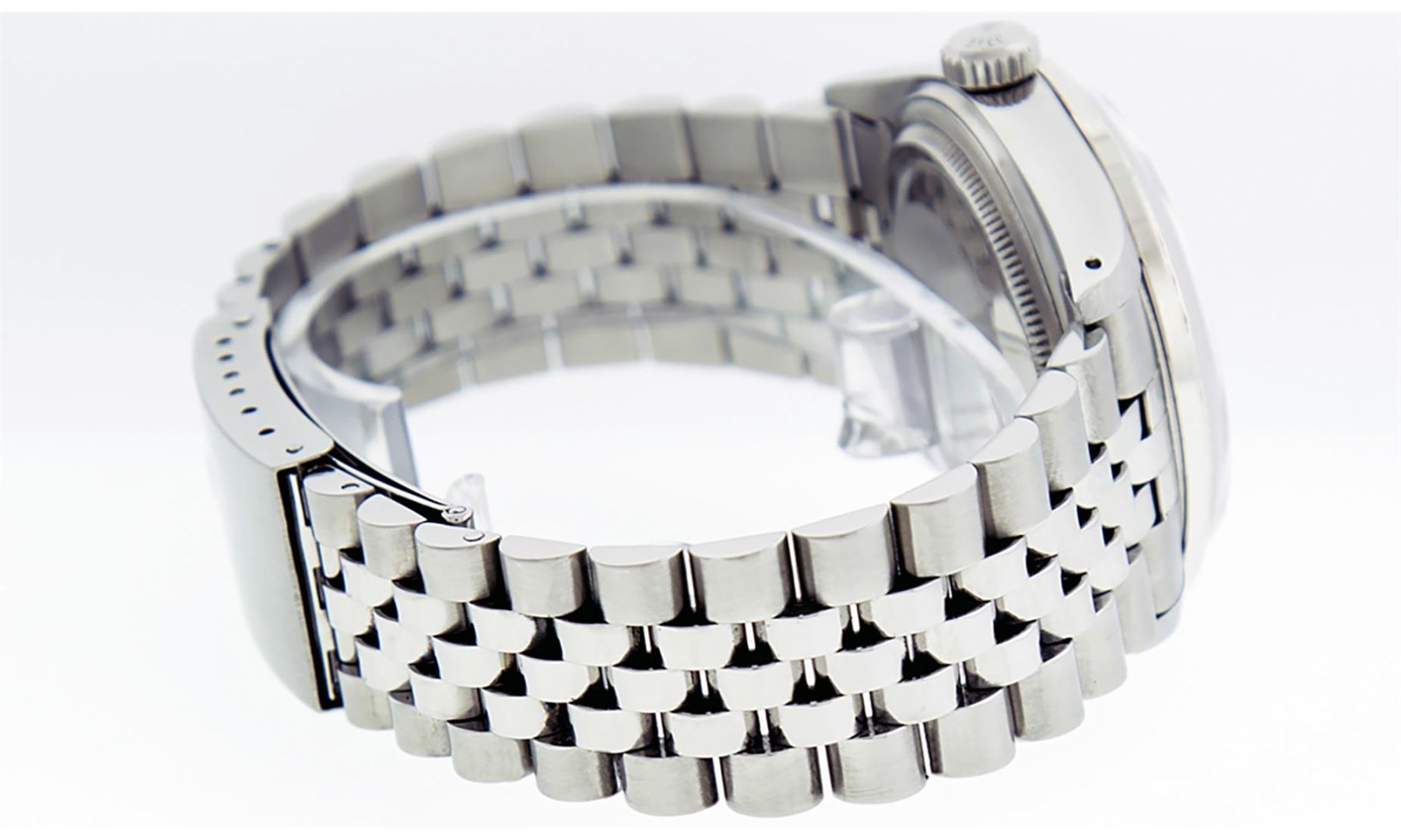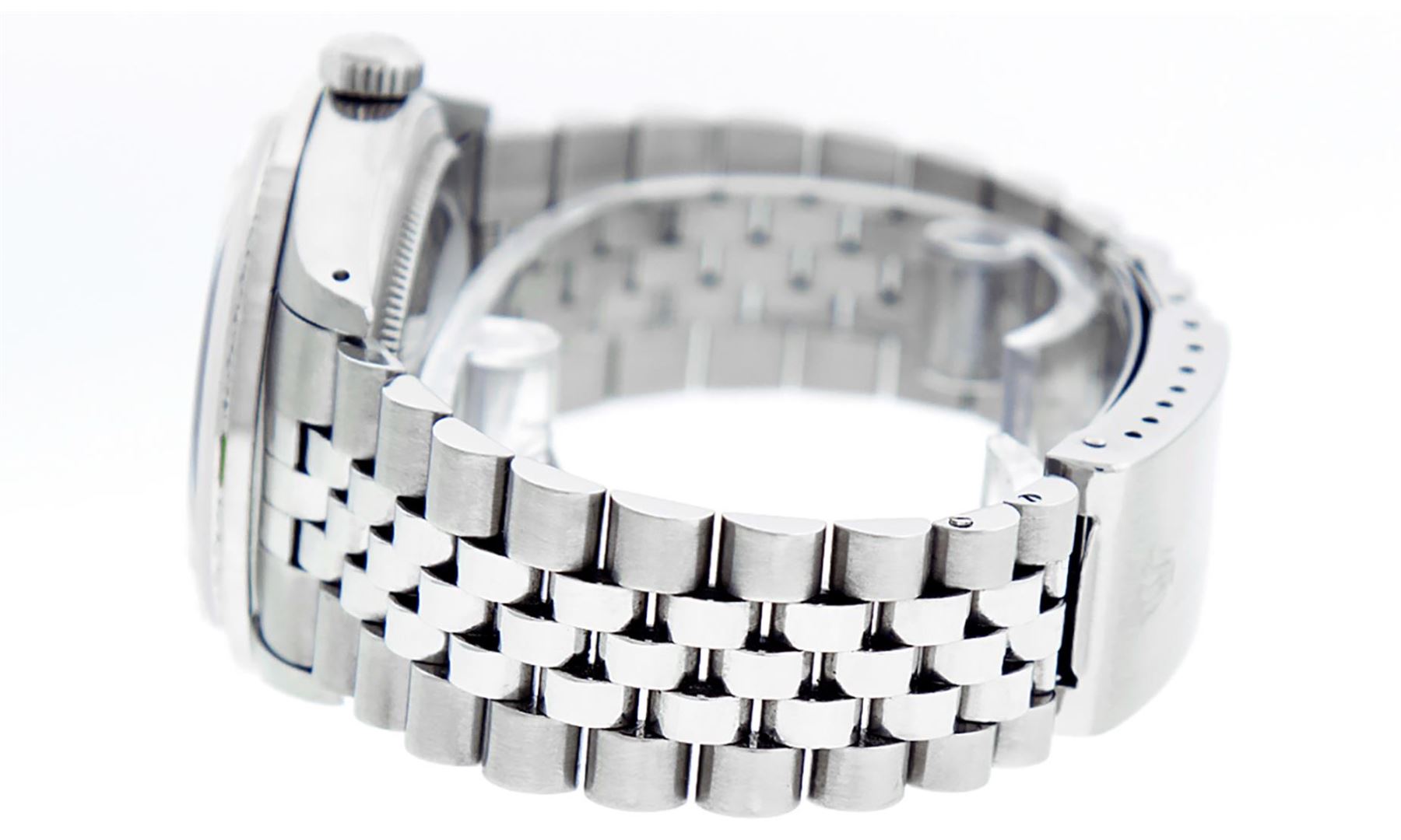 One Mens Pre Owned Stainless Steel Rolex Datejust Polished Bright with Satin Finish, This Watch Has Been Serviced & Electronically Tested, Rolex Stainless Steel Case: 36mm, Rolex Stainless Steel Crown, Custom Bezel: New 18K White Gold Emerald Beadset Diamond Bezel, Diamond + Gem Count: 36 Diamonds + 4 Emeralds, Total Weight 1.00 Carat, Clarity: SI-VS, Color: G to H. Custom Crystal: New Sapphire With Date Window. Custom Hands: New Luminescent Hands. Rolex Movement: Automatic Winding Movement 3035. Rolex Dial: Silver Index With Dash Track & Lumi Dots. Date Window: 3 O'Clock Position Date Display, Quickset, Model: Datejust, Condition: G-6 Extra Fine. Rolex Bracelet: Stainless Steel Jubilee Band. Bracelet: 7.0 Inch Length, Adjustable. Standard Clasp, With Rolex Logo. This Watch Has Been Serviced Time Tested And Is In Excellent Condition It Is Free Of All Scratches And Dents.