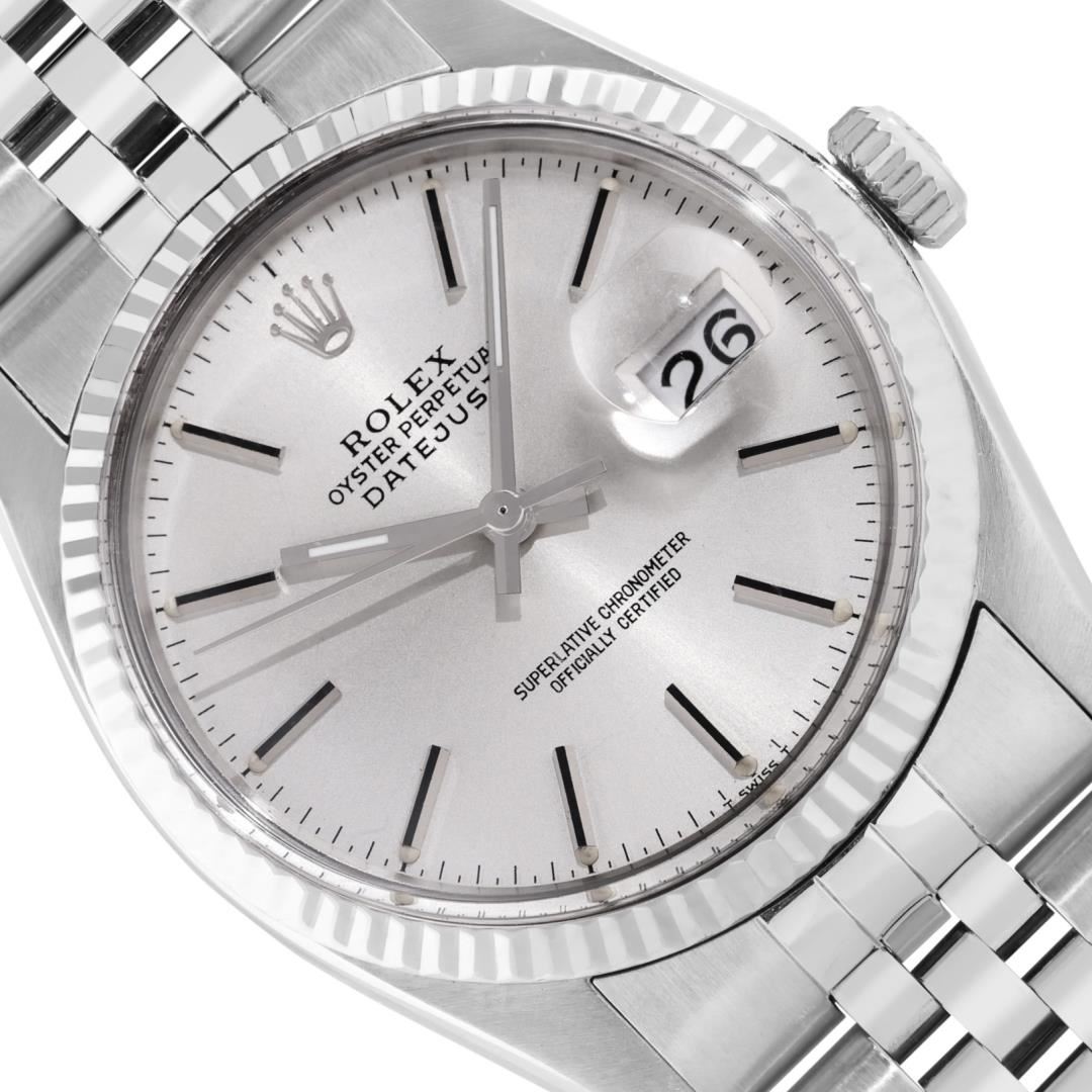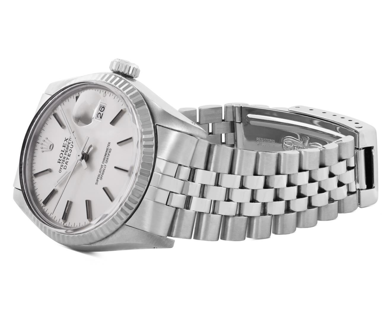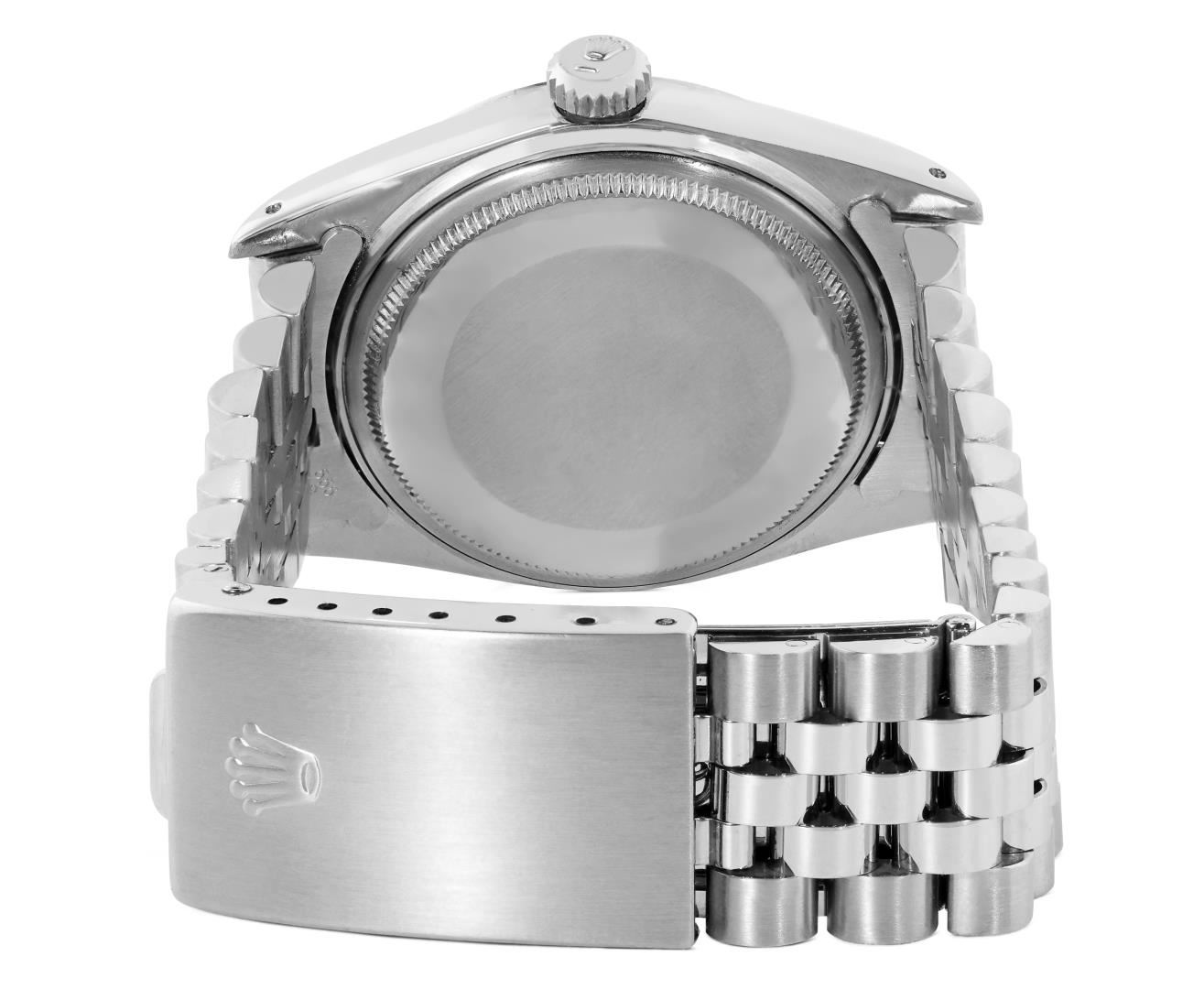 One Mens Pre Owned Rolex Stainless Steel Datejust Polished Bright with Satin Finish, Serviced And Electronically Tested, Rolex Stainless Steel Case: 36mm, Rolex Stainless Steel Crown, Rolex Bezel: 18K White Gold Fluted Bezel. Custom Crystal: New Acrylic Crystal With Magnifying Date Window. Rolex Movement: Automatic Winding Movement Caliber 3035. Rolex Dial: Silver Index With Dash Track and Lumi Dots. Hands: White Lumi Hands. Date Window: 3 O'Clock Position Date Display, Quickset, Model: Quickset Datejust. Condition: G-6 Extra Fine. Rolex Bracelet: Stainless Steel Jubilee Band. Bright Polish & Satin Finish. 7.0 Inch Length, Adjustable. Standard Clasp, With Rolex Logo. This Watch Has Been Serviced Time Tested And Is In Excellent Condition It Is Free Of All Scratches And Dents.