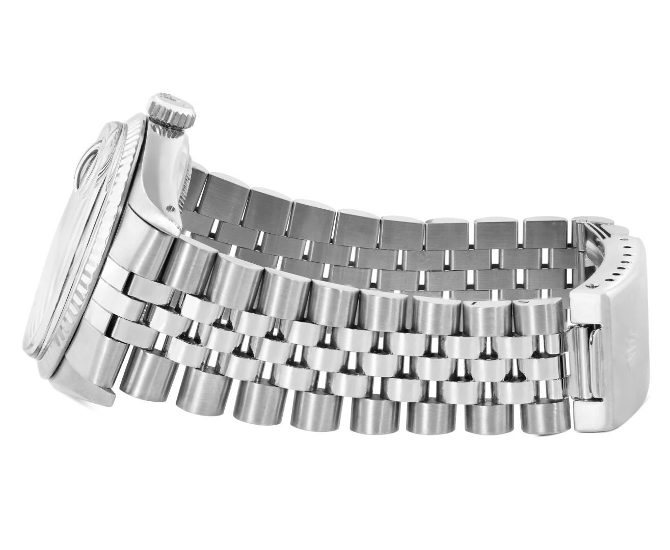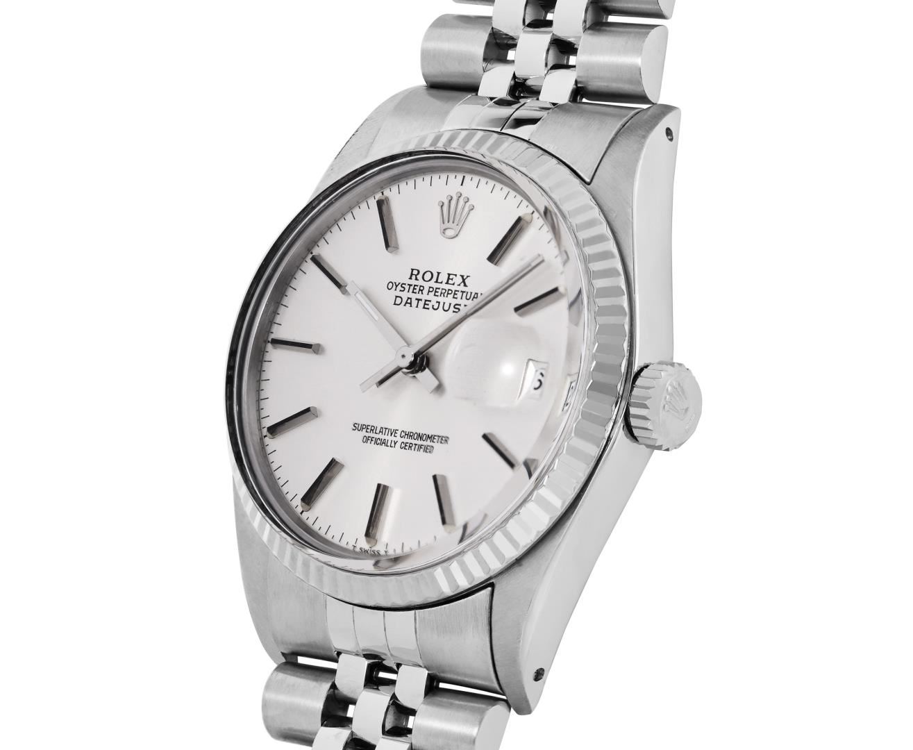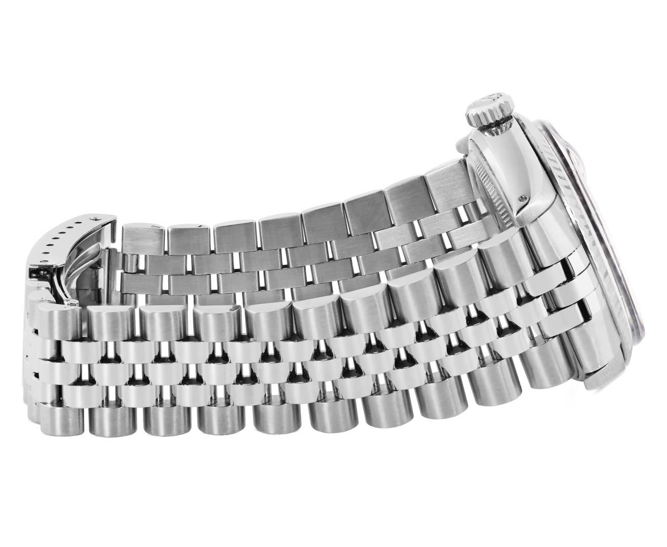 One Mens Pre Owned Rolex Stainless Steel Datejust Polished Bright with Satin Finish, Serviced And Electronically Tested, Rolex Stainless Steel Case: 36mm, Rolex Stainless Steel Crown, Rolex Bezel: 18K White Gold Fluted Bezel. Custom Crystal: New Acrylic Crystal With Magnifying Date Window. Rolex Movement: Automatic Winding Movement Caliber 3035. Rolex Dial: Silver Index With Dash Track and Lumi Dots. Hands: White Lumi Hands. Date Window: 3 O'Clock Position Date Display, Quickset, Model: Quickset Datejust. Condition: G-6 Extra Fine. Rolex Bracelet: Stainless Steel Jubilee Band. Bright Polish & Satin Finish. 7.0 Inch Length, Adjustable. Standard Clasp, With Rolex Logo. This Watch Has Been Serviced Time Tested And Is In Excellent Condition It Is Free Of All Scratches And Dents.