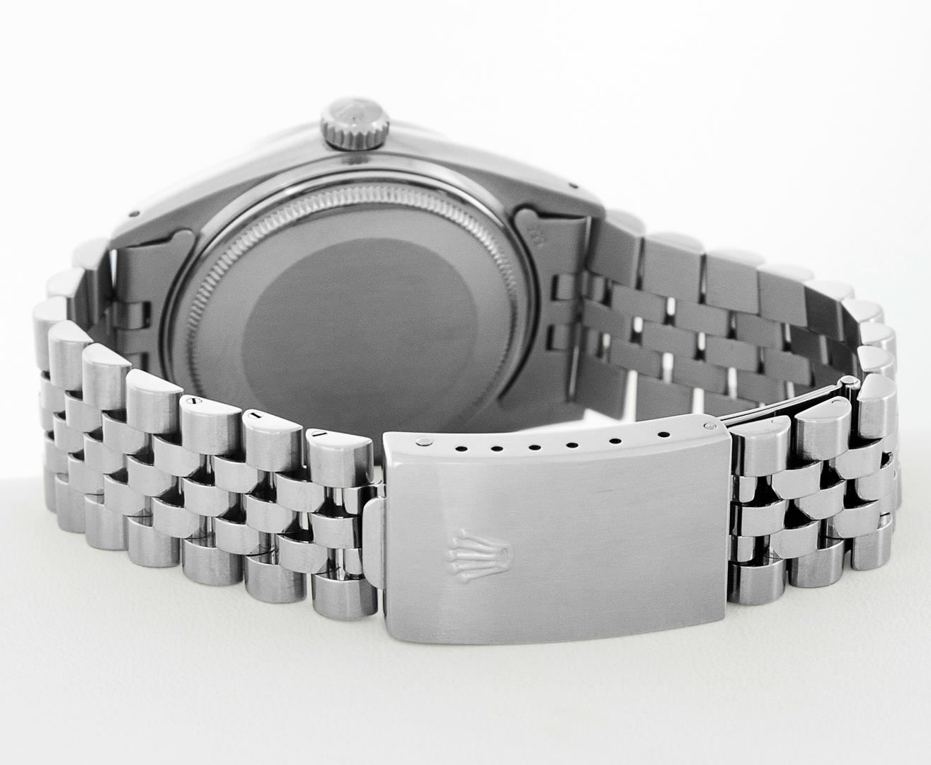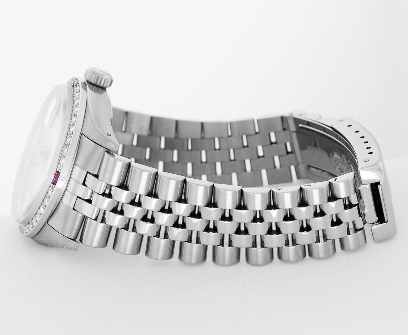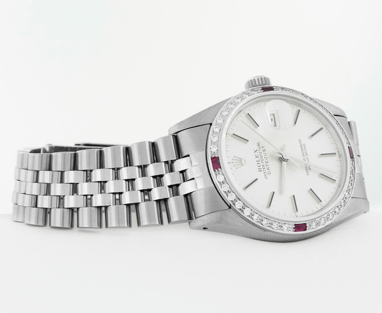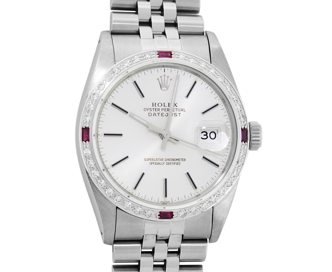 One Mens Pre Owned Stainless Steel Rolex Datejust Polished Bright with Satin Finish, This Watch Has Been Serviced & Electronically Tested, Rolex Stainless Steel Case: 36mm, Rolex Stainless Steel Crown, Custom Bezel: New 18K White Gold Ruby Beadset Diamond Bezel, Diamond + Gem Count: 36 Diamonds + 4 Rubies, Total Weight 1.00 Carat, Clarity: SI-VS, Color: G to H. Custom Crystal: New Sapphire With Magnified Date Window. Custom Hands: New Luminescent Hands. Rolex Movement: Automatic Winding Movement 3035. Rolex Dial: Silver Index With Dash Track & Lumi Dots. Date Window: 3 O'Clock Position Date Display, Quickset, Model: Datejust, Condition: G-6 Extra Fine. Rolex Bracelet: Stainless Steel Jubilee Band. Bracelet: 7.0 Inch Length, Adjustable. Standard Clasp, With Rolex Logo. This Watch Has Been Serviced Time Tested And Is In Excellent Condition It Is Free Of All Scratches And Dents.