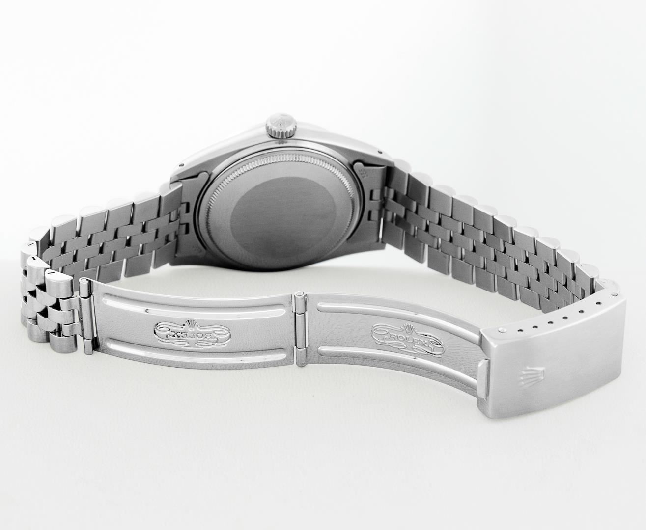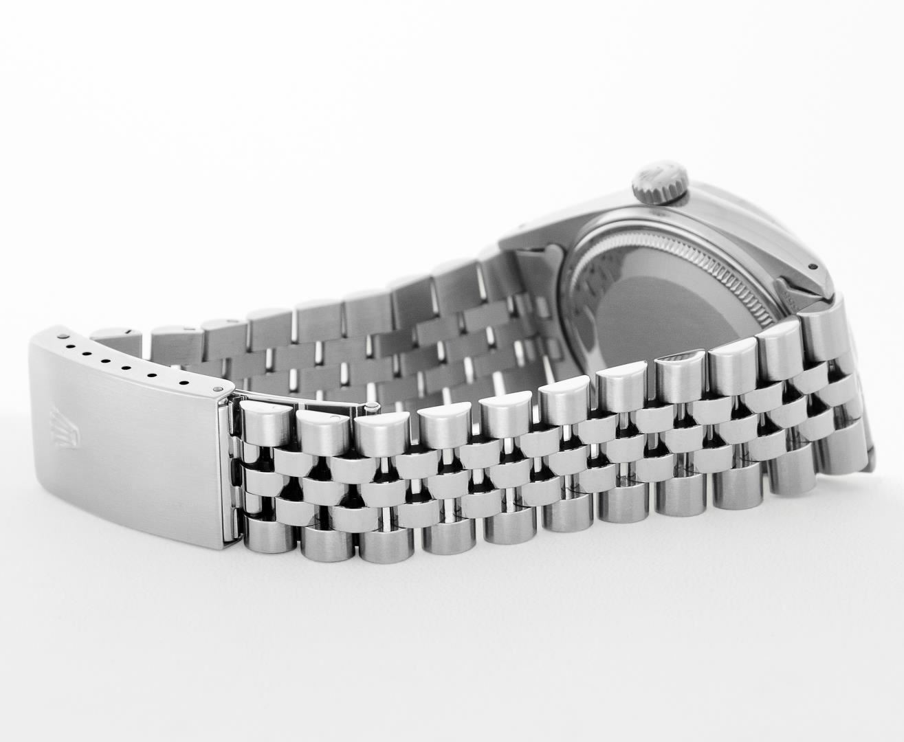 One Mens Pre Owned Stainless Steel Rolex Datejust Polished Bright with Satin Finish, This Watch Has Been Serviced & Electronically Tested, Rolex Stainless Steel Case: 36mm, Rolex Stainless Steel Crown, Custom Bezel: New 18K White Gold Ruby Beadset Diamond Bezel, Diamond + Gem Count: 36 Diamonds + 4 Rubies, Total Weight 1.00 Carat, Clarity: SI-VS, Color: G to H. Custom Crystal: New Sapphire With Magnified Date Window. Custom Hands: New Luminescent Hands. Rolex Movement: Automatic Winding Movement 3035. Rolex Dial: Silver Index With Dash Track & Lumi Dots. Date Window: 3 O'Clock Position Date Display, Quickset, Model: Datejust, Condition: G-6 Extra Fine. Rolex Bracelet: Stainless Steel Jubilee Band. Bracelet: 7.0 Inch Length, Adjustable. Standard Clasp, With Rolex Logo. This Watch Has Been Serviced Time Tested And Is In Excellent Condition It Is Free Of All Scratches And Dents.