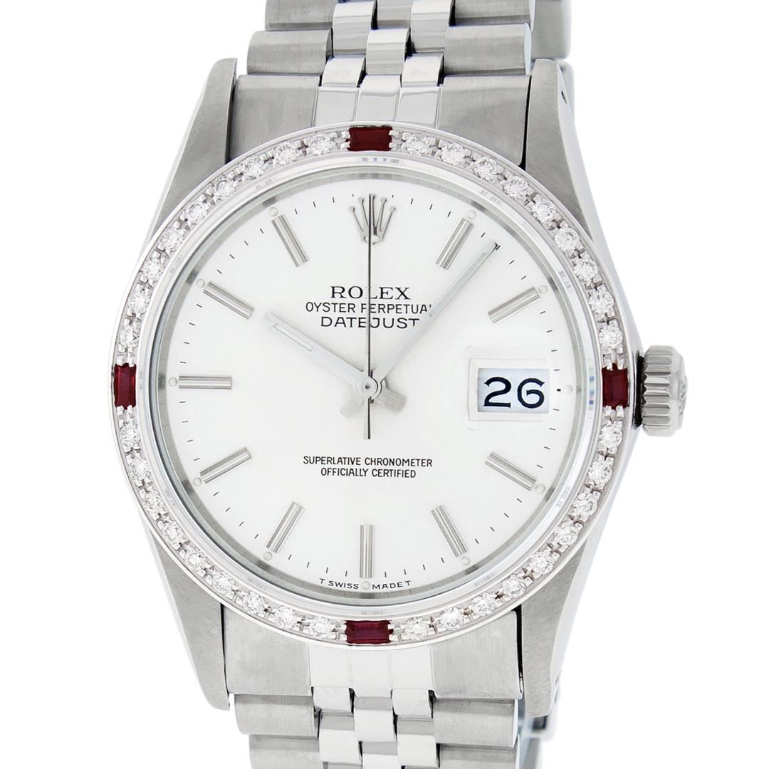 One Mens Pre Owned Stainless Steel Rolex Datejust Polished Bright with Satin Finish, This Watch Has Been Serviced & Electronically Tested, Rolex Stainless Steel Case: 36mm, Rolex Stainless Steel Crown, Custom Bezel: New 18K White Gold Ruby Beadset Diamond Bezel, Diamond + Gem Count: 36 Diamonds + 4 Rubies, Total Weight 1.00 Carat, Clarity: SI-VS, Color: G to H. Custom Crystal: New Sapphire With Magnified Date Window. Custom Hands: New Luminescent Hands. Rolex Movement: Automatic Winding Movement 3035. Rolex Dial: Silver Index With Dash Track & Lumi Dots. Date Window: 3 O'Clock Position Date Display, Quickset, Model: Datejust, Condition: G-6 Extra Fine. Rolex Bracelet: Stainless Steel Jubilee Band. Bracelet: 7.0 Inch Length, Adjustable. Standard Clasp, With Rolex Logo. This Watch Has Been Serviced Time Tested And Is In Excellent Condition It Is Free Of All Scratches And Dents.