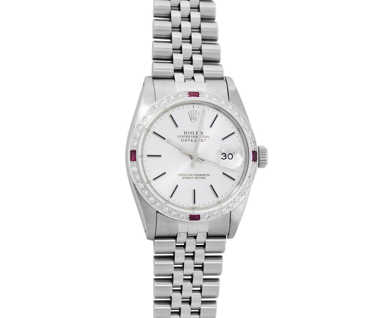 One Mens Pre Owned Stainless Steel Rolex Datejust Polished Bright with Satin Finish, This Watch Has Been Serviced & Electronically Tested, Rolex Stainless Steel Case: 36mm, Rolex Stainless Steel Crown, Custom Bezel: New 18K White Gold Ruby Beadset Diamond Bezel, Diamond + Gem Count: 36 Diamonds + 4 Rubies, Total Weight 1.00 Carat, Clarity: SI-VS, Color: G to H. Custom Crystal: New Sapphire With Magnified Date Window. Custom Hands: New Luminescent Hands. Rolex Movement: Automatic Winding Movement 3035. Rolex Dial: Silver Index With Dash Track & Lumi Dots. Date Window: 3 O'Clock Position Date Display, Quickset, Model: Datejust, Condition: G-6 Extra Fine. Rolex Bracelet: Stainless Steel Jubilee Band. Bracelet: 7.0 Inch Length, Adjustable. Standard Clasp, With Rolex Logo. This Watch Has Been Serviced Time Tested And Is In Excellent Condition It Is Free Of All Scratches And Dents.