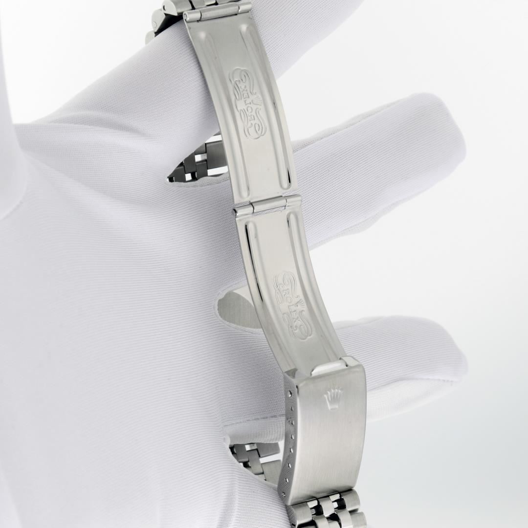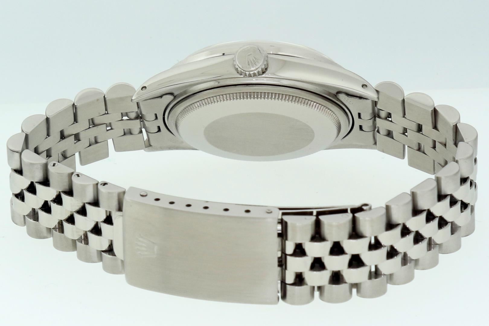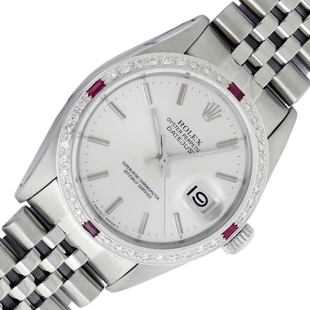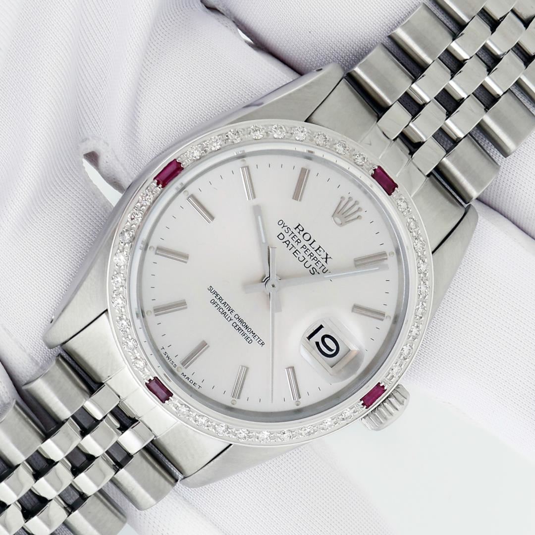 One Mens Pre Owned Rolex Datejust Polished Bright with Satin Finish, This Watch Has Been Serviced & Electronically Tested, Rolex Stainless Steel Case: 36mm, Rolex Stainless Steel Crown, Custom Bezel: New 18K White Gold Ruby Beadset Diamond Bezel, Diamond + Gem Count: 36 Diamonds + 4 Rubies, Clarity: SI-VS, Color: G to H. Custom Crystal: New Sapphire With Date Window. Custom Hands: New Luminescent Hands. Rolex Movement: Automatic Winding Movement. Rolex Dial: Silver Index Dial. Date Window: 3 O'Clock Position Date Display, Quickset, Model: Datejust, Condition: G-6 Extra Fine. Rolex Bracelet: Stainless Steel Jubilee Band. Bracelet: 7.0 Inch Length, Adjustable. Standard Clasp, With Rolex Logo. This Watch Has Been Serviced Time Tested And Is In Excellent Condition It Is Free Of All Scratches And Dents.