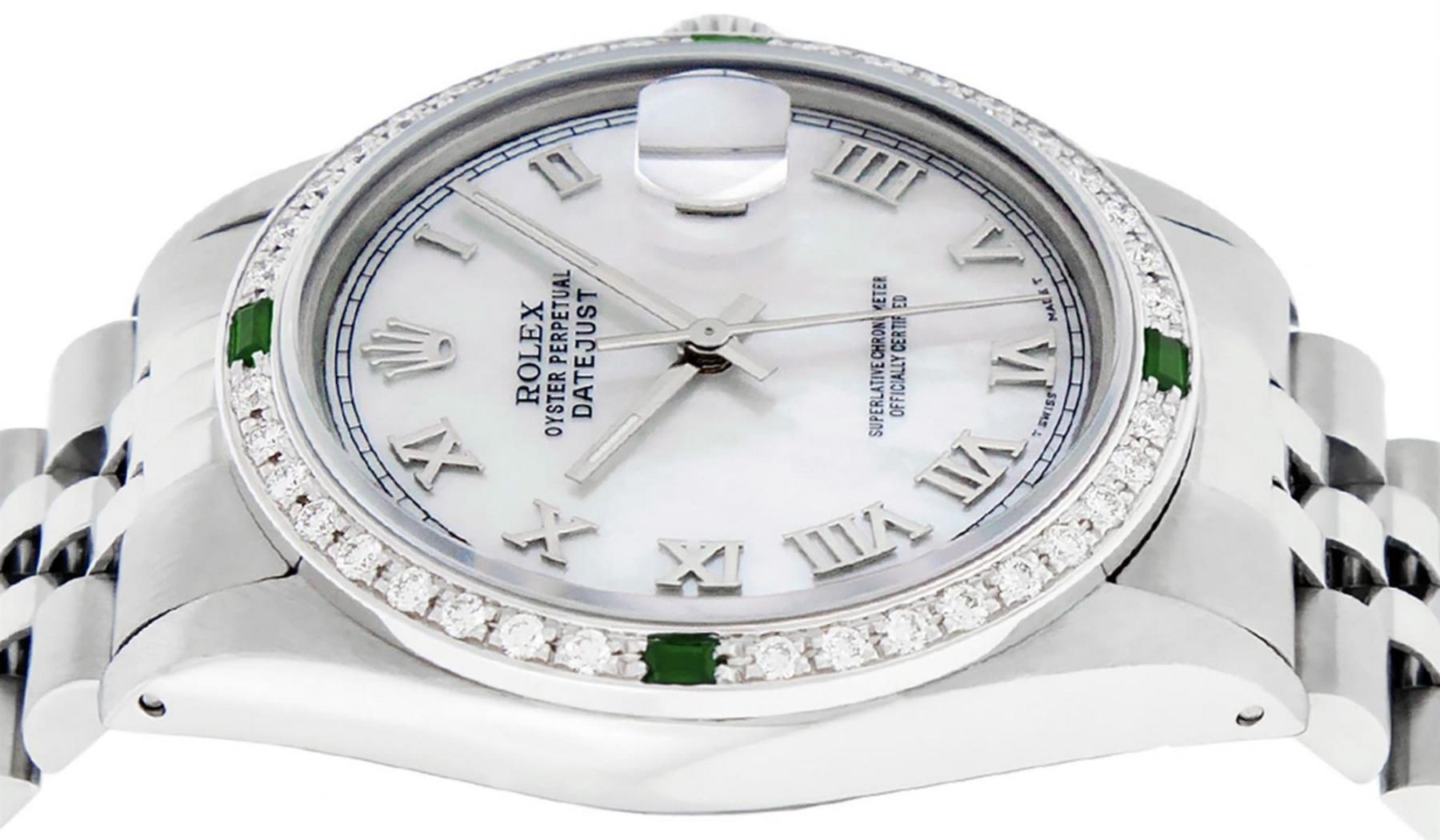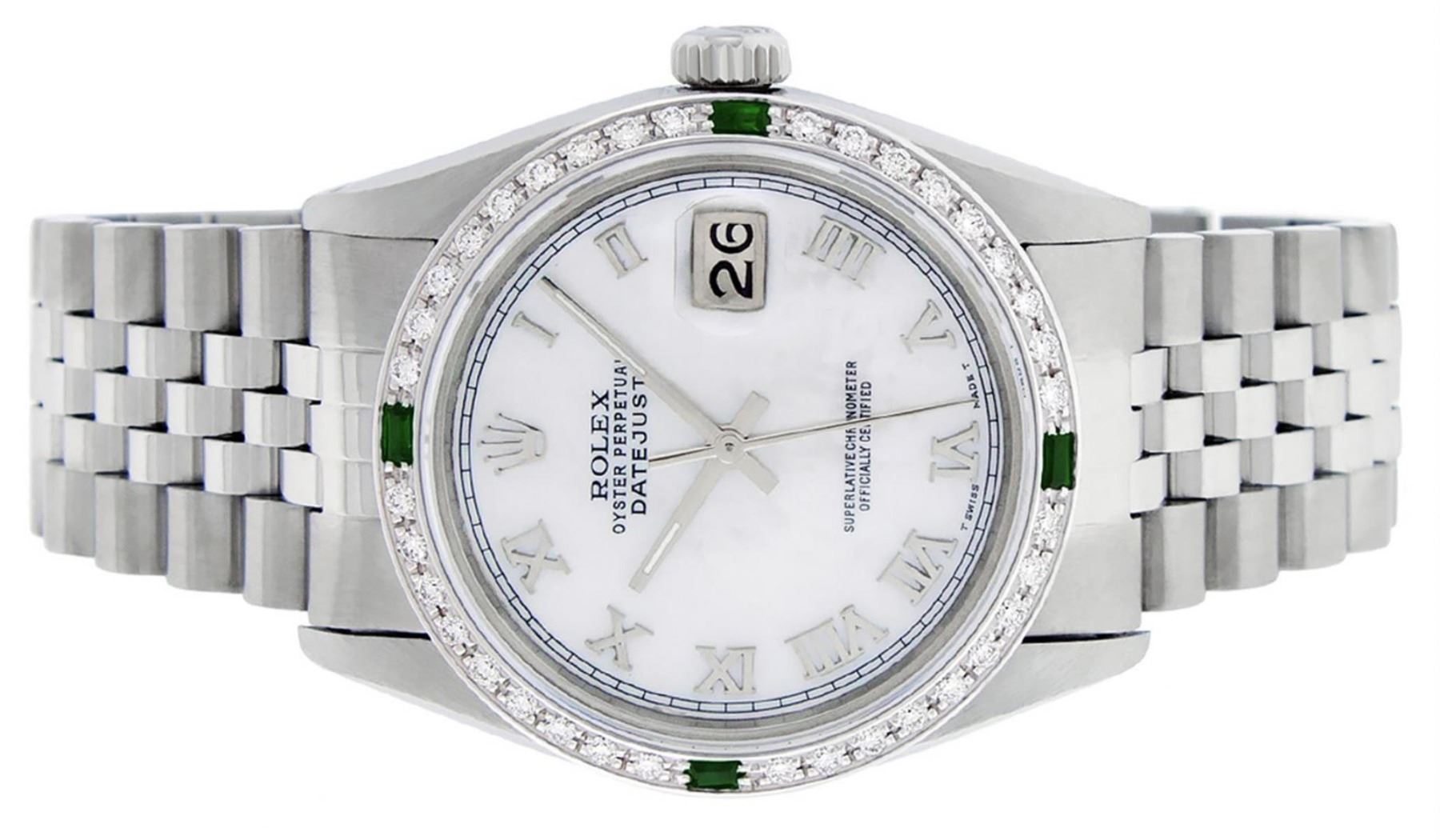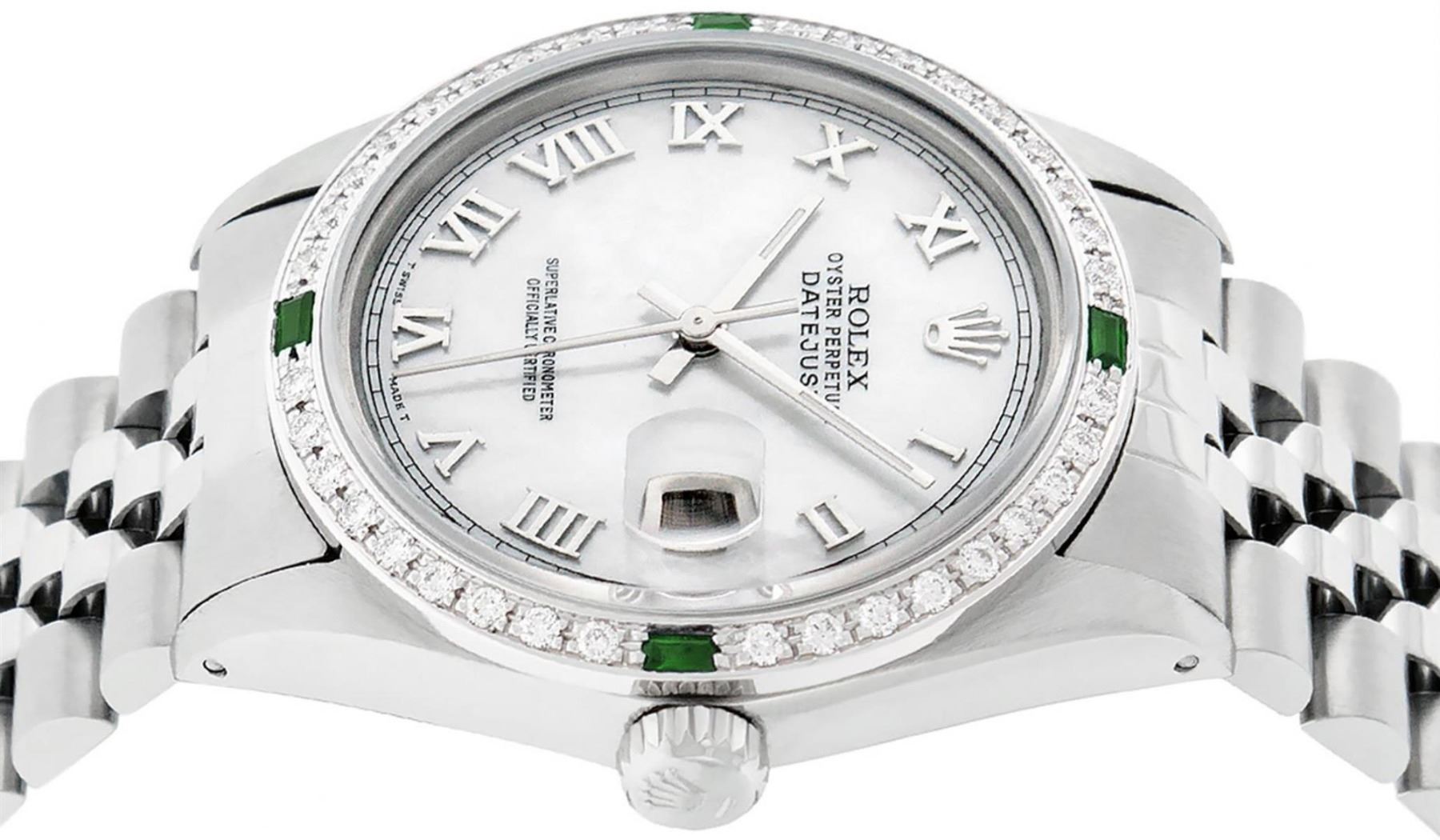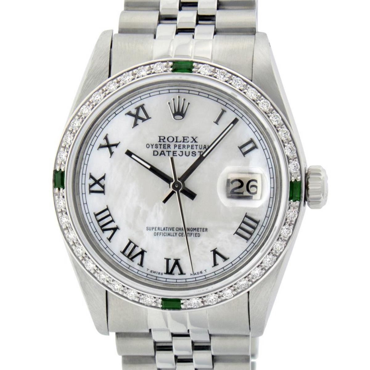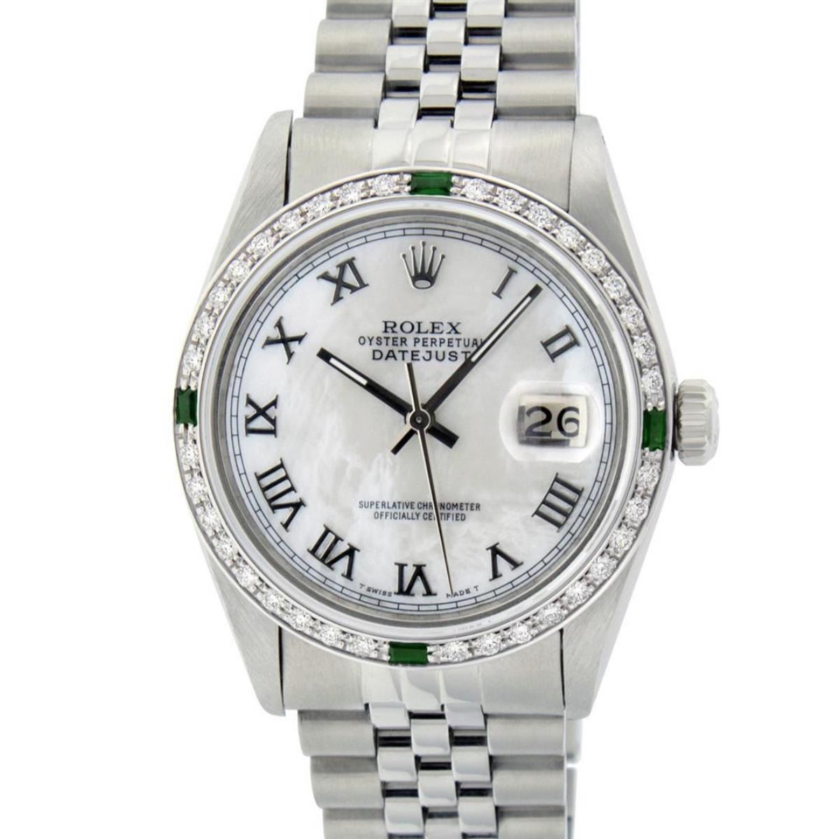 One Mens Stainless Steel Rolex Datejust Polished Bright with Satin Finish, This Watch Has Been Serviced & Electronically Tested, Stainless Steel Case: 36mm, Stainless Steel Crown, Custom Bezel: New 18K White Gold Emerald Beadset Diamond Bezel, Diamond + Gem Count:� 36 Diamonds + 4 Emeralds, Total Weight 1.00 Carat, Clarity: SI-VS, Color: G to H. Custom Crystal: New Scratch Resistant Synthetic Sapphire Cyclops Lens. Custom Hands: New Luminescent Hands. Movement: Automatic Winding Movement Caliber 3035. Custom Dial: Mother Of Pearl With Roman Track. Date Window: 3 O'Clock Position Date Display, Quickset, Model: Datejust, Condition: G-6 Extra Fine. Bracelet: Stainless Steel Jubilee. Bracelet: 7.0 Inch Length, Adjustable. Standard Clasp, With Rolex Logo. This Watch Has Been Serviced Time Tested And Is In Excellent Condition It Is Free Of All Scratches And Dents.