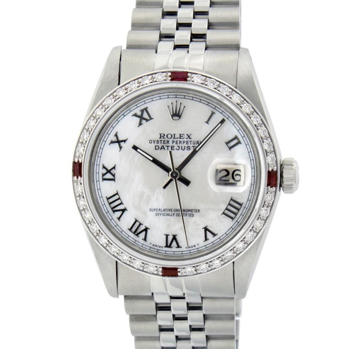 One Mens Stainless Steel Rolex Datejust Polished Bright with Satin Finish, This Watch Has Been Serviced & Electronically Tested, Stainless Steel Case: 36mm, Stainless Steel Crown, Custom Bezel: New 18K White Gold Ruby Beadset Diamond Bezel, Diamond + Gem Count: 36 Diamonds + 4 Rubies, Total Weight 1.00 Carat, Clarity: SI-VS, Color: G to H. Custom Crystal: New Scratch Resistant Synthetic Sapphire Cyclops Lens. Custom Hands: New Luminescent Hands. Movement: Automatic Winding Movement Caliber 3035. Dial: Mother Of Pearl With Roman Track. Date Window: 3 O'Clock Position Date Display, Quickset, Model: Datejust, Condition: G-6 Extra Fine. Bracelet: Stainless Steel Jubilee. Bracelet: 7.0 Inch Length, Adjustable. Standard Clasp, With Rolex Logo. This Watch Has Been Serviced Time Tested And Is In Excellent Condition It Is Free Of All Scratches And Dents.