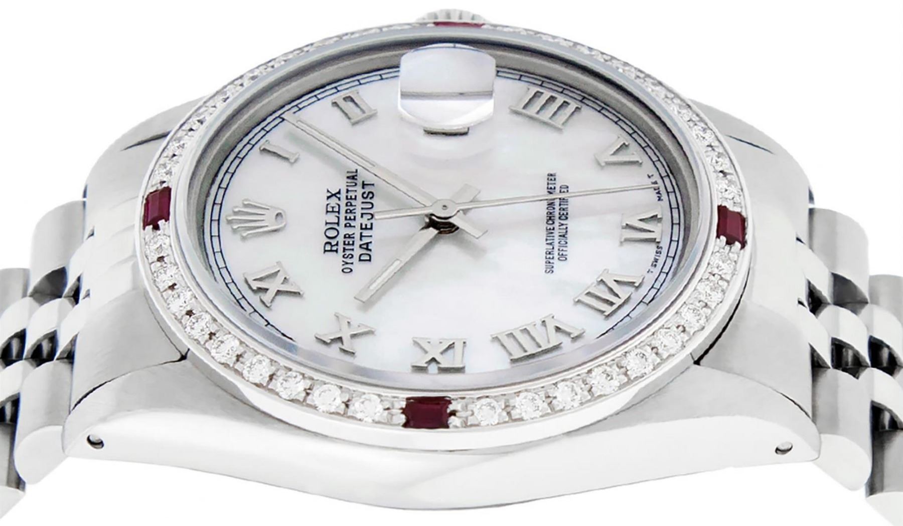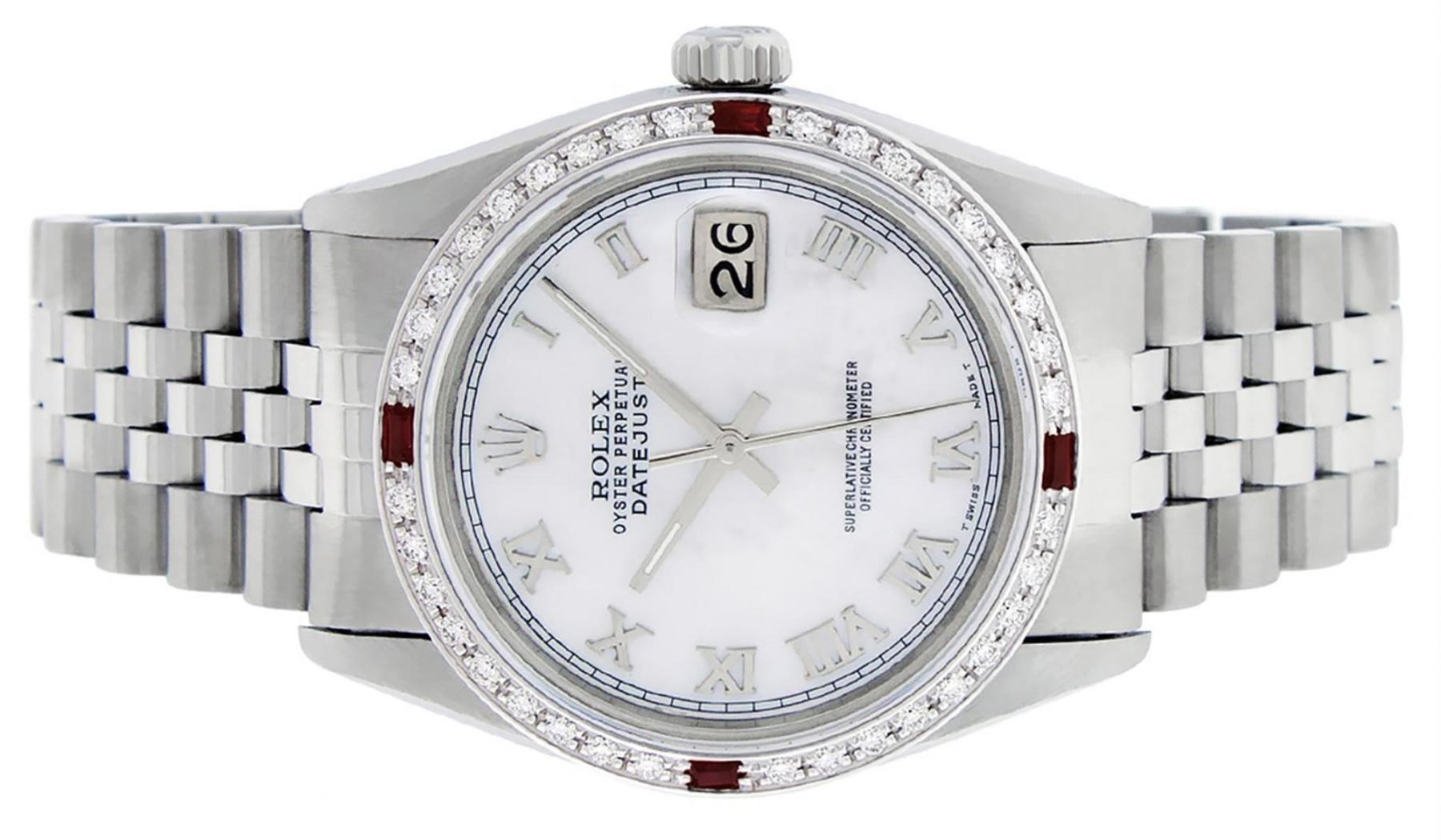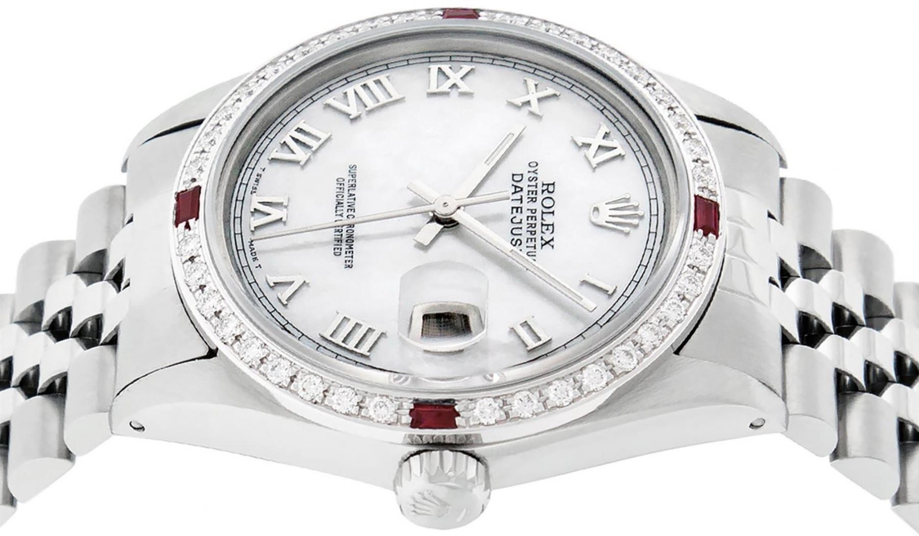 One Mens Stainless Steel Rolex Datejust Polished Bright with Satin Finish, This Watch Has Been Serviced & Electronically Tested, Stainless Steel Case: 36mm, Stainless Steel Crown, Custom Bezel: New 18K White Gold Ruby Beadset Diamond Bezel, Diamond + Gem Count: 36 Diamonds + 4 Rubies, Total Weight 1.00 Carat, Clarity: SI-VS, Color: G to H. Custom Crystal: New Scratch Resistant Synthetic Sapphire Cyclops Lens. Custom Hands: New Luminescent Hands. Movement: Automatic Winding Movement. Dial: Mother Of Pearl With Roman Track. Date Window: 3 O'Clock Position Date Display, Quickset, Model: Datejust, Condition: G-6 Extra Fine. Bracelet: Stainless Steel Jubilee. Bracelet: 7.0 Inch Length, Adjustable. Standard Clasp, With Rolex Logo. This Watch Has Been Serviced Time Tested And Is In Excellent Condition It Is Free Of All Scratches And Dents.