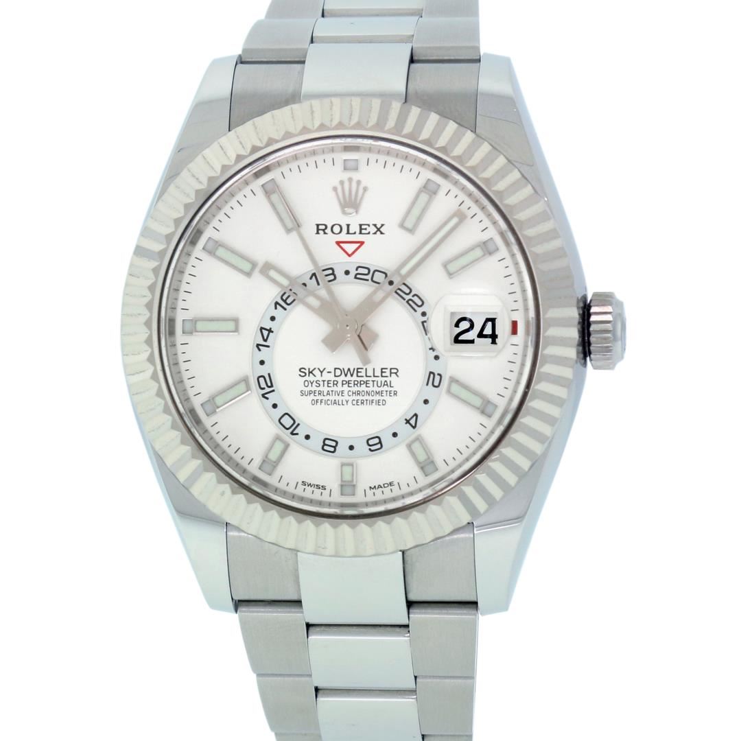 One Mens Pre Owned Stainless Steel Rolex Sky Dweller With Date Polished, Serviced & Electronically Tested, Rolex Stainless Steel Case: 42mm, Rolex Stainless Steel Crown, Rolex Bezel: 18K White Gold Rotatable Fluted Bezel. Rolex Crystal: Sapphire With Magnified Date Window. Rolex Movement: Automatic Winding Movement Caliber 9001. Rolex Dial: Rolex White Sky Dweller Dial with Luminous Index Hour Markers. Date Window: 3 O'Clock Position Date Display, Model: Sky Dweller, Quickset, Month Calendar Feature, Dual Time. Condition: G-6 Extra Fine. Rolex Bracelet: Stainless Steel Oyster Band. Bright Polish & Satin Finish. 7.25 Inch Length, Adjustable. Standard Clasp, With Rolex Logo. This Watch Has Been Serviced Time Tested And Is In Excellent Condition It Is Free Of All Scratches And Dents. This Watch Comes With A Rolex Box, Rolex Papers, And Rolex Booklet.