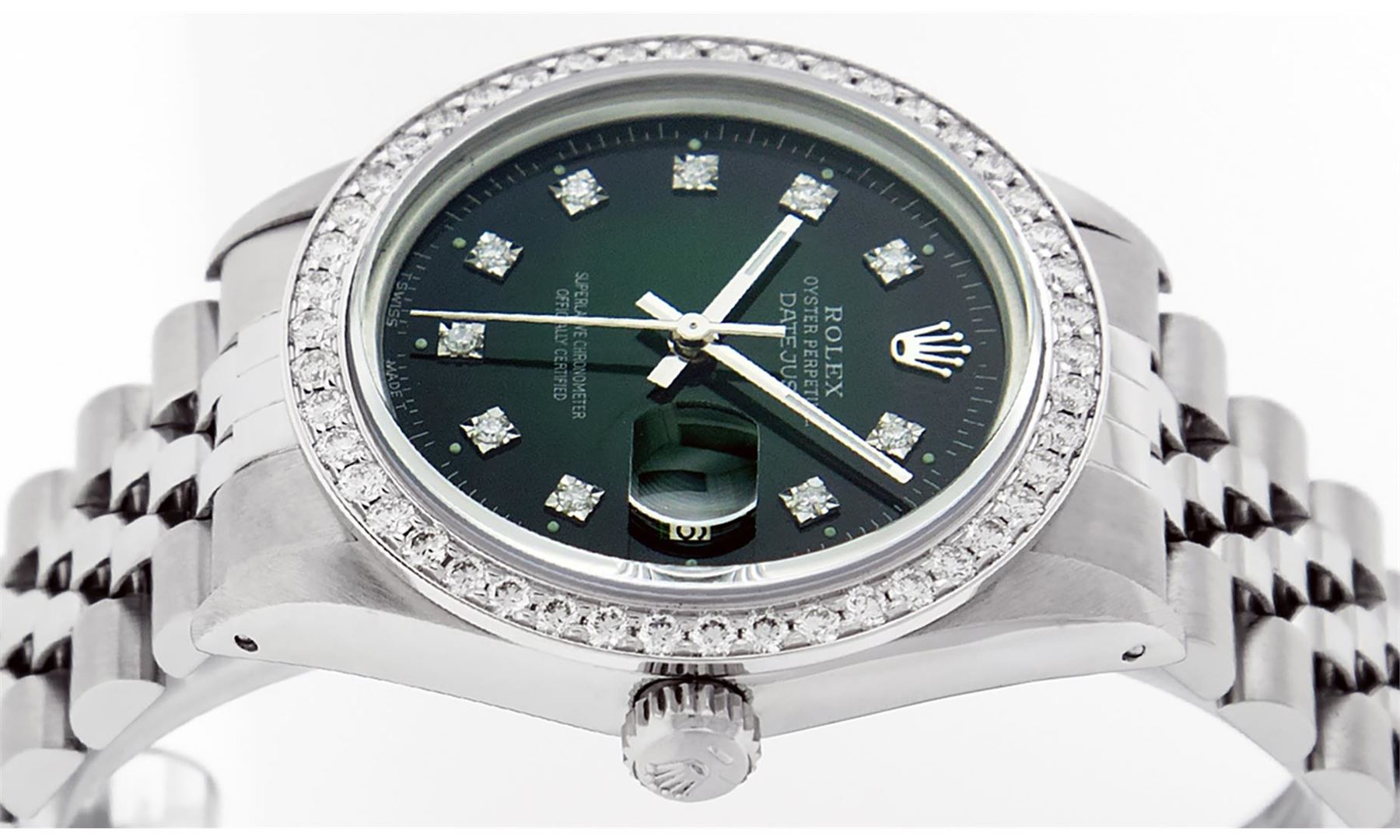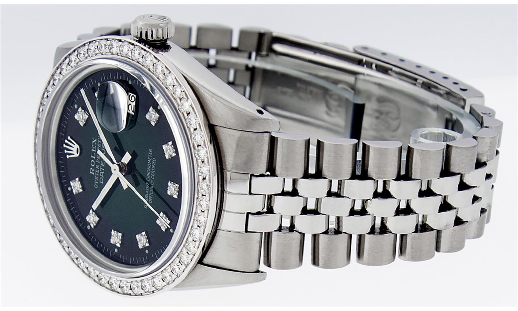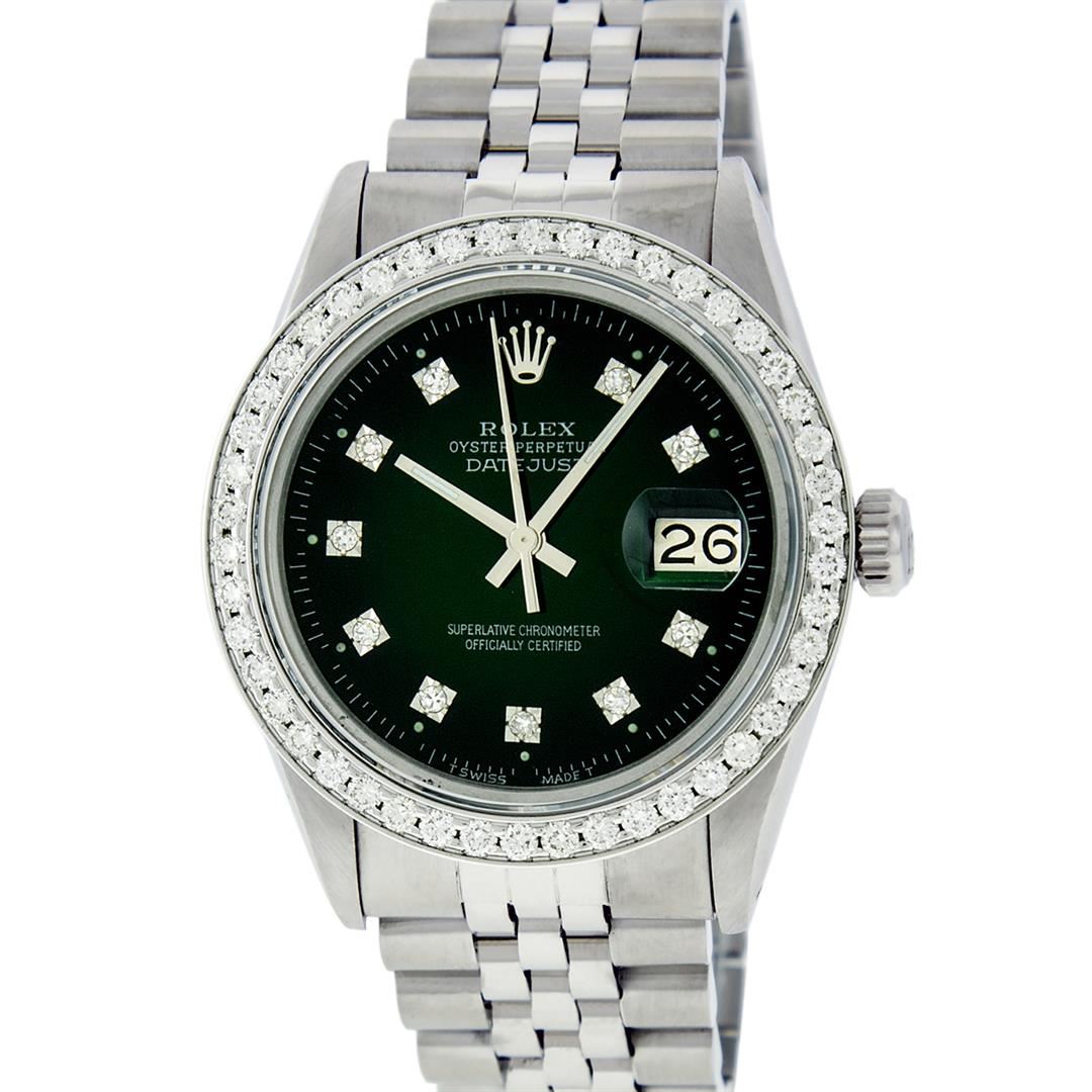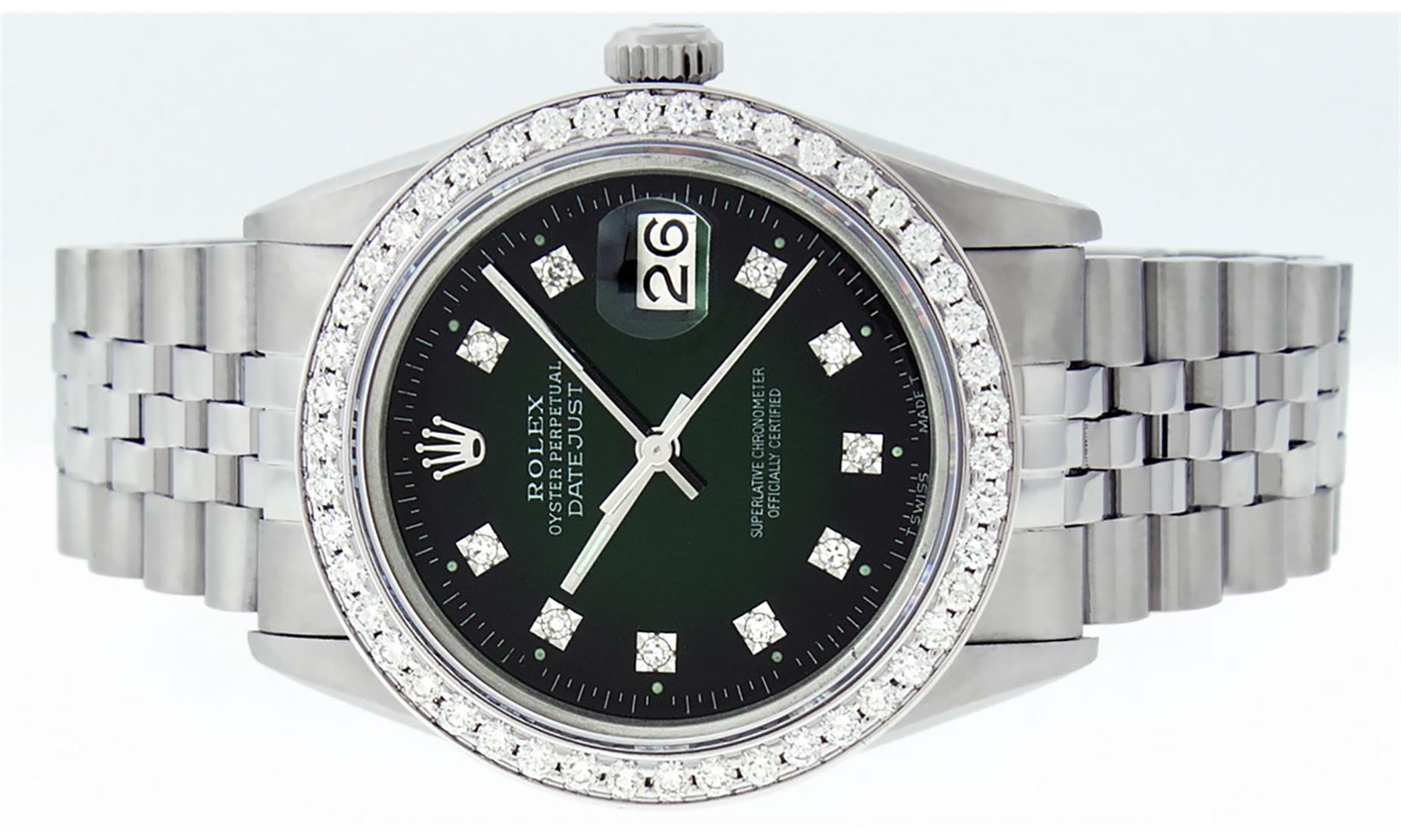 One Mens Stainless Steel Rolex Datejust Polished, Serviced & Electronically Tested, Stainless Steel Case: 36mm, Stainless Steel Crown, Custom Bezel: New 18K White Gold Beadset Diamond Bezel, Diamond Count: 46 Diamonds In Bezel, Total Weight 1.40 Carat, Clarity: SI-VS, Color: G to H. Custom Crystal: New Scratch Resistant Synthetic Sapphire Cyclops Lens. Custom Hands: New Luminescent Hands. Movement: Automatic Winding Movement Caliber 3035. Custom Dial: Green Vignette Diamond Dial, Diamond Count: 10 Diamonds in Dial, G To H In Color, Clarity: VS2. Date Window: 3 O'Clock Position Date Display, Quickset, Model: Datejust. Condition: G-6 Extra Fine. Bracelet: Stainless Steel Jubilee Band. Bright Polish & Satin Finish. 7.0 Inch Length, Adjustable. Standard Clasp, With Rolex Logo. This Watch Has Been Serviced Time Tested And Is In Excellent Condition It Is Free Of All Scratches And Dents.