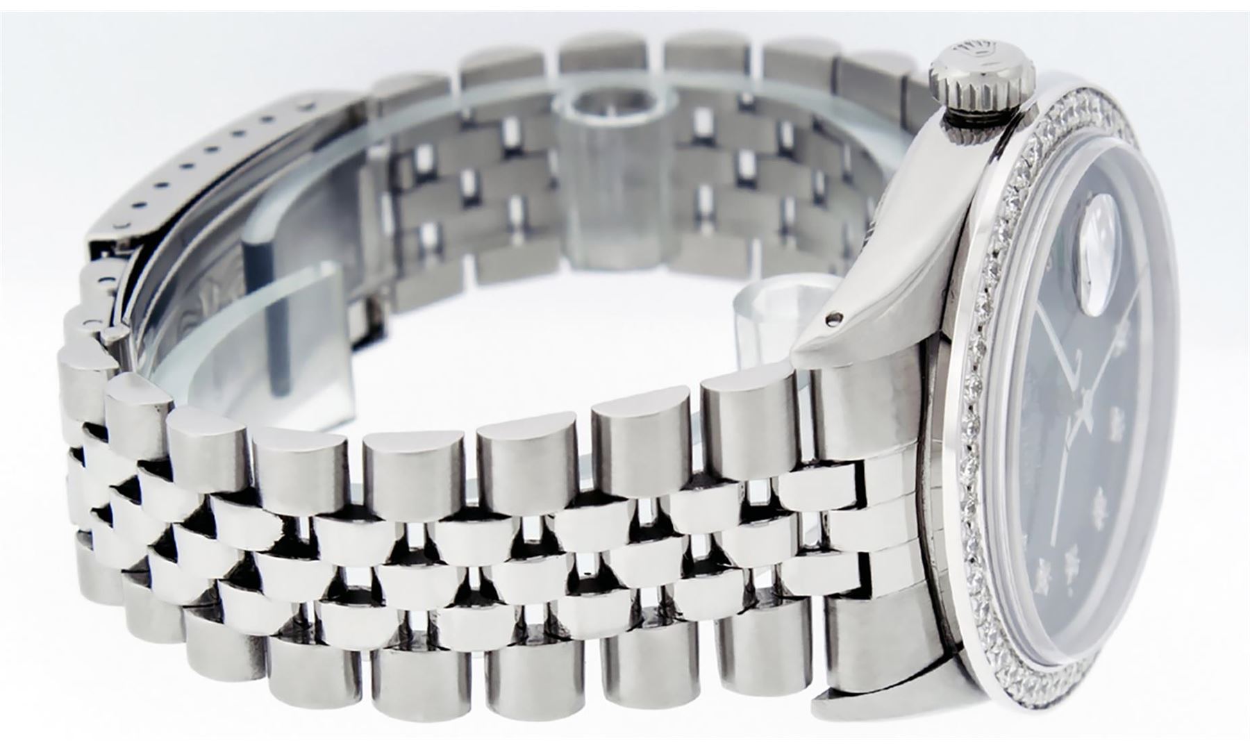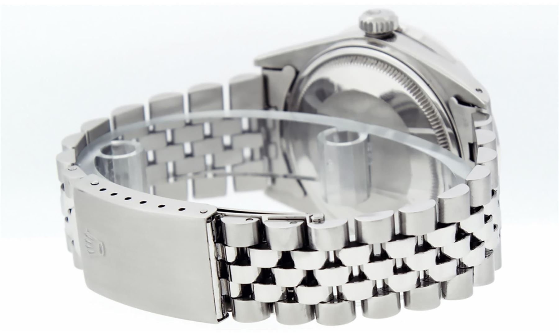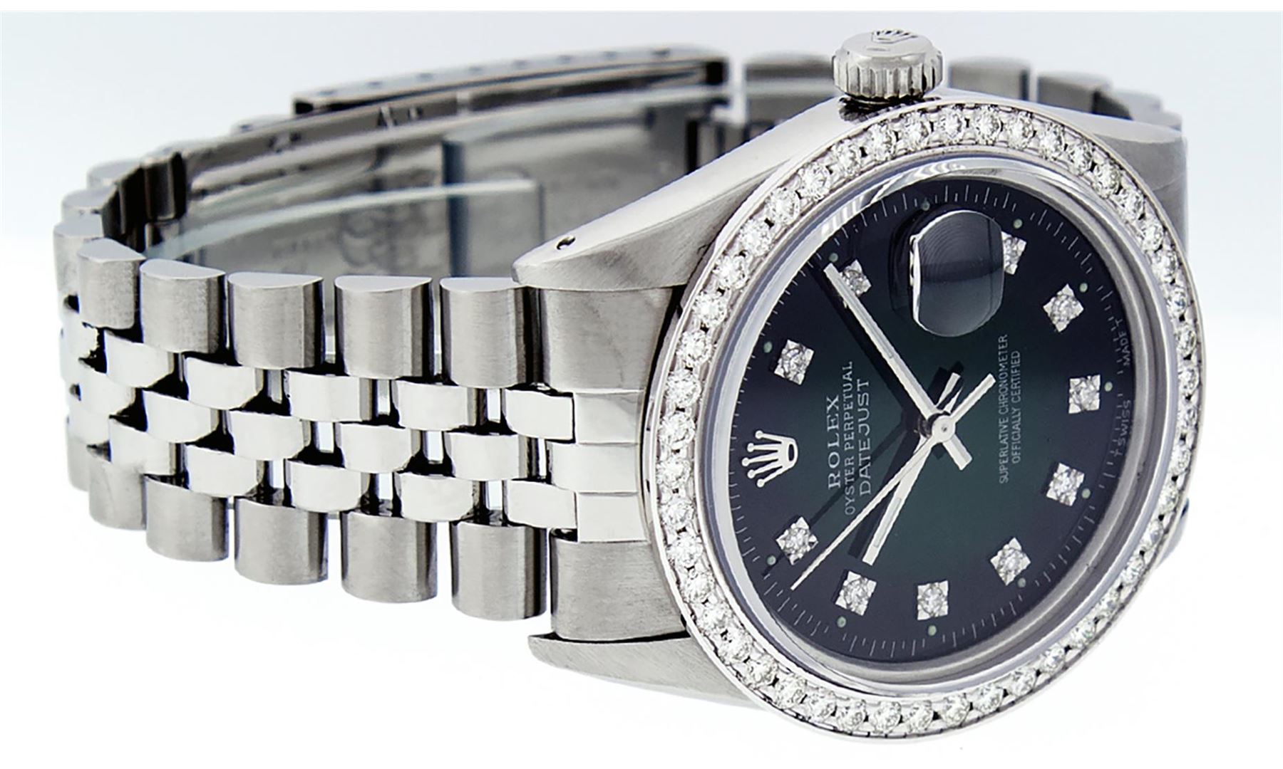 One Mens Stainless Steel Rolex Datejust Polished, Serviced & Electronically Tested, Stainless Steel Case: 36mm, Stainless Steel Crown, Custom Bezel: New 18K White Gold Beadset Diamond Bezel, Diamond Count: 46 Diamonds In Bezel, Total Weight 1.40 Carat, Clarity: SI-VS, Color: G to H. Custom Crystal: New Scratch Resistant Synthetic Sapphire Cyclops Lens. Custom Hands: New Luminescent Hands. Movement: Automatic Winding Movement Caliber 3035. Custom Dial: Green Vignette Diamond Dial, Diamond Count: 10 Diamonds in Dial, G To H In Color, Clarity: VS2. Date Window: 3 O'Clock Position Date Display, Quickset, Model: Datejust. Condition: G-6 Extra Fine. Bracelet: Stainless Steel Jubilee Band. Bright Polish & Satin Finish. 7.0 Inch Length, Adjustable. Standard Clasp, With Rolex Logo. This Watch Has Been Serviced Time Tested And Is In Excellent Condition It Is Free Of All Scratches And Dents.