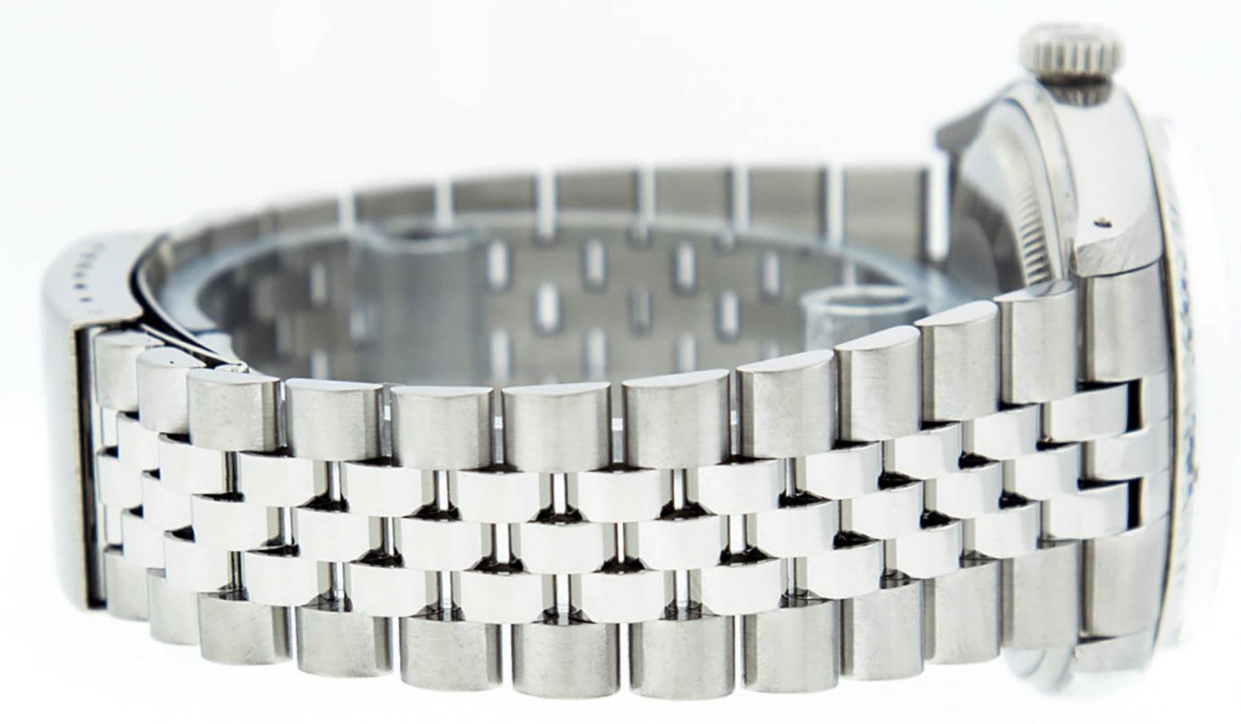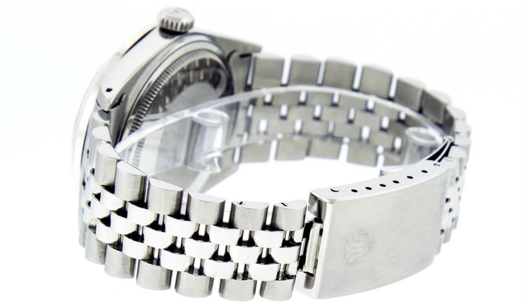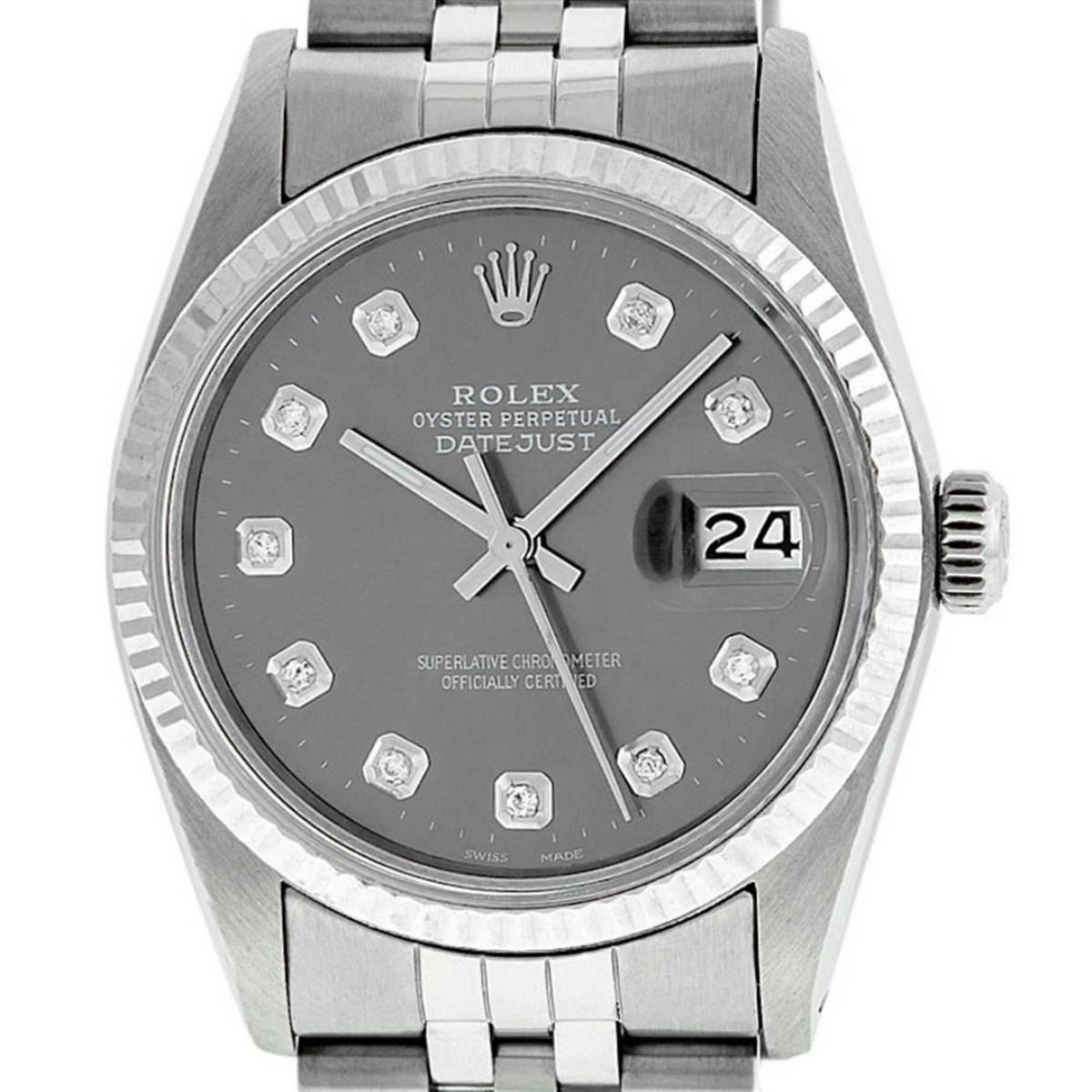 One Mens Stainless Steel Rolex Datejust Polished Bright with Satin Finish, Serviced & Electronically Tested, Stainless Steel Case: 36mm, Stainless Steel Crown, Bezel: 14K White Gold Fluted Bezel. Custom Crystal: New Acrylic Cyclops Lens. Custom Hands: New Luminecent Hands. Movement: Automatic Winding Movement Caliber 3035. Custom Dial: Slate Grey Diamond Dial With Dash Tracks, Diamond Count: 10 Diamonds in Dial, G To H In Color, SI-VS Clarity. Date Window: 3 O'Clock Position Date Display, Quickset, Model: Datejust, Condition: G-6 Extra Fine. Bracelet: Stainless Steel Jubilee. Bright Polish & Satin Finish. 7.0 Inch Length, Adjustable. Standard Clasp, With Rolex Logo. Watch Has Been Serviced And Polished It Is Free Of All Scratches And Dents.
