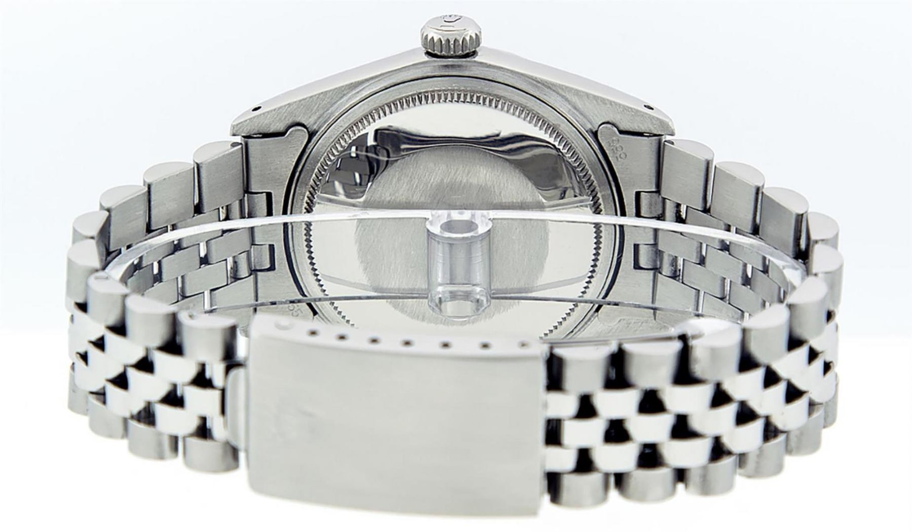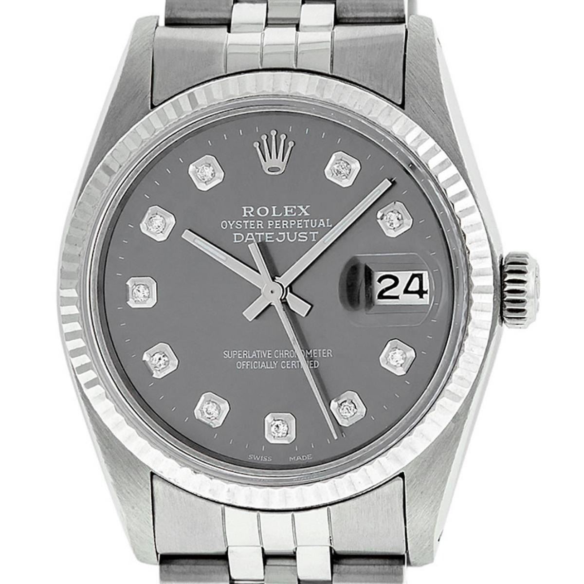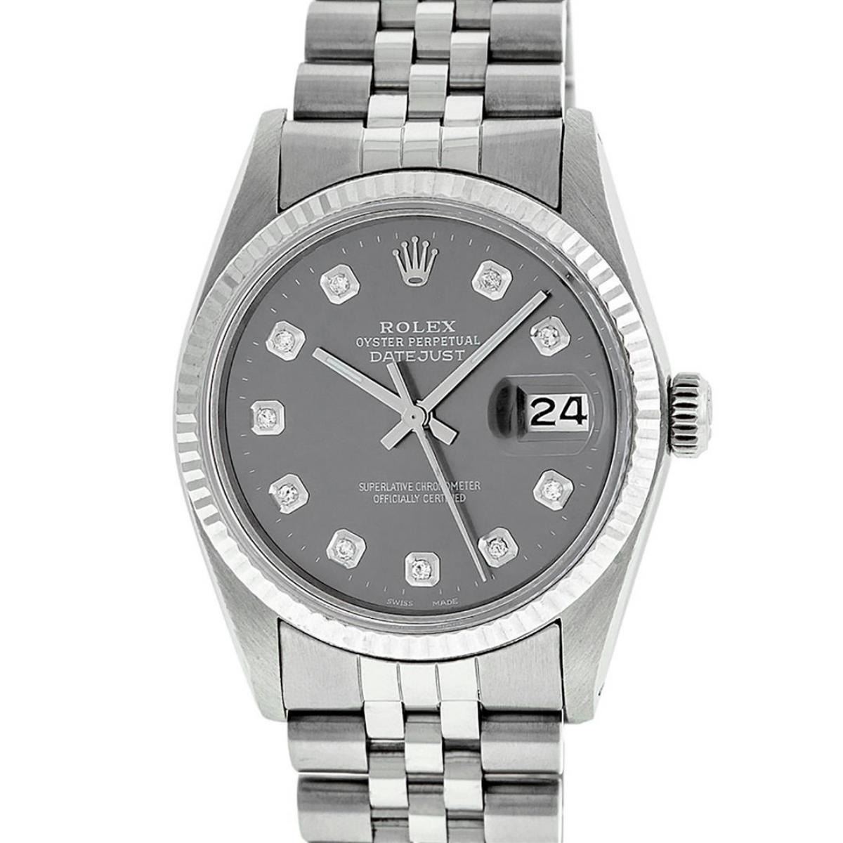 One Mens Stainless Steel Rolex Datejust Polished Bright with Satin Finish, Serviced & Electronically Tested, Stainless Steel Case: 36mm, Stainless Steel Crown, Bezel: 14K White Gold Fluted Bezel. Custom Crystal: New Acrylic Cyclops Lens. Custom Hands: New Luminecent Hands. Movement: Automatic Winding Movement. Custom Dial: Slate Grey Diamond Dial With Dash Tracks, Diamond Count: 10 Diamonds in Dial, G To H In Color, SI-VS Clarity. Date Window: 3 O'Clock Position Date Display, Quickset, Model: Datejust, Condition: G-6 Extra Fine. Bracelet: Stainless Steel Jubilee. Bright Polish & Satin Finish. 7.0 Inch Length, Adjustable. Standard Clasp, With Rolex Logo. Watch Has Been Serviced And Polished It Is Free Of All Scratches And Dents.