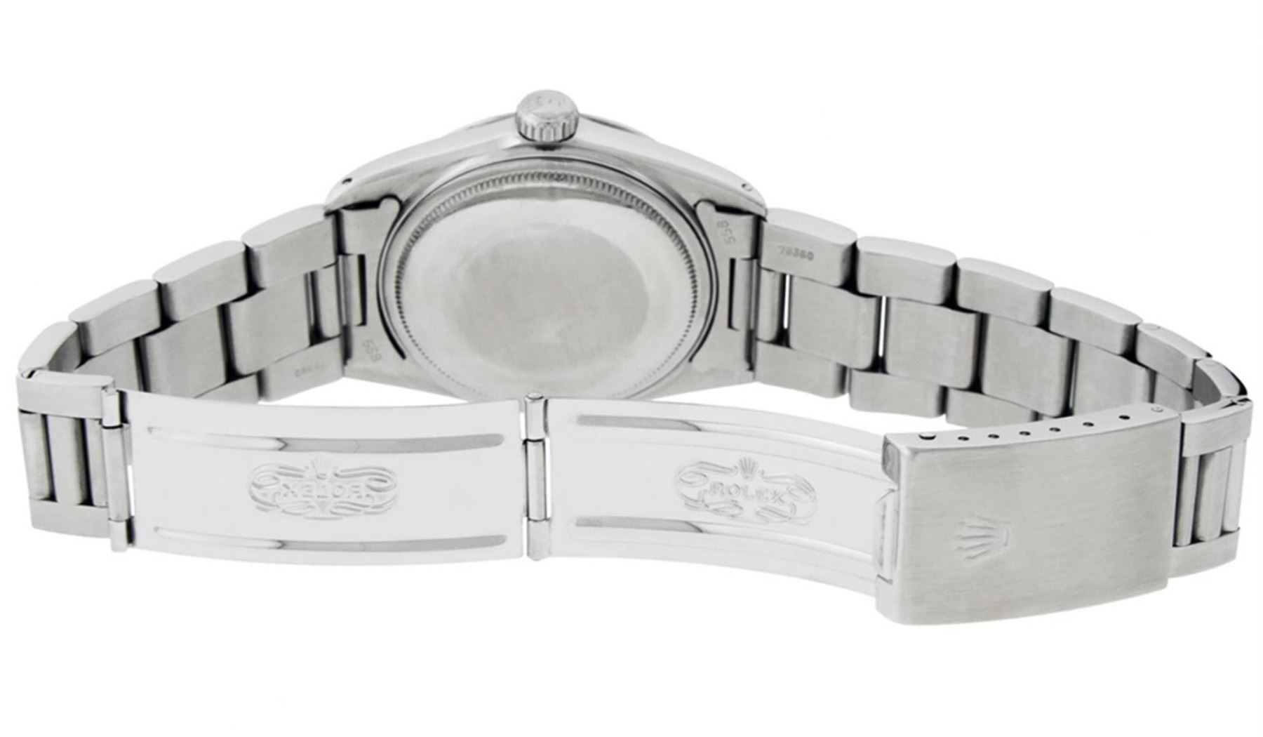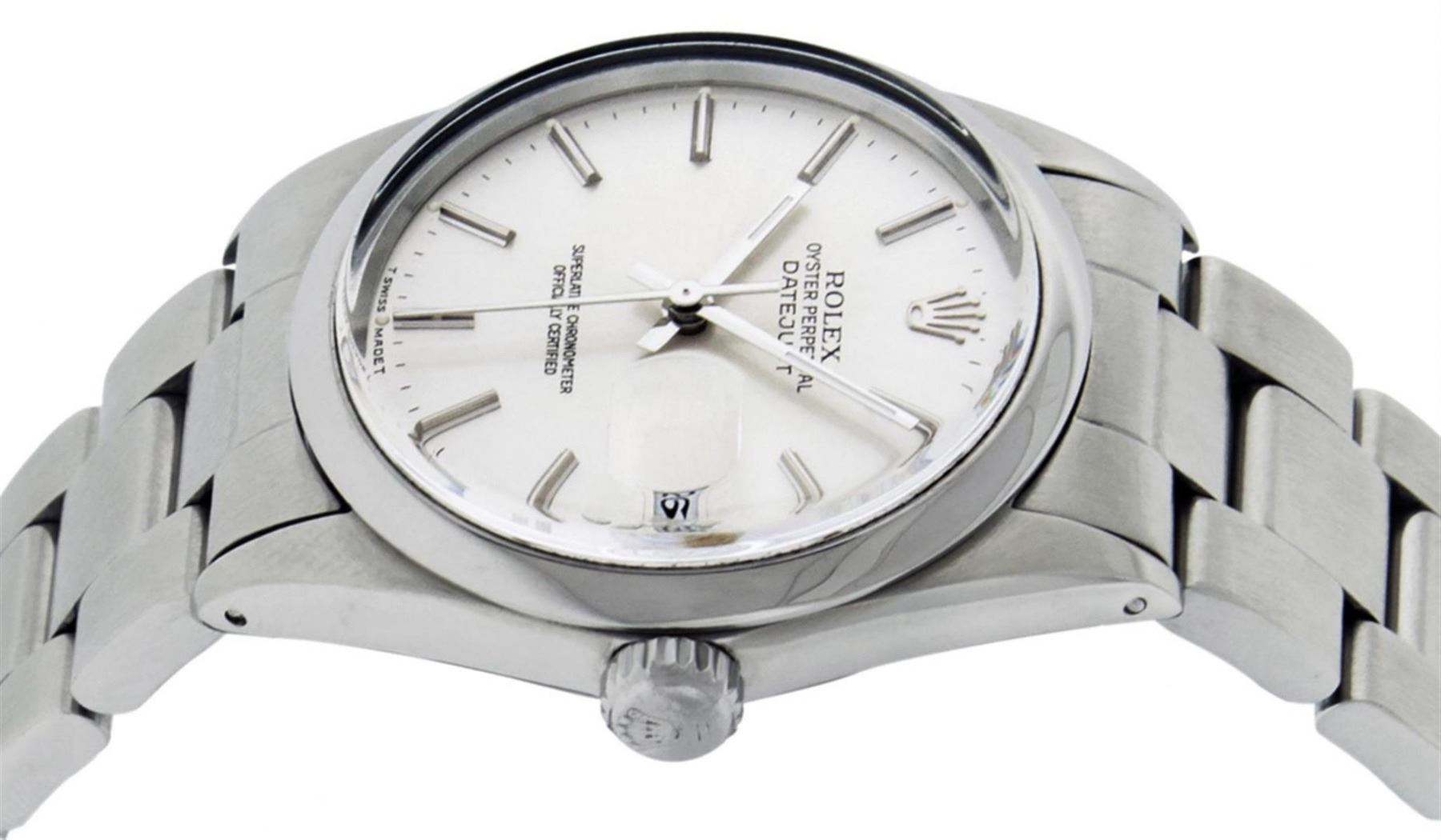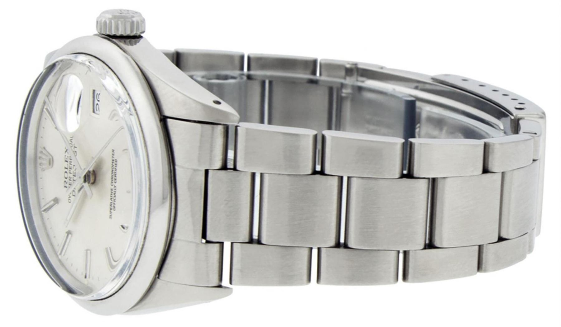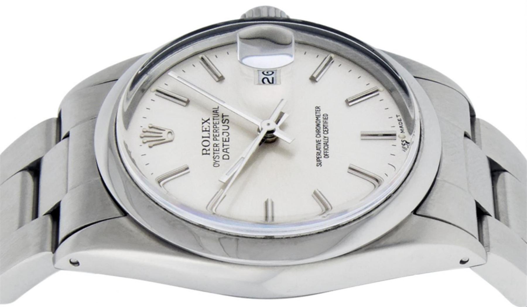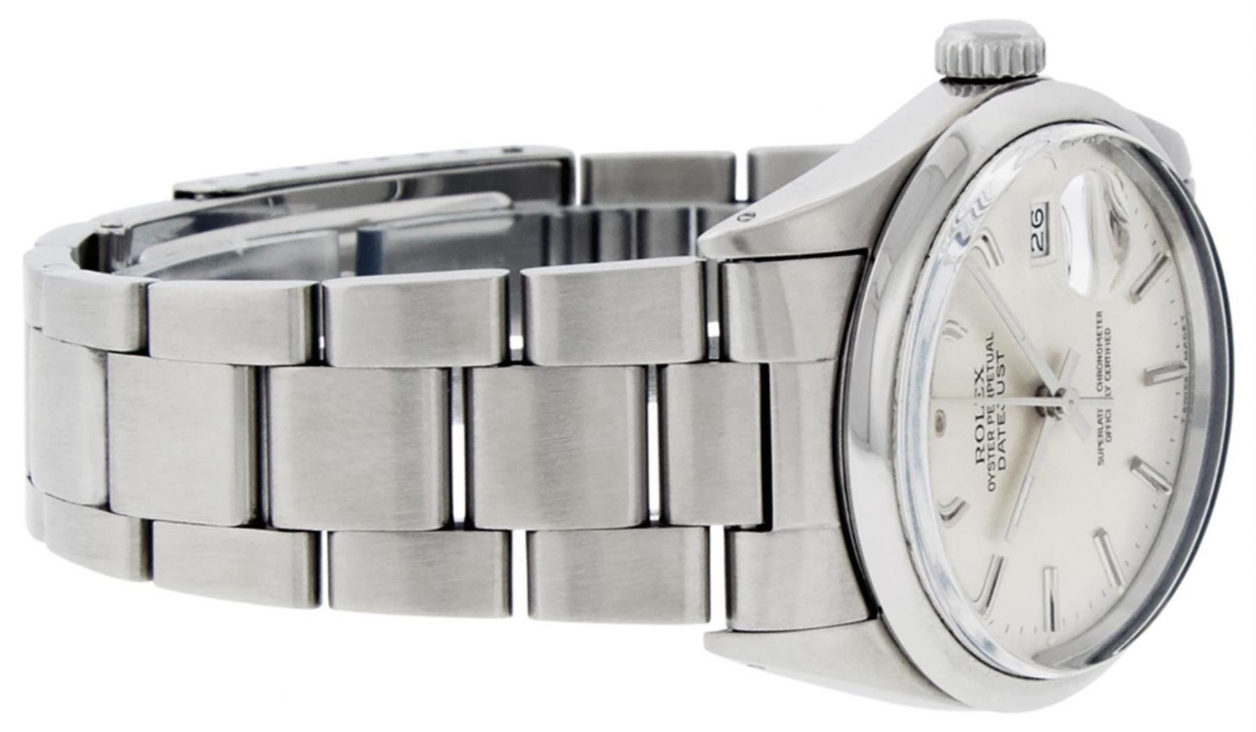 One Mens Rolex Stainless Steel Datejust Polished Bright with Satin Finish, Serviced & Electronically Tested, Stainless Steel Case: 36mm, Stainless Steel Crown, Bezel: Stainless Steel Smooth Bezel. Custom Crystal: New Scratch Resistant Synthetic Sapphire Cyclops Lens. Movement: Automatic Winding Movement Caliber 3135. Dial: Slate Grey Index With Line Track And Lumi Dot. Date Window: 3 O'Clock Position Date Display, Quickset, Model: Quickset Datejust. Condition: G-6 Extra Fine. Bracelet: Stainless Steel Oyster Band. Bright Polish & Satin Finish. 7.0 Inch Length, Adjustable. Standard Clasp, With Rolex Logo.