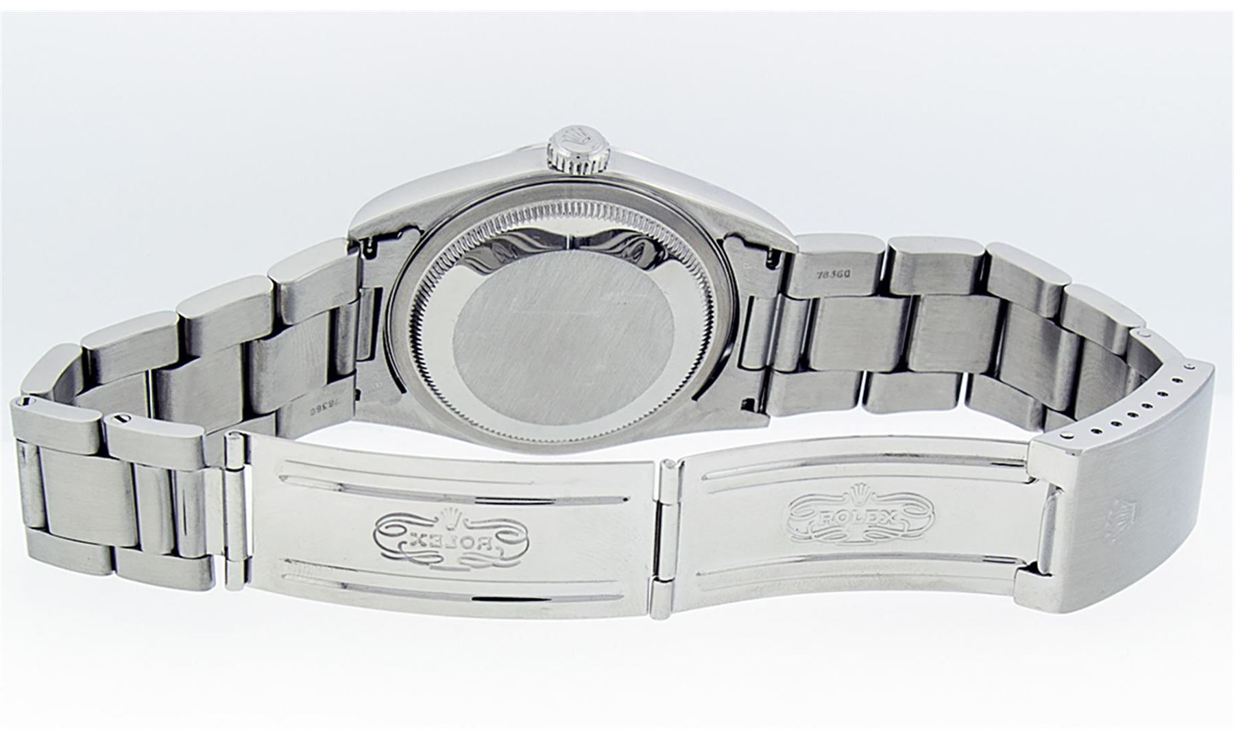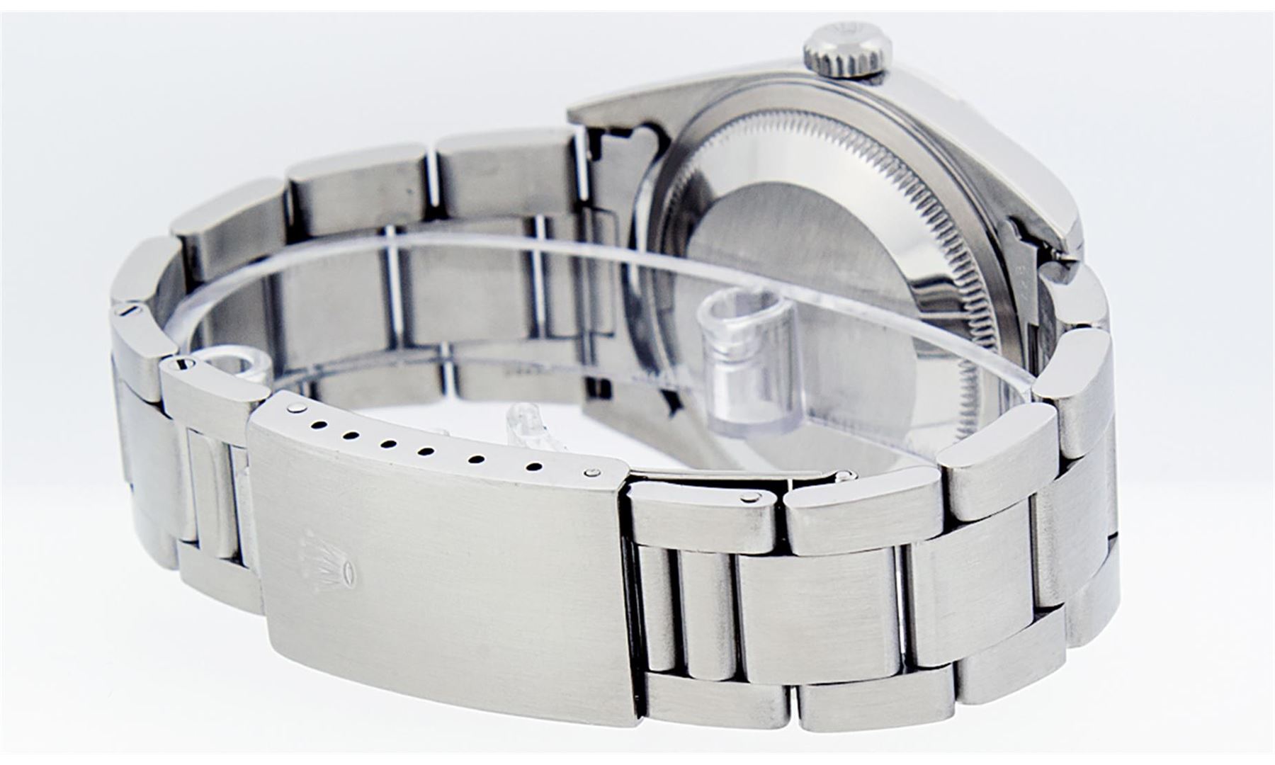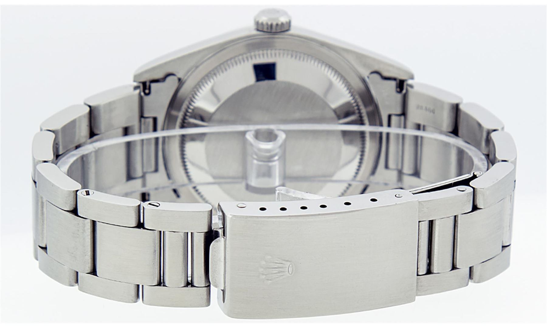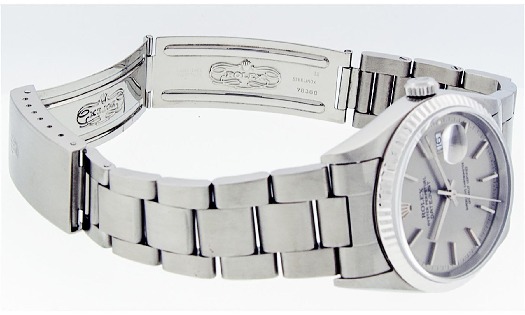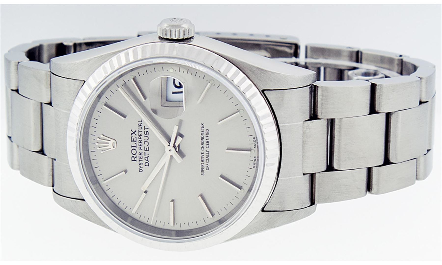 One Mens Rolex Stainless Steel Datejust Polished Bright with Satin Finish, Serviced & Electronically Tested, Rolex Stainless Steel Case: 36mm, Rolex Stainless Steel Crown, Rolex Bezel: Rolex White Gold Fluted Bezel. Custom Crystal: New Scratch Resistant S