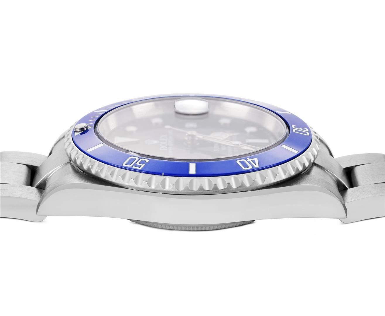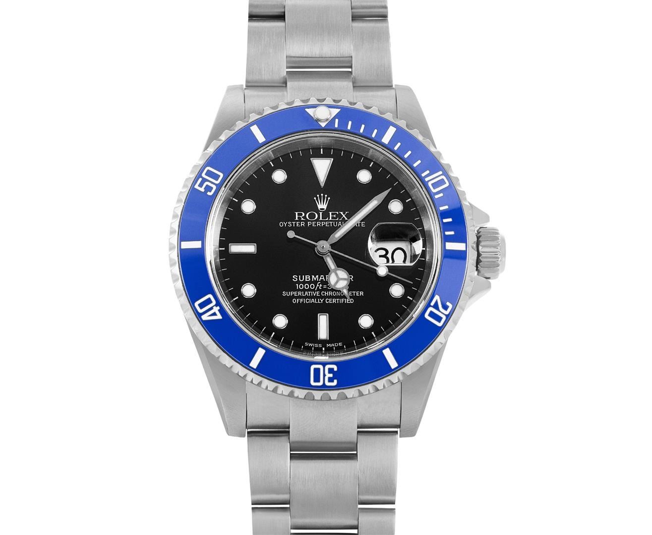 One Mens Pre Owned Rolex Stainless Steel Submariner With Date Polished, Serviced & Electronically Tested, Rolex Stainless Steel Case: 40mm, Rolex Stainless Steel Crown, Rolex Bezel: Stainless Steel Rotatable Bezel. Custom Bezel Insert: New Custom Blue Ceramic Insert. Crystal: Sapphire With Magnified Date Window. Rolex Movement: Automatic Winding Movement Caliber 3135. Rolex Dial: Black Submariner Dial with Luminous Index Hour Markers And Dash Track. Date Window: 3 O'Clock Position Date Display, Model: Date No Holes Submariner, Quickset, Condition: G-6 Extra Fine. Rolex Bracelet: Stainless Steel Oyster Band. Bright Polish & Satin Finish. 7.0 Inch Length, Adjustable. Fold Clasp, With Rolex Logo. This Watch Comes With A Rolex Box.
