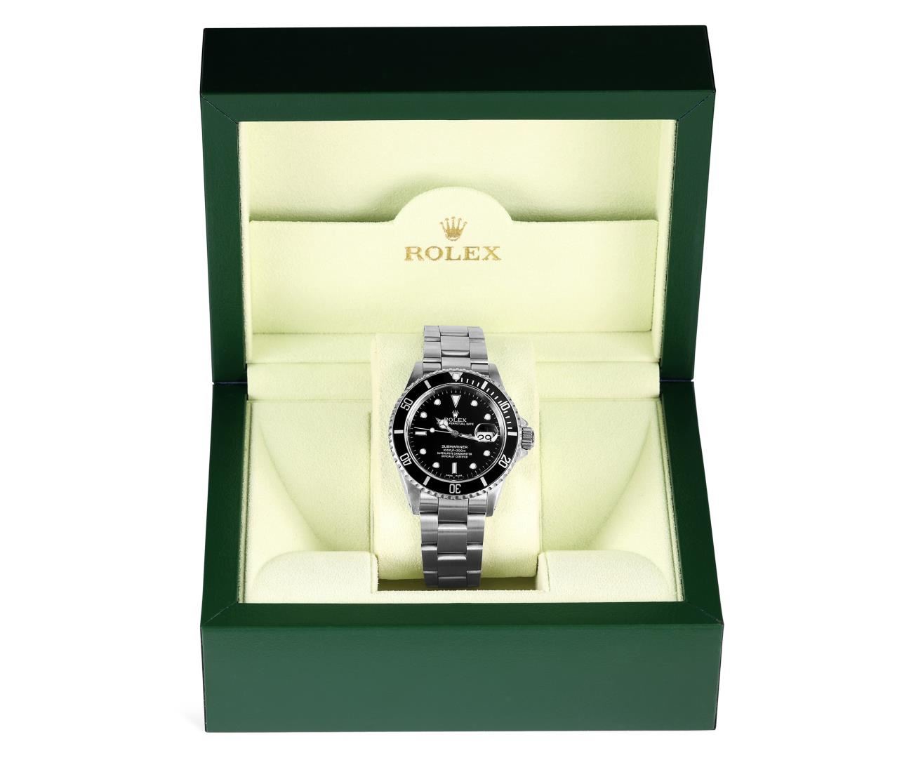 One Mens Pre Owned Stainless Steel Rolex Submariner With Date Polished, Serviced And Electronically Tested, Rolex Stainless Steel Case: 40mm, Rolex Stainless Steel Crown, Rolex Bezel: Stainless Steel Rotatable Bezel With Black Insert. Crystal: Sapphire With Magnified Date Window. Rolex Movement: Automatic Winding Movement Caliber 3135. Rolex Dial: Black Submariner Dial with Luminous Index Hour Markers And Dash Track. Date Window: 3 O'Clock Position Date Display, Model: Date Submariner, Quickset, Condition: G-6 Extra Fine. Rolex Bracelet: Stainless Steel Oyster Band. Bright Polish & Satin Finish. 7.0 Inch Length, Adjustable. Standard Clasp, With Rolex Logo. This Watch Comes With A Rolex Box.