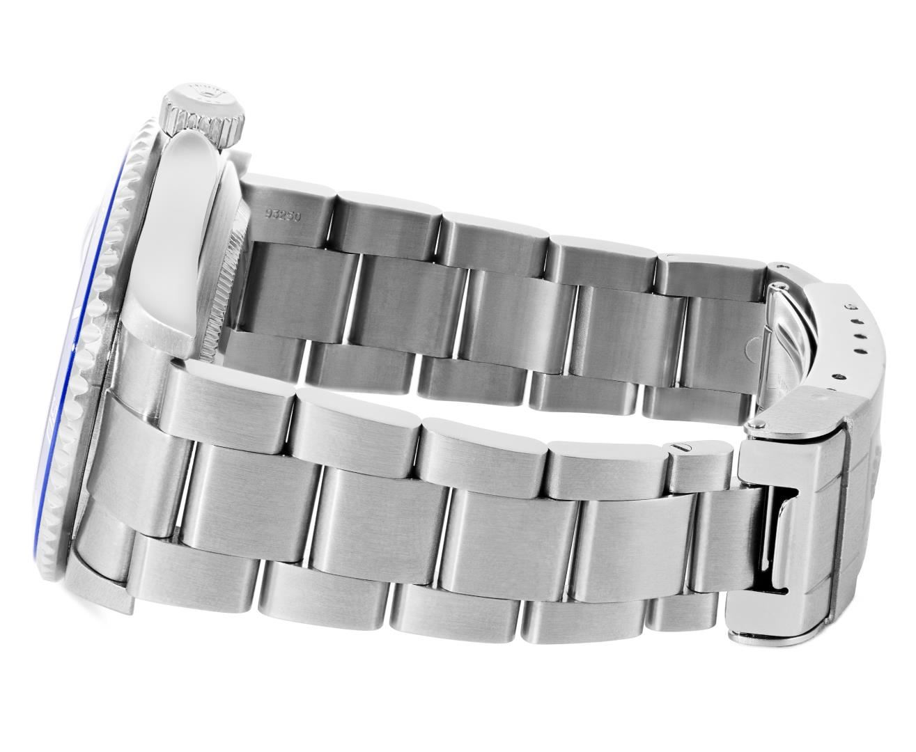 One Mens Pre Owned Rolex Stainless Steel Submariner With Date Polished, Serviced & Electronically Tested, Rolex Stainless Steel Case: 40mm, Rolex Stainless Steel Crown, Rolex Bezel: Stainless Steel Rotatable Bezel. Custom Bezel Insert: New Custom Blue Ceramic Insert. Crystal: Sapphire With Magnified Date Window. Rolex Movement: Automatic Winding Movement Caliber 3135. Rolex Dial: Black Submariner Dial with Luminous Index Hour Markers And Dash Track. Date Window: 3 O'Clock Position Date Display, Model: Date No Holes Submariner, Quickset, Condition: G-6 Extra Fine. Rolex Bracelet: Stainless Steel Oyster Band. Bright Polish & Satin Finish. 7.0 Inch Length, Adjustable. Fold Clasp, With Rolex Logo. This Watch Comes With A Rolex Box.