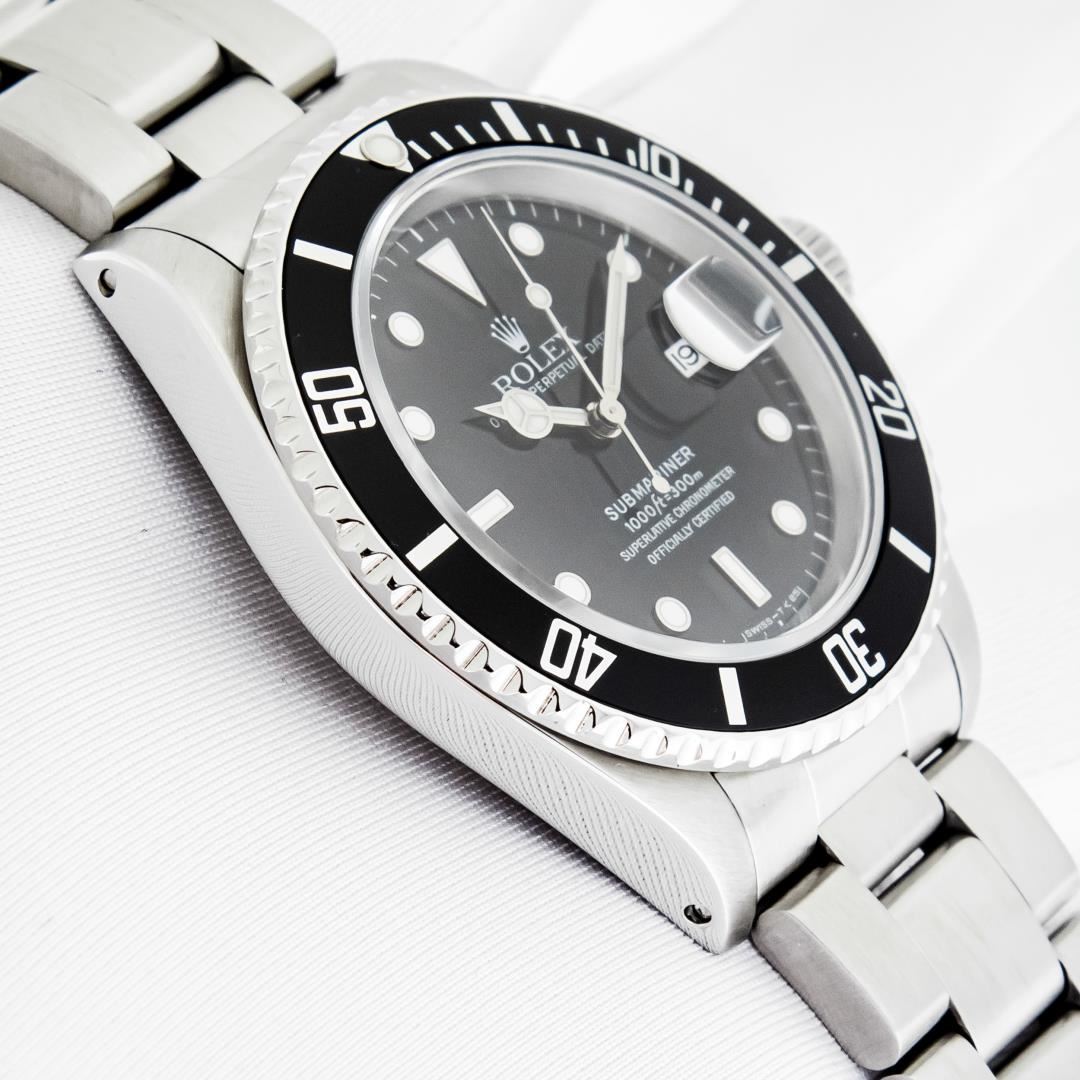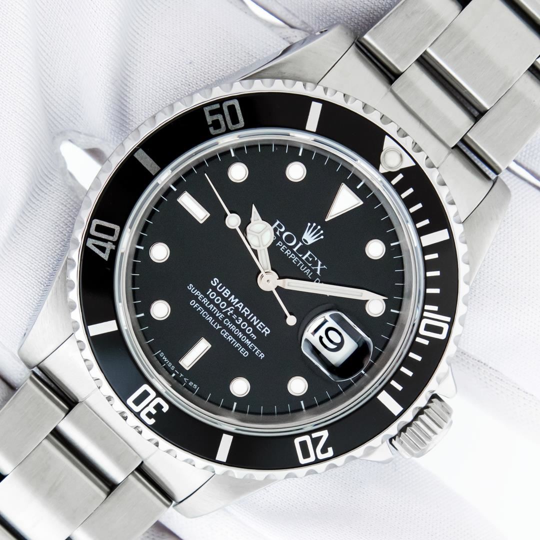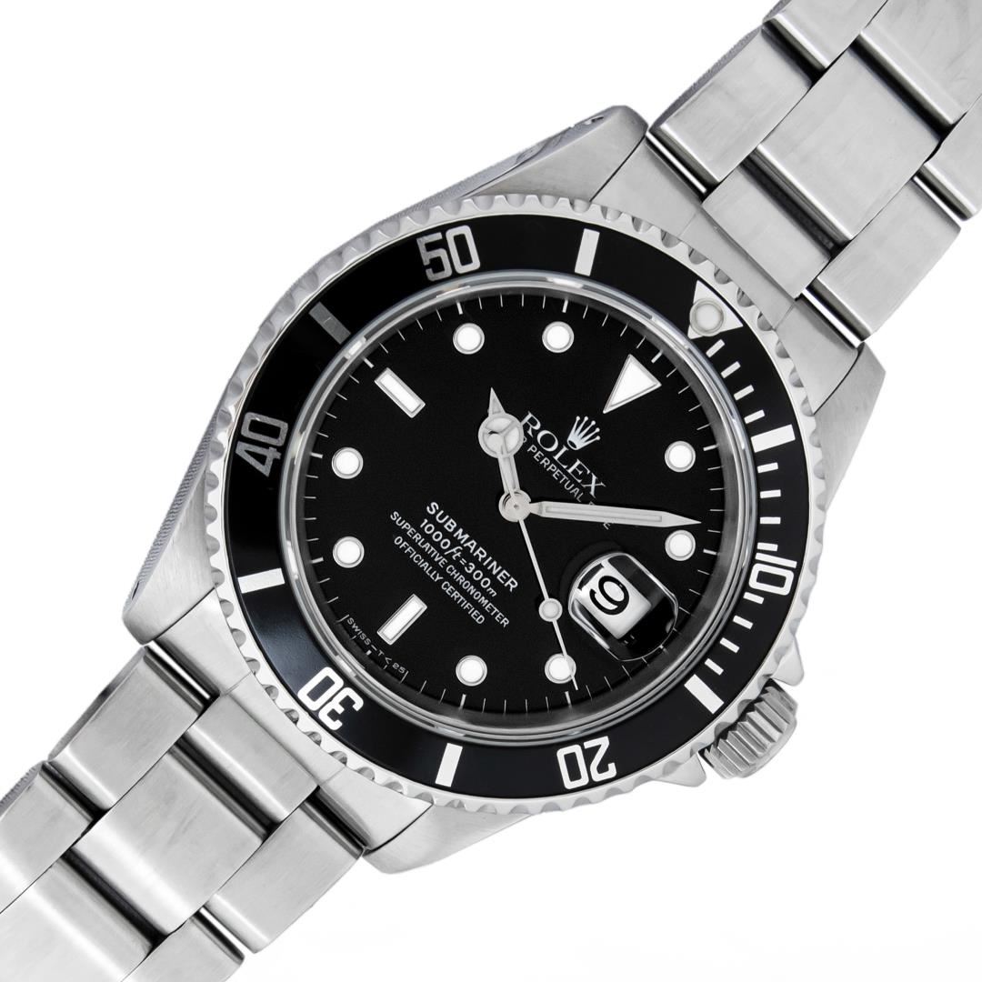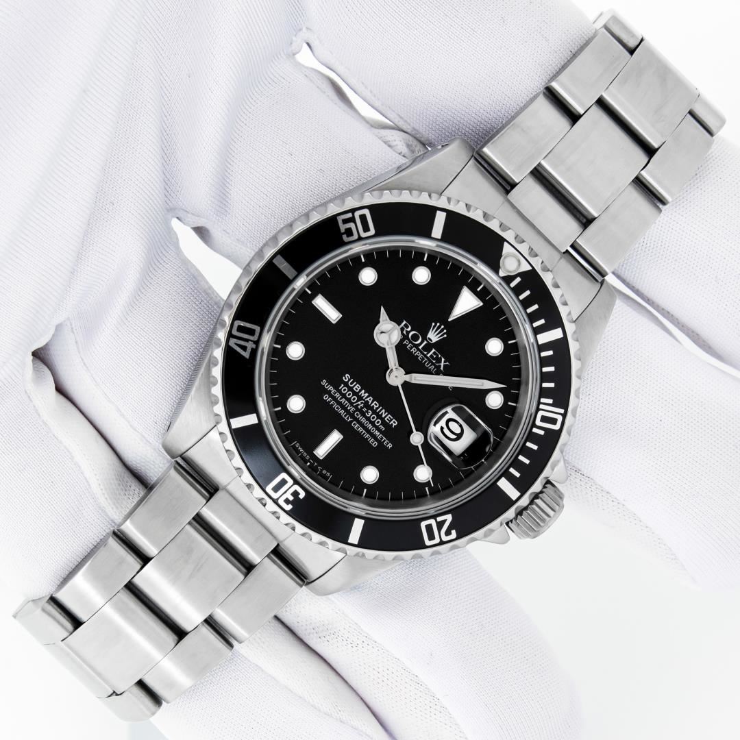 One Mens Pre Owned Rolex Submariner With Date Polished, Serviced & Electronically Tested, Rolex Stainless Steel Case: 40mm, Rolex Stainless Steel Crown, Rolex Bezel: Stainless Steel Rotatable Bezel With Black Insert. Crystal: Sapphire With Magnified Date Window. Rolex Movement: Automatic Winding Movement Caliber 3135. Rolex Dial: Black Submariner Dial with Luminous Index Hour Markers And Dash Track. Date Window: 3 O'Clock Position Date Display, Model: Date Submariner, Quickset, Condition: G-6 Extra Fine. Rolex Bracelet: Stainless Steel Oyster Band. Bright Polish & Satin Finish. 7.0 Inch Length, Adjustable. Standard Clasp, With Rolex Logo.