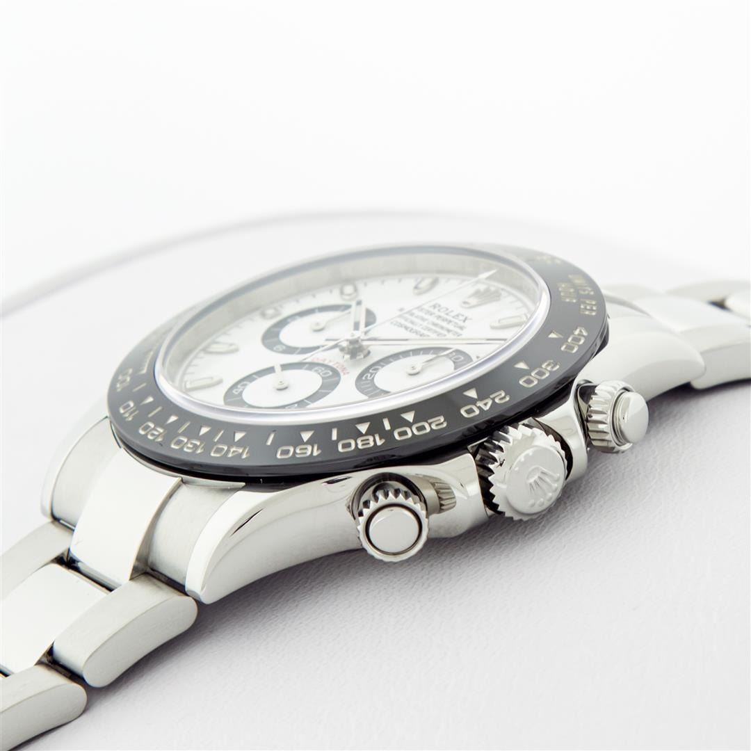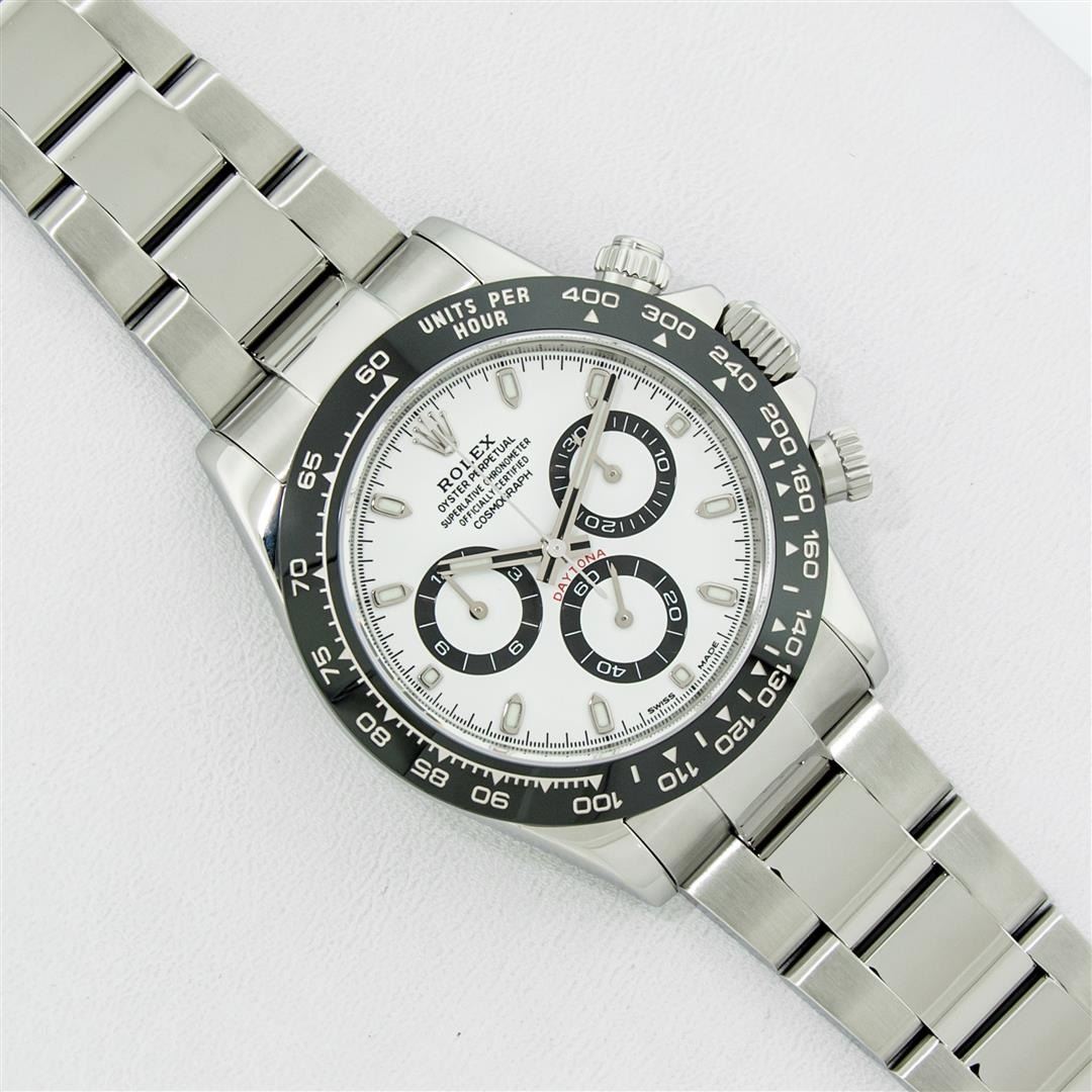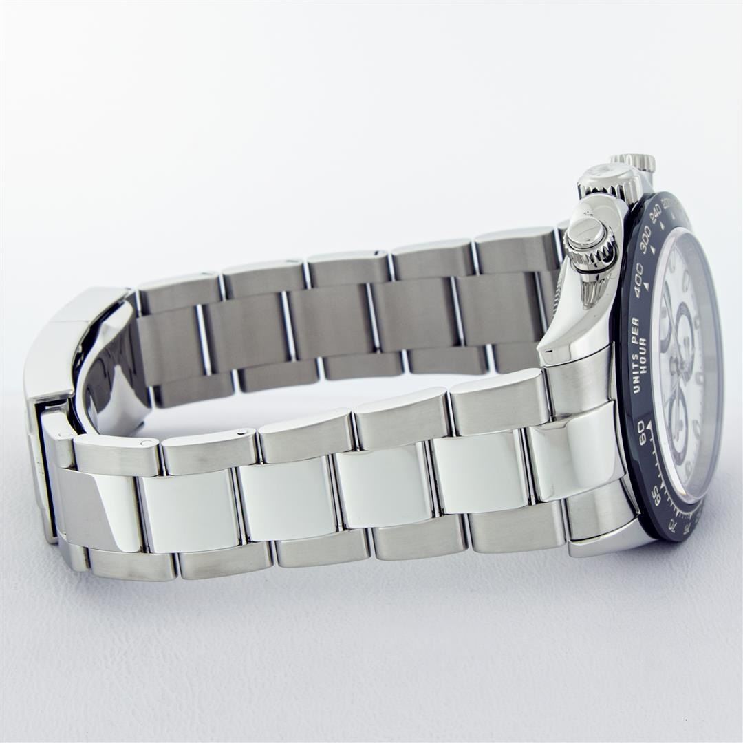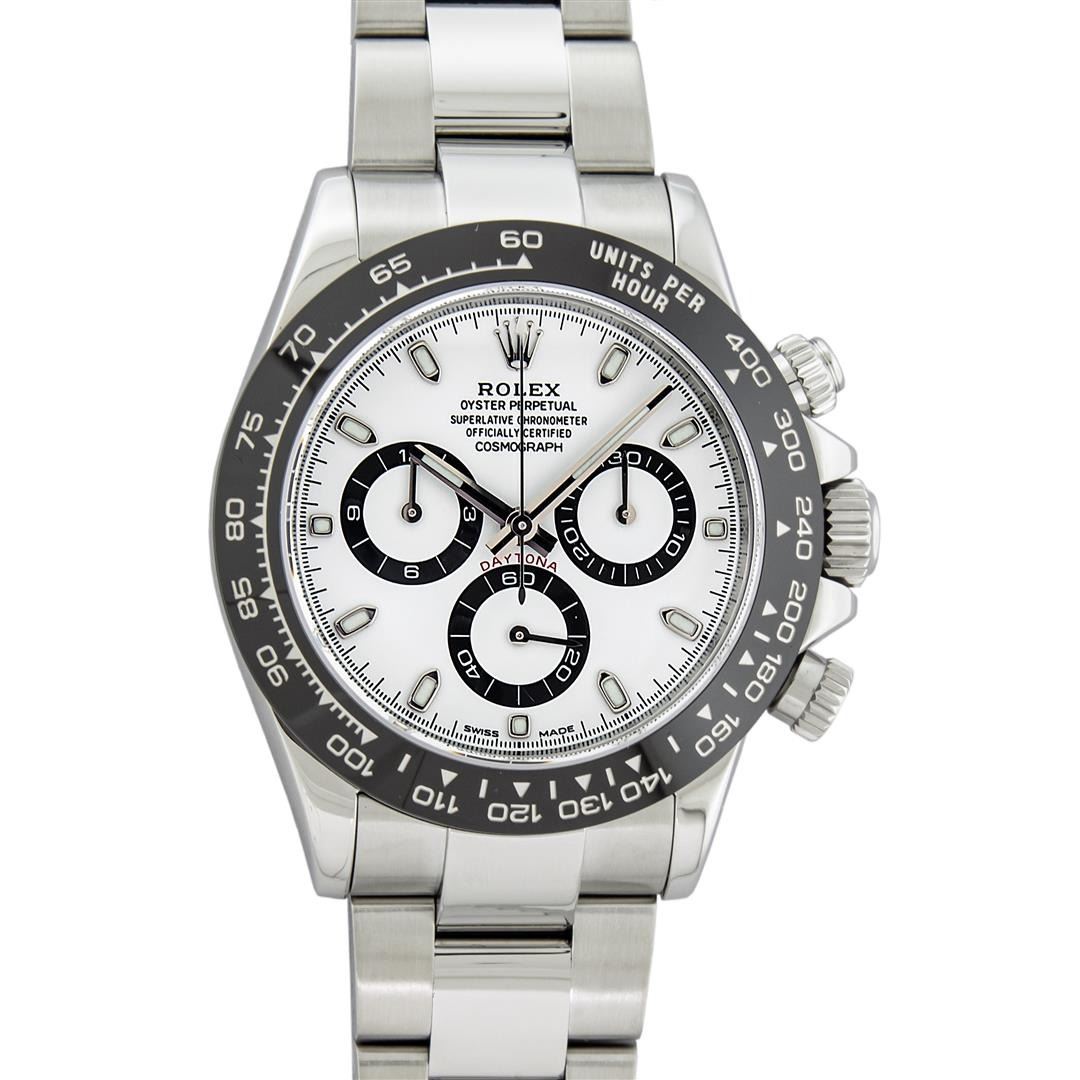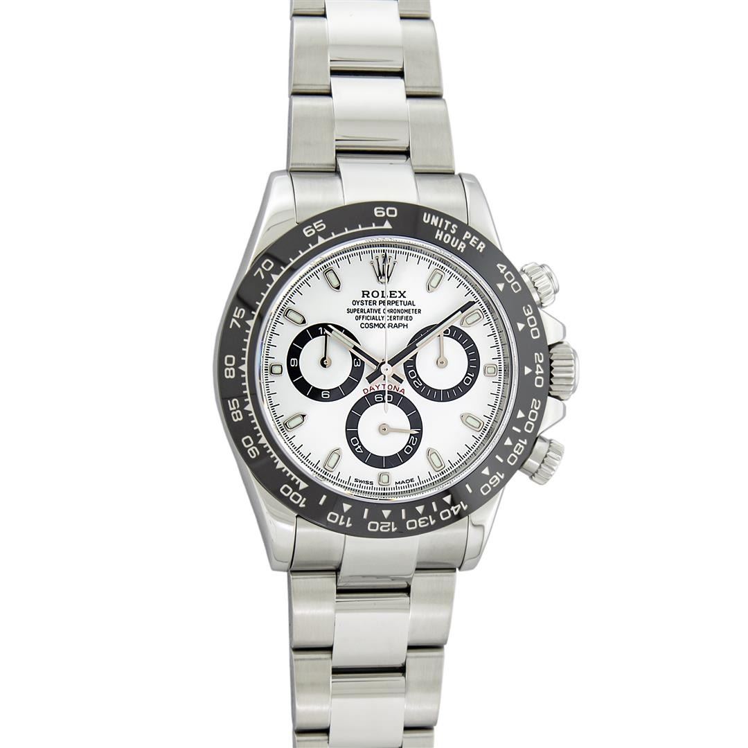 One Mens Pre Owned Rolex Stainless Steel Ceramic Daytona Polished Bright with Satin Finish, This Watch Has Been Serviced & Electronically Tested, Rolex Stainless Steel Case: 40mm, Rolex Bezel: Stainless Steel Bezel With Black Ceramic Insert. Rolex Crystal