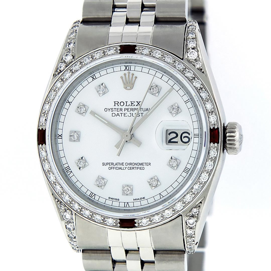 One Mens Rolex Datejust Polished Bright with Satin Finish, Serviced & Electronically Tested, Stainless Steel Case:36mm, Diamond Lugs: 28 Diamonds In Lugs, Color: G to H, Clarity: SI-VS. Stainless Steel Crown, Custom Bezel: 18K White Gold Diamond + Ruby Beadset, Diamond Count: 36 Diamonds + 4 Rubies, Total Weight 1.00 Carat, Clarity: SI-VS, Color: G to H. Custom Crystal: Synthetic Sapphire Cyclops Lens. Movement: Automatic Winding Movement Caliber 3035. Custom Dial: White Diamond Dial With Square Roman Track, Diamond Color: G To H In Color, Clarity: SI-VS. Date Window: 3 O'Clock Position Date Display, Quickset, Model: Datejust Condition: G-6 Extra Fine. Bracelet: Stainless Steel Jubilee Band. Bright Polish & Satin Finish. 7.0 Inch Length, Adjustable. Standard Clasp, With Rolex Logo. This watch has been serviced and polished and its free of all dents and scratches.