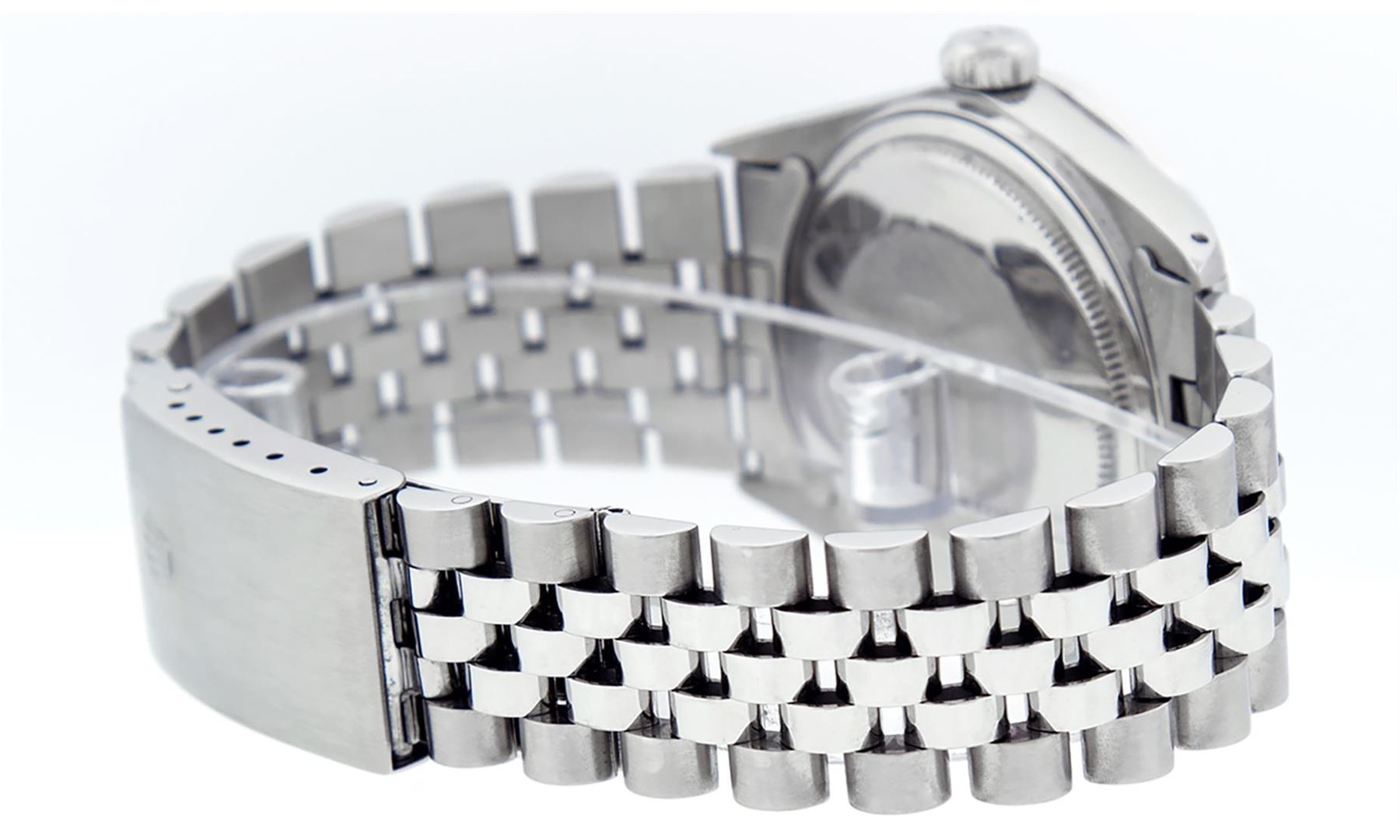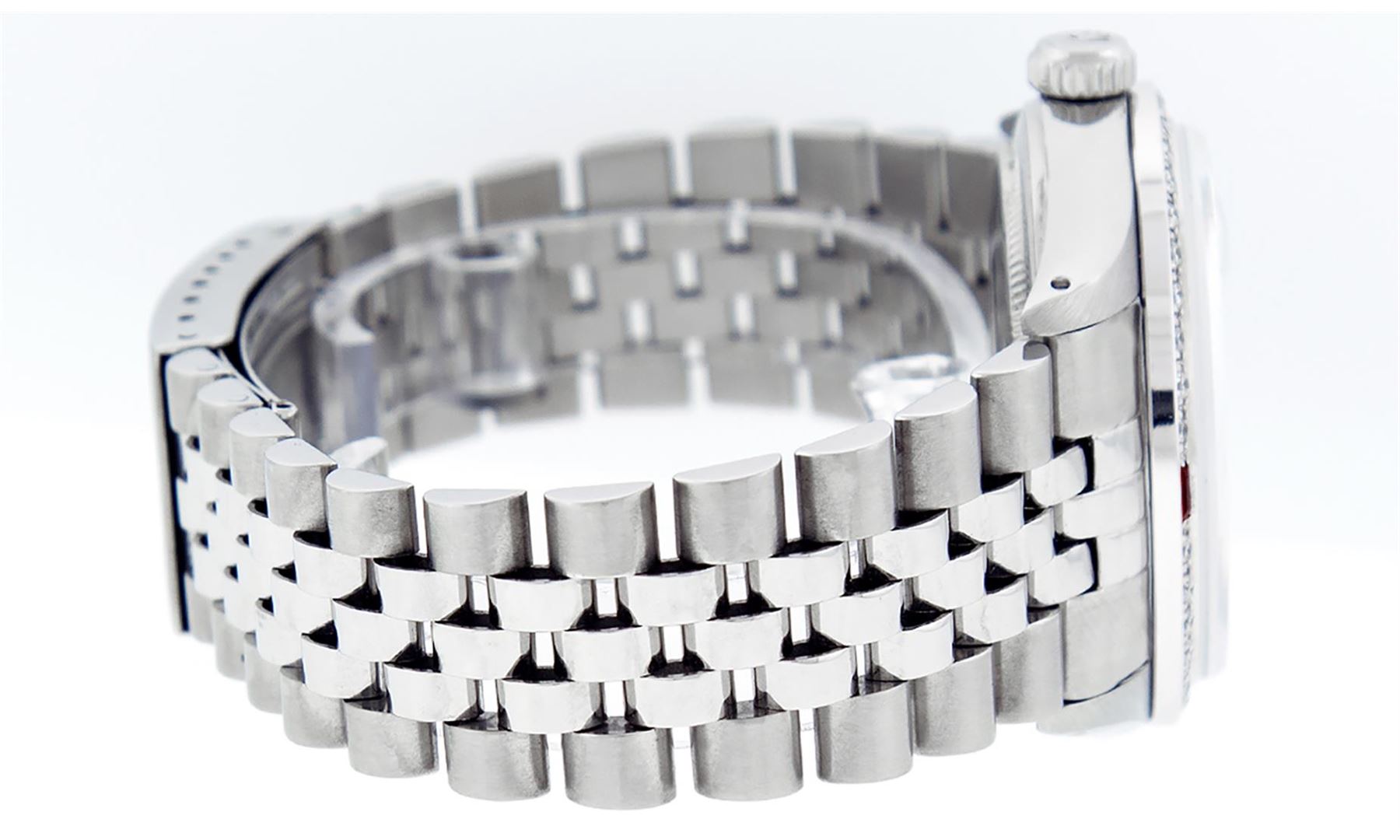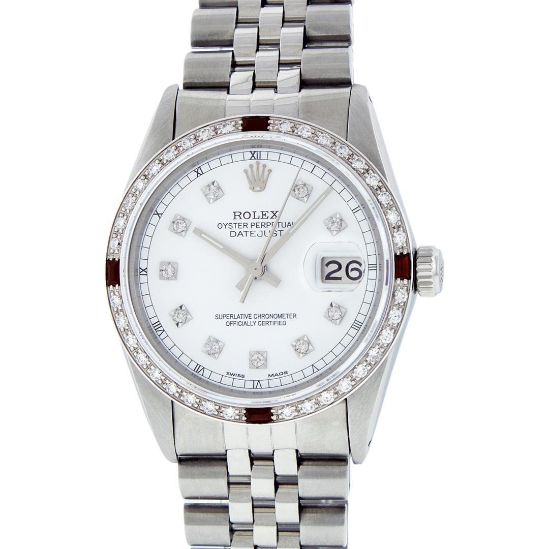 One Mens Stainless Steel Rolex Datejust Polished, Serviced & Electronically Tested, Stainless Steel Case: 36mm, Stainless Steel Crown, Custom Bezel: New 18K White Gold Ruby Beadset Diamond Bezel, Diamond + Gem Count: 36 Diamonds + 4 Rubies, Total Weight 1.00 Carat, Clarity: SI-VS, Color: G to H. Custom Crystal: New Scratch Resistant Synthetic Sapphire Cyclops Lens. Custom Hands: New Luminescent Hands. Movement: Automatic Winding Movement Caliber 3035. Custom Dial: White Diamond Dial With Roman Track, 10 Diamonds in Dial, G To H In Color, Clarity: SI-VS. Date Window: 3 O'Clock Position Date Display, Quickset, Model: Datejust. Condition: G-6 Extra Fine. Bracelet: Stainless Steel Jubilee Band. Bright Polish & Satin Finish. 7.0 Inch Length, Adjustable. Standard Clasp, With Rolex Logo. This Watch Has Been Serviced Time Tested And Is In Excellent Condition It Is Free Of All Scratches And Dents.