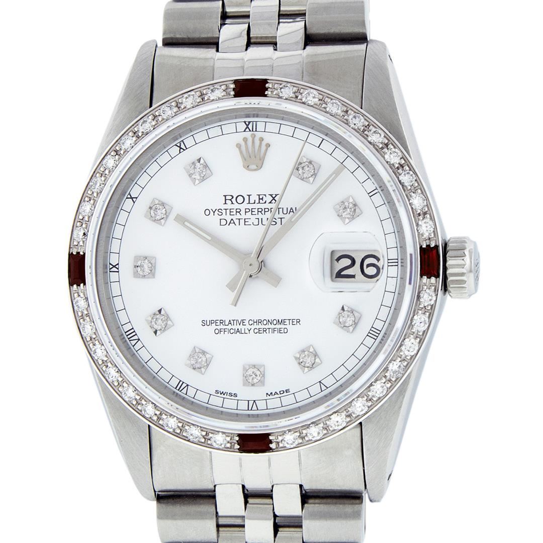 One Mens Stainless Steel Rolex Datejust Polished, Serviced & Electronically Tested, Stainless Steel Case: 36mm, Stainless Steel Crown, Custom Bezel: New 18K White Gold Ruby Beadset Diamond Bezel, Diamond + Gem Count: 36 Diamonds + 4 Rubies, Total Weight 1.00 Carat, Clarity: SI-VS, Color: G to H. Custom Crystal: New Scratch Resistant Synthetic Sapphire Cyclops Lens. Custom Hands: New Luminescent Hands. Movement: Automatic Winding Movement Caliber 3035. Custom Dial: White Diamond Dial With Roman Track, 10 Diamonds in Dial, G To H In Color, Clarity: SI-VS. Date Window: 3 O'Clock Position Date Display, Quickset, Model: Datejust. Condition: G-6 Extra Fine. Bracelet: Stainless Steel Jubilee Band. Bright Polish & Satin Finish. 7.0 Inch Length, Adjustable. Standard Clasp, With Rolex Logo. This Watch Has Been Serviced Time Tested And Is In Excellent Condition It Is Free Of All Scratches And Dents.