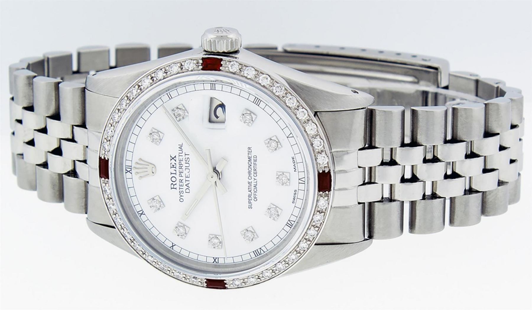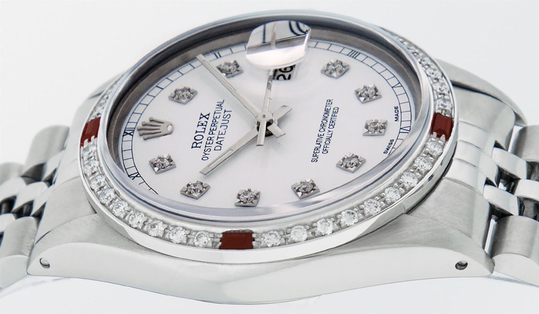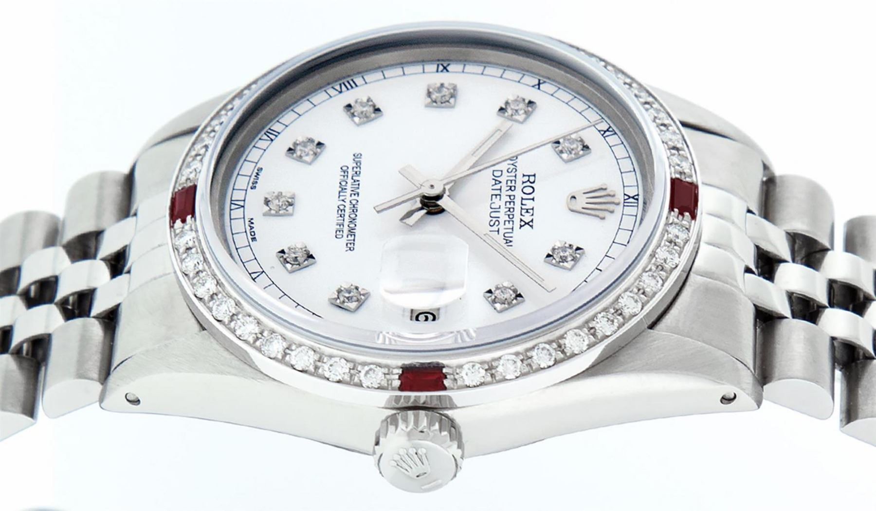 One Mens Stainless Steel Rolex Datejust Polished, Serviced & Electronically Tested, Stainless Steel Case: 36mm, Stainless Steel Crown, Custom Bezel: New 18K White Gold Ruby Beadset Diamond Bezel, Diamond + Gem Count: 36 Diamonds + 4 Rubies, Total Weight 1.00 Carat, Clarity: SI-VS, Color: G to H. Custom Crystal: New Scratch Resistant Synthetic Sapphire Cyclops Lens. Custom Hands: New Luminescent Hands. Movement: Automatic Winding Movement Caliber 3035. Custom Dial: White Diamond Dial With Roman Track, 10 Diamonds in Dial, G To H In Color, Clarity: SI-VS. Date Window: 3 O'Clock Position Date Display, Quickset, Model: Datejust. Condition: G-6 Extra Fine. Bracelet: Stainless Steel Jubilee Band. Bright Polish & Satin Finish. 7.0 Inch Length, Adjustable. Standard Clasp, With Rolex Logo. This Watch Has Been Serviced Time Tested And Is In Excellent Condition It Is Free Of All Scratches And Dents.
