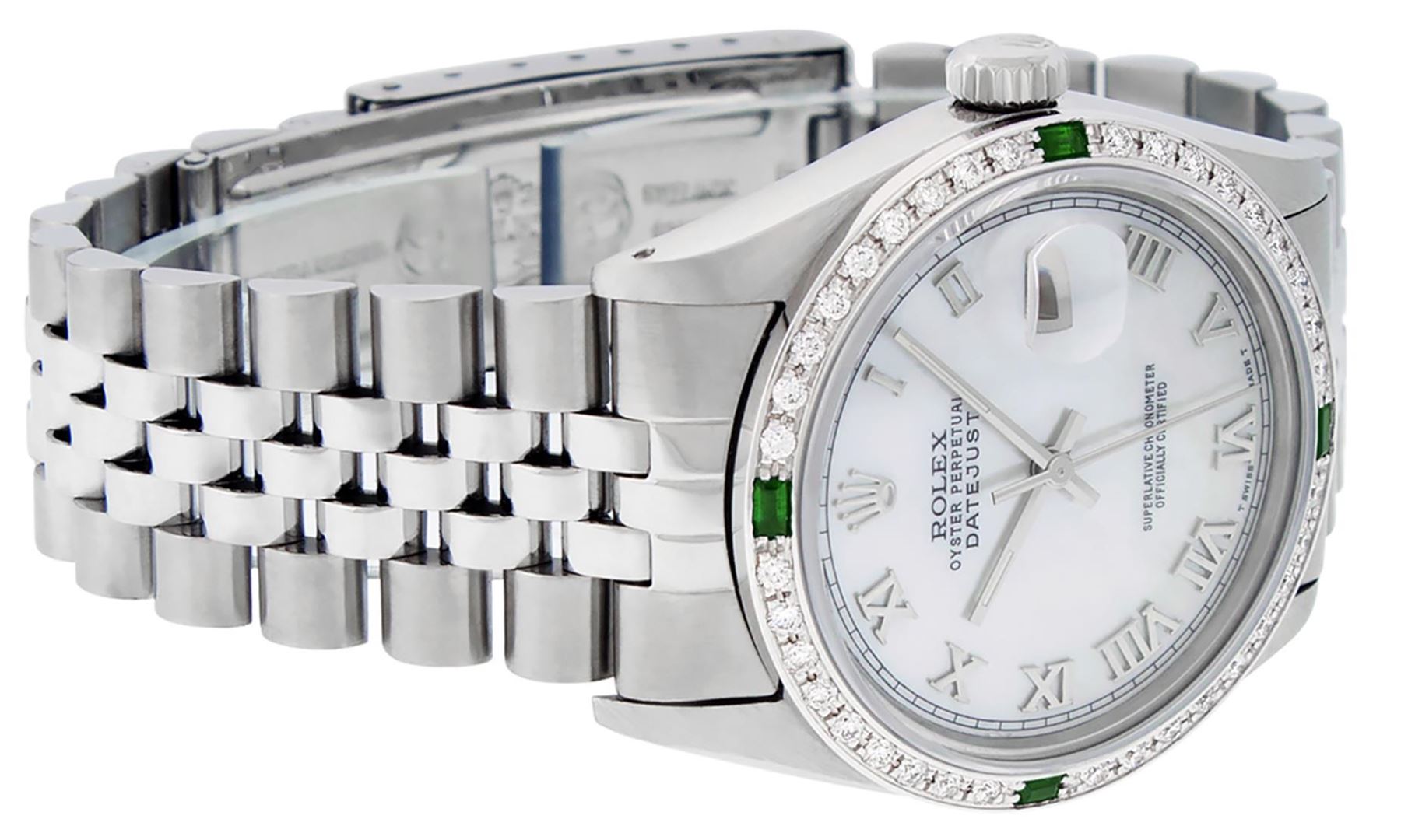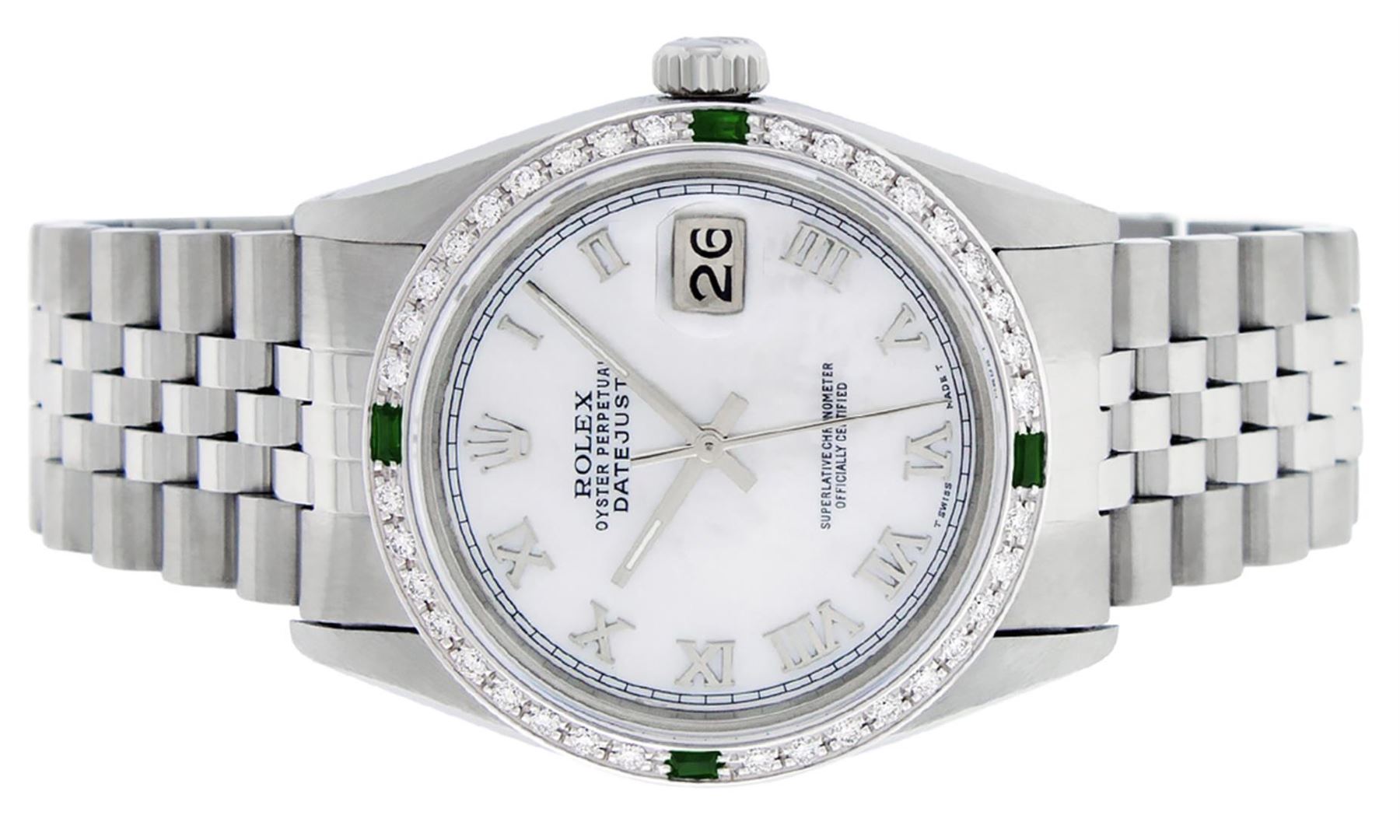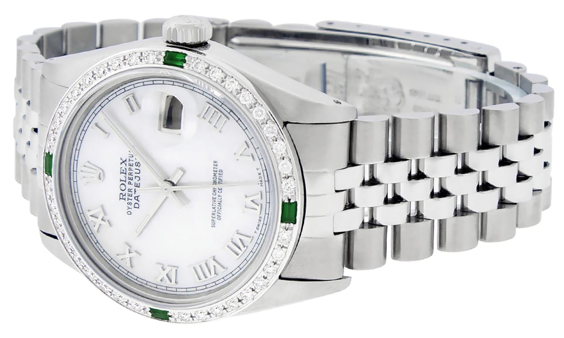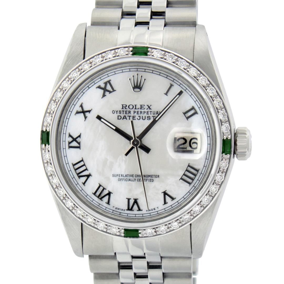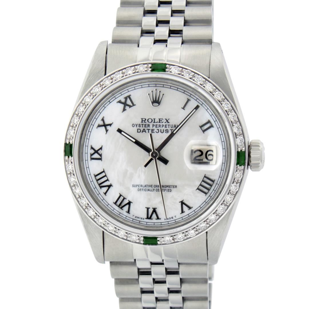 One Mens Pre Owned Stainless Steel Rolex Datejust Polished Bright with Satin Finish, This Watch Has Been Serviced And Electronically Tested, Rolex Stainless Steel Case: 36mm, Rolex Stainless Steel Crown, Custom Bezel: New 18K White Gold Emerald Beadset Diamond Bezel, Diamond + Gem Count: 36 Diamonds + 4 Emeralds. Custom Crystal: New Sapphire With Magnified Date Window. Custom Hands: New Luminescent Hands. Rolex Movement: Automatic Winding Movement 3035. Custom Dial: Custom White Dial With Roman Hour Markers. Date Window: 3 O'Clock Position Date Display, Quickset, Model: Datejust, Condition: G-6 Extra Fine. Rolex Bracelet: Stainless Steel Jubilee Band. Bracelet: 7.0 Inch Length, Adjustable. Standard Clasp, With Rolex Logo. This Watch Has Been Serviced Time Tested And Is In Excellent Condition It Is Free Of All Scratches And Dents.