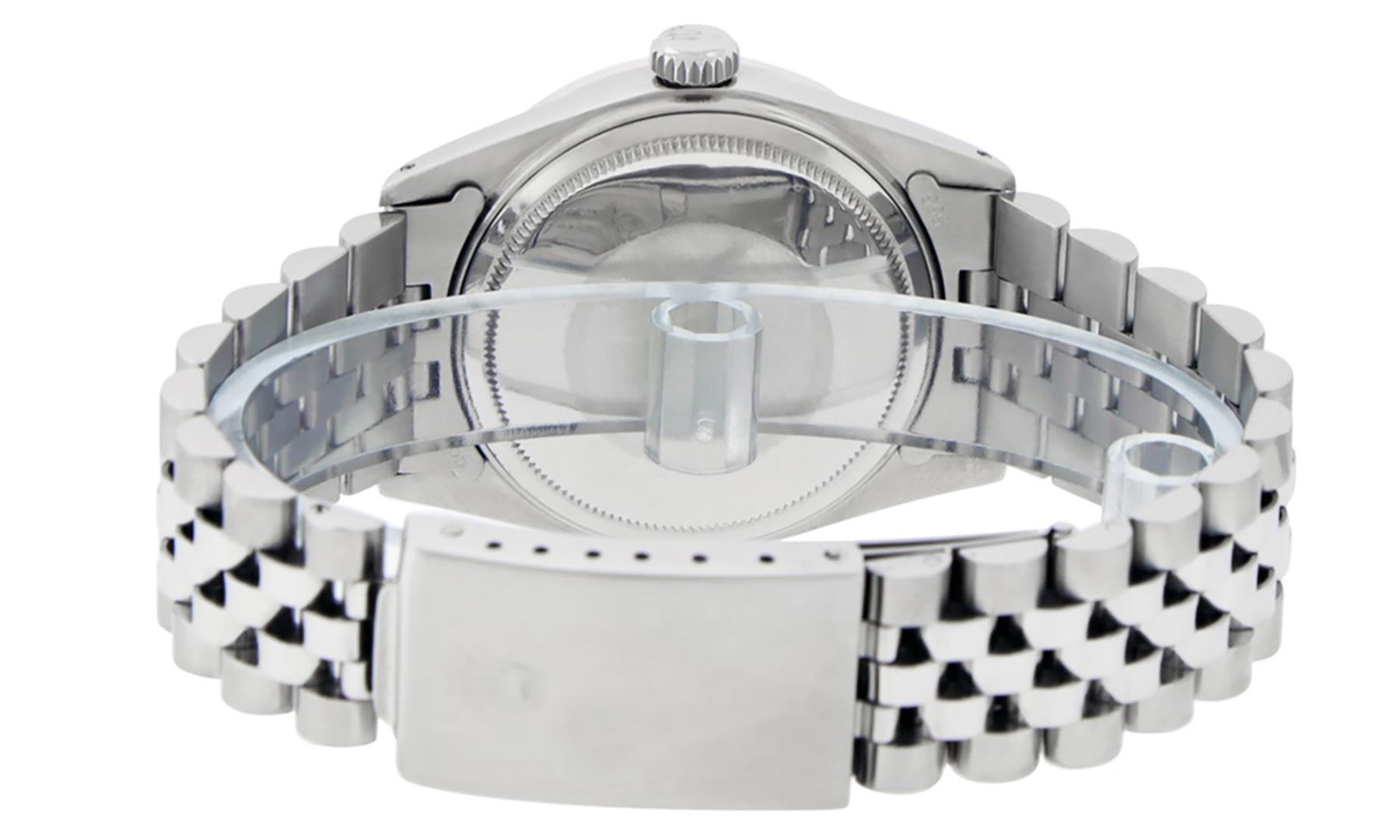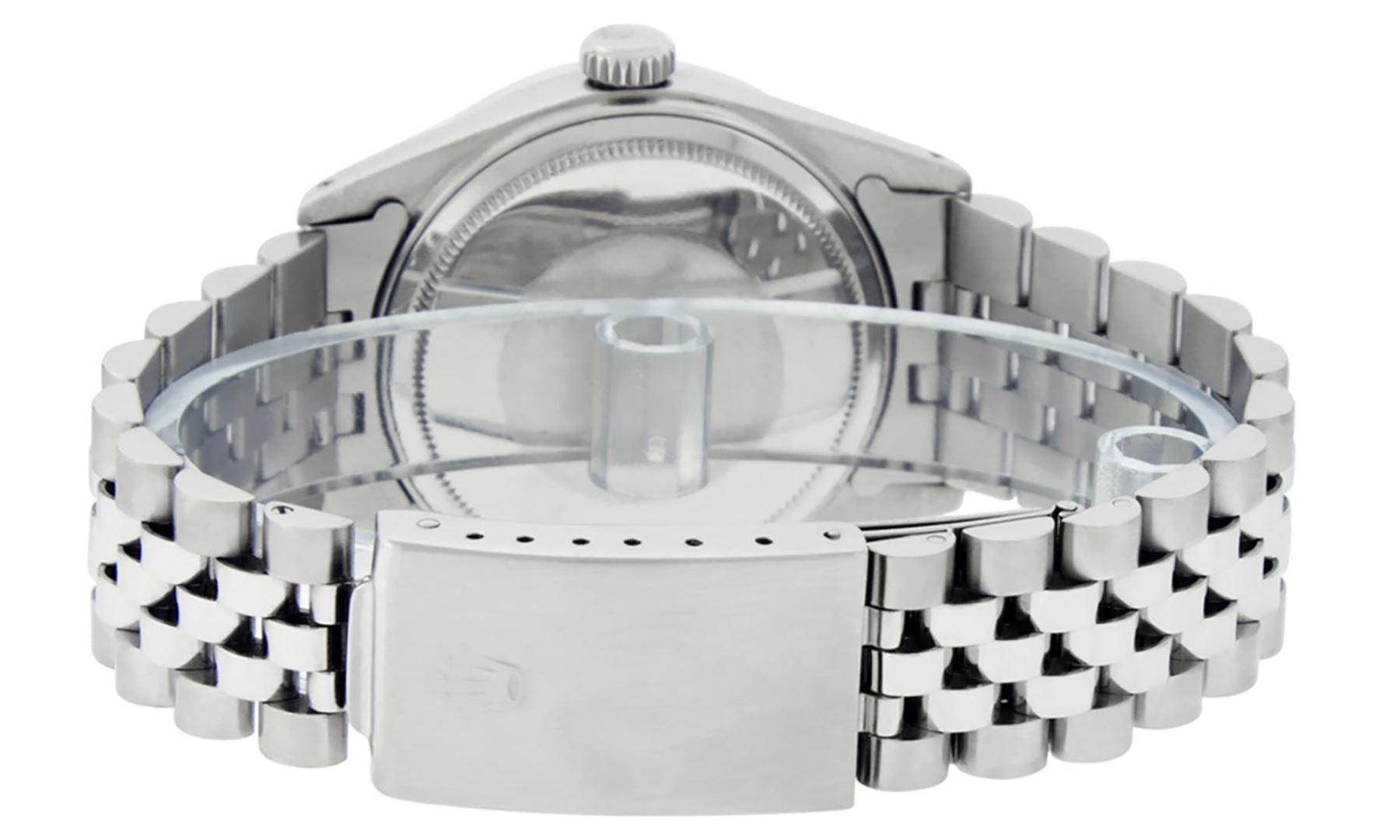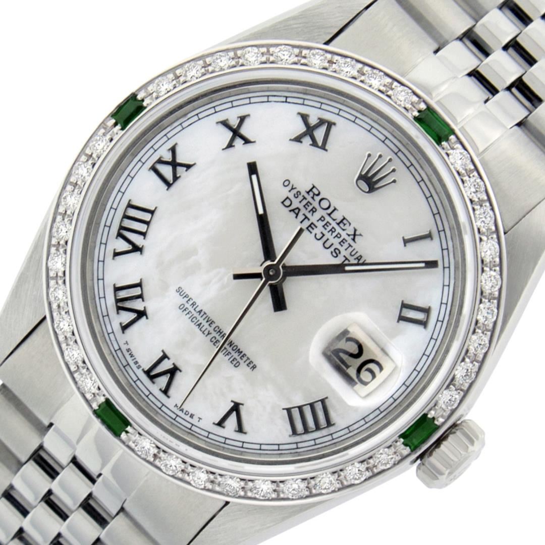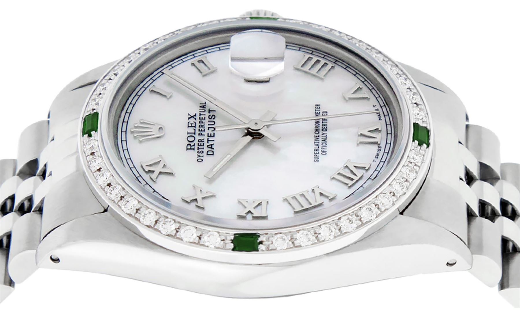 One Mens Pre Owned Stainless Steel Rolex Datejust Polished Bright with Satin Finish, This Watch Has Been Serviced And Electronically Tested, Rolex Stainless Steel Case: 36mm, Rolex Stainless Steel Crown, Custom Bezel: New 18K White Gold Emerald Beadset Diamond Bezel, Diamond + Gem Count: 36 Diamonds + 4 Emeralds. Custom Crystal: New Sapphire With Magnified Date Window. Custom Hands: New Luminescent Hands. Rolex Movement: Automatic Winding Movement 3035. Custom Dial: Custom White Dial With Roman Hour Markers. Date Window: 3 O'Clock Position Date Display, Quickset, Model: Datejust, Condition: G-6 Extra Fine. Rolex Bracelet: Stainless Steel Jubilee Band. Bracelet: 7.0 Inch Length, Adjustable. Standard Clasp, With Rolex Logo. This Watch Has Been Serviced Time Tested And Is In Excellent Condition It Is Free Of All Scratches And Dents.