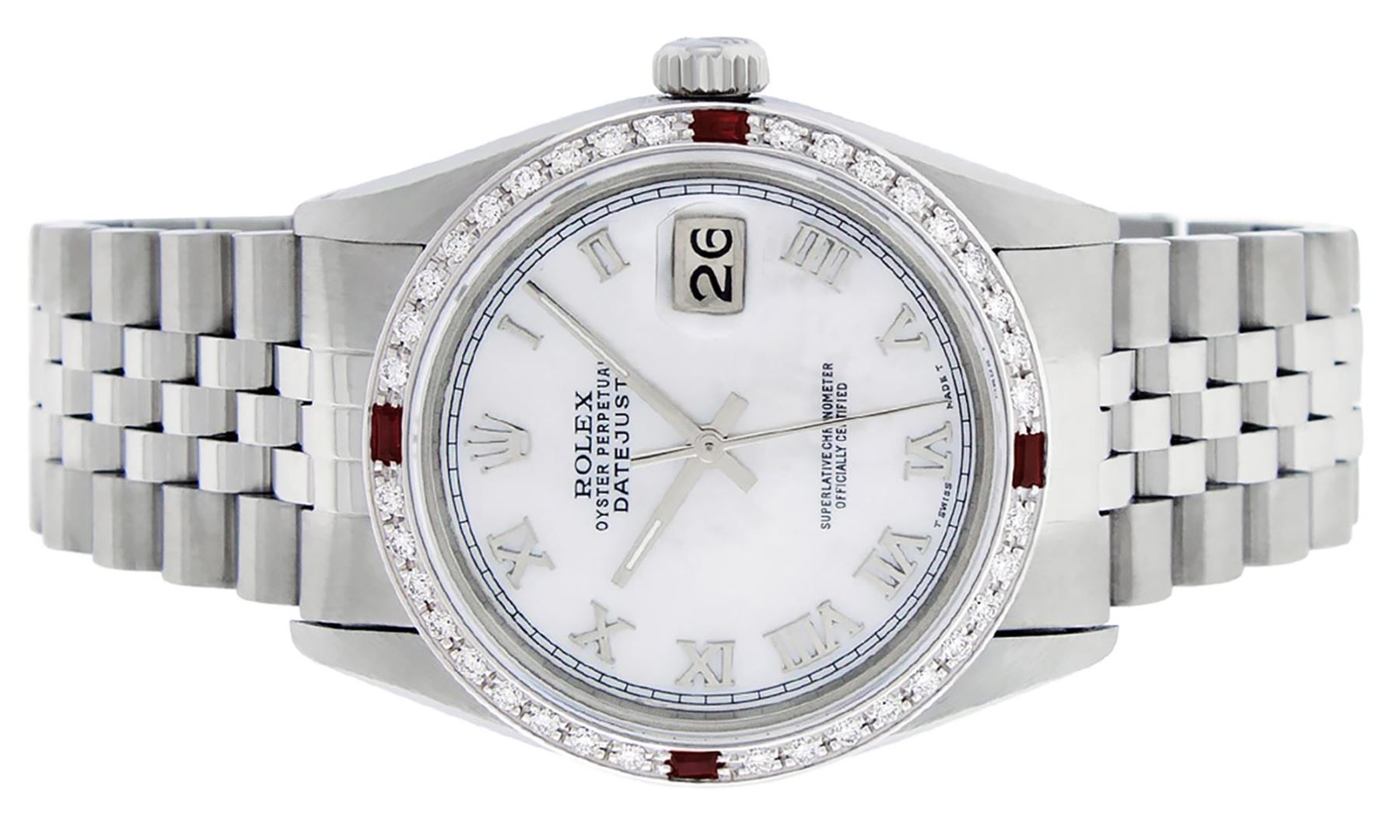 One Mens Pre Owned Stainless Steel Rolex Datejust Polished Bright with Satin Finish, This Watch Has Been Serviced And Electronically Tested, Rolex Stainless Steel Case: 36mm, Rolex Stainless Steel Crown, Custom Bezel: New 18K White Gold Ruby Beadset Diamond Bezel, Diamond + Gem Count: 36 Diamonds + 4 Rubies. Custom Crystal: New Sapphire With Magnified Date Window. Custom Hands: New Luminescent Hands. Rolex Movement: Automatic Winding Movement 3035. Custom Dial: Custom White Dial With Roman Hour Markers. Date Window: 3 O'Clock Position Date Display, Quickset, Model: Datejust, Condition: G-6 Extra Fine. Rolex Bracelet: Stainless Steel Jubilee Band. Bracelet: 7.0 Inch Length, Adjustable. Standard Clasp, With Rolex Logo. This Watch Has Been Serviced Time Tested And Is In Excellent Condition It Is Free Of All Scratches And Dents.