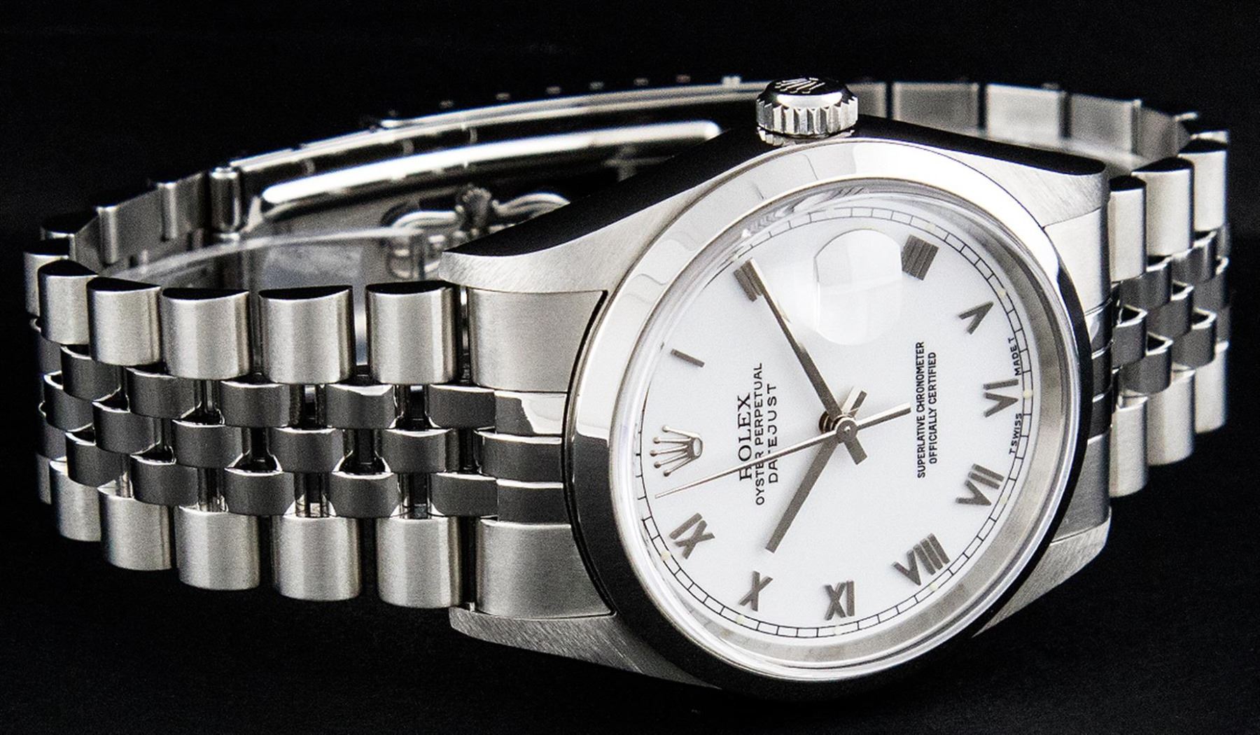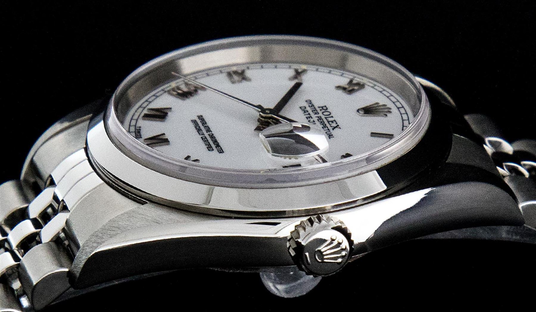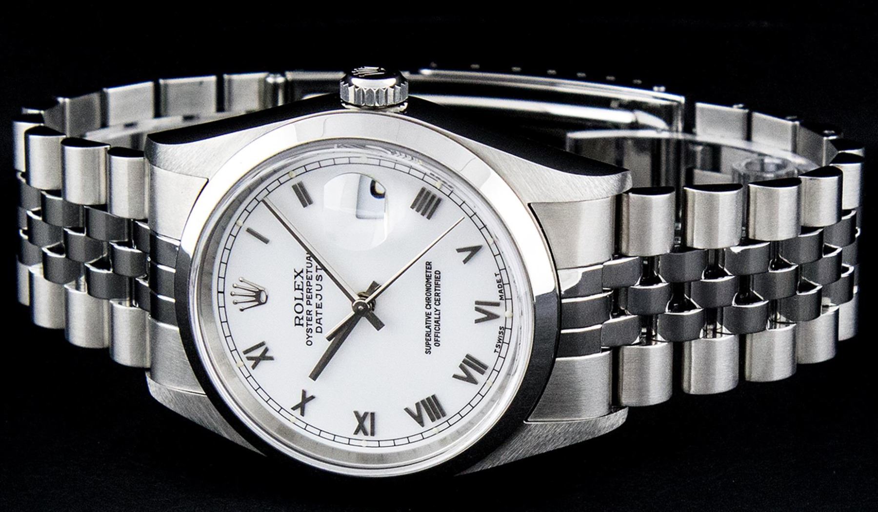 One Mens Rolex Pre Owned Quickset Stainless Steel Datejust Polished Bright with Satin Finish, Serviced & Electronically Tested, Rolex Stainless Steel Case: 36mm, Rolex Stainless Steel Crown, Rolex Bezel: Stainless Steel Smooth Bezel. Crystal: Sapphire With Magnified Date Window. Rolex Movement: Automatic Winding Movement Caliber 3135. Rolex Dial: White Roman With Square Track and Lumi Dot. Date Window: 3 O'Clock Position Date Display, Quickset, Model: Quickset Datejust. Condition: G-6 Extra Fine. Rolex Bracelet: Stainless Steel Jubilee Band. Bright Polish & Satin Finish. 7.0 Inch Length, Adjustable. Standard Clasp, With Rolex Logo. This Pre Owned Watch Has Been Serviced Time Tested And Is In Excellent Condition It Is Free Of All Scratches And Dents.