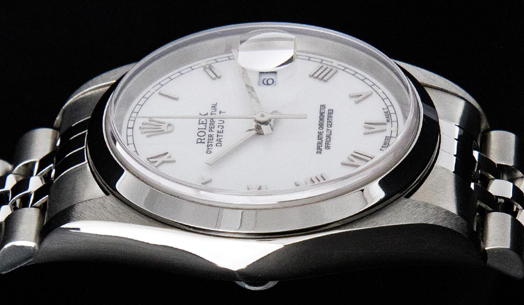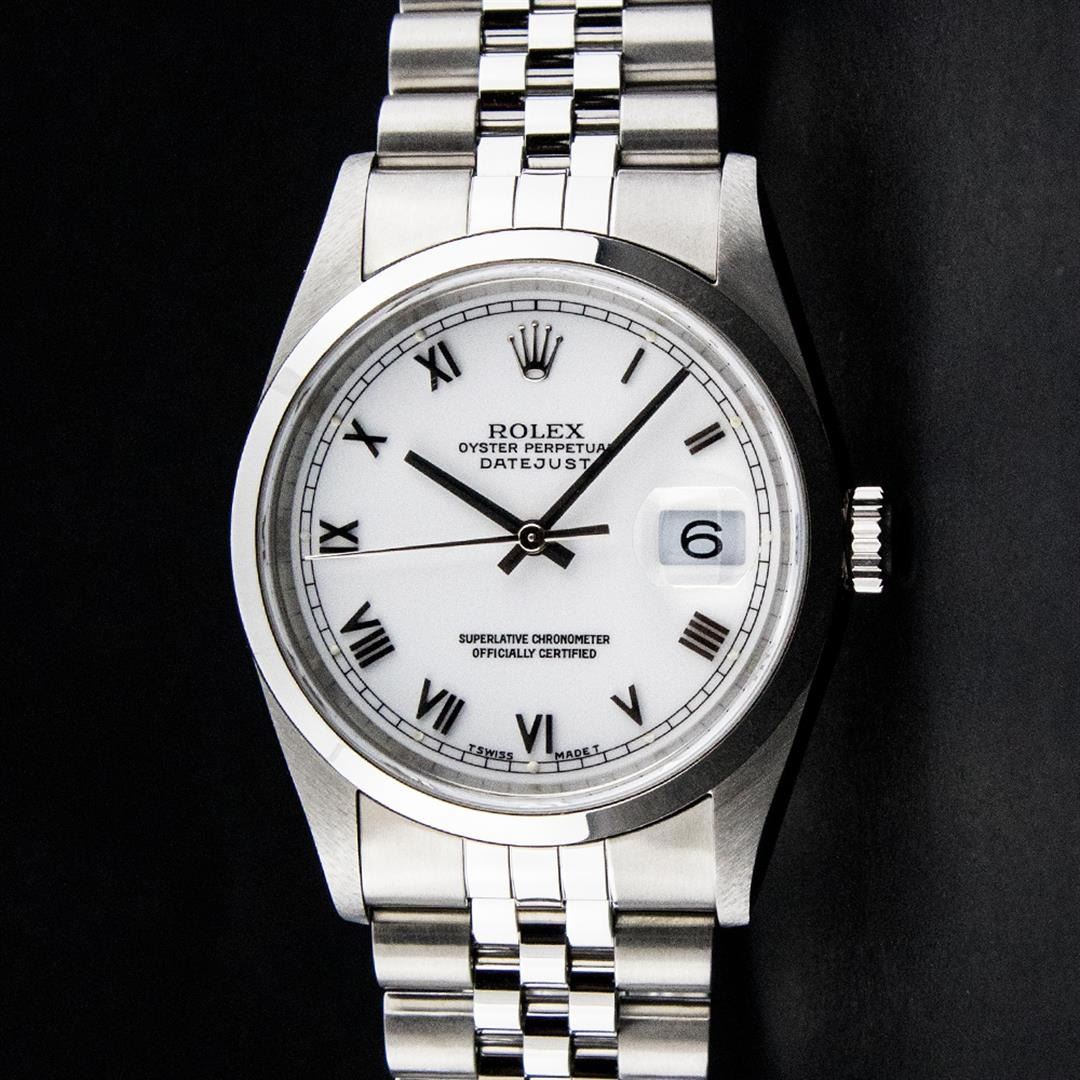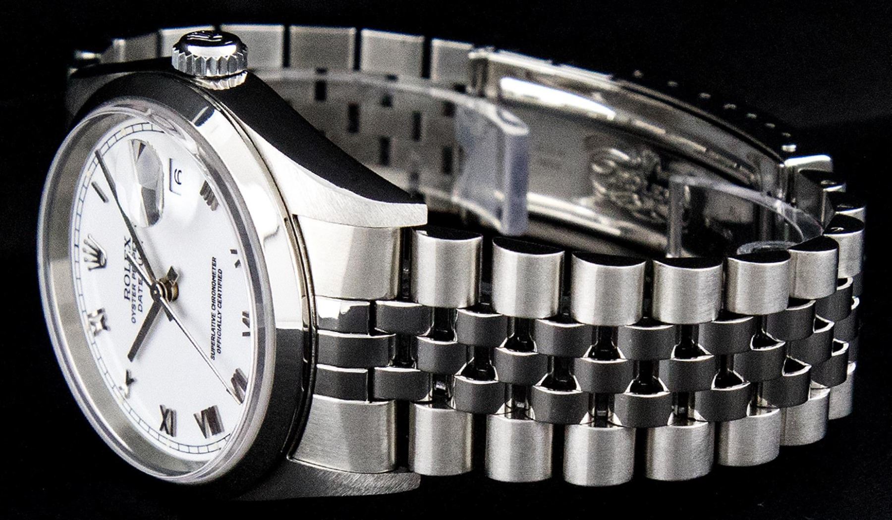 One Mens Rolex Pre Owned Quickset Stainless Steel Datejust Polished Bright with Satin Finish, Serviced & Electronically Tested, Rolex Stainless Steel Case: 36mm, Rolex Stainless Steel Crown, Rolex Bezel: Stainless Steel Smooth Bezel. Crystal: Sapphire With Magnified Date Window. Rolex Movement: Automatic Winding Movement Caliber 3135. Rolex Dial: White Roman With Square Track and Lumi Dot. Date Window: 3 O'Clock Position Date Display, Quickset, Model: Quickset Datejust. Condition: G-6 Extra Fine. Rolex Bracelet: Stainless Steel Jubilee Band. Bright Polish & Satin Finish. 7.0 Inch Length, Adjustable. Standard Clasp, With Rolex Logo. This Pre Owned Watch Has Been Serviced Time Tested And Is In Excellent Condition It Is Free Of All Scratches And Dents.