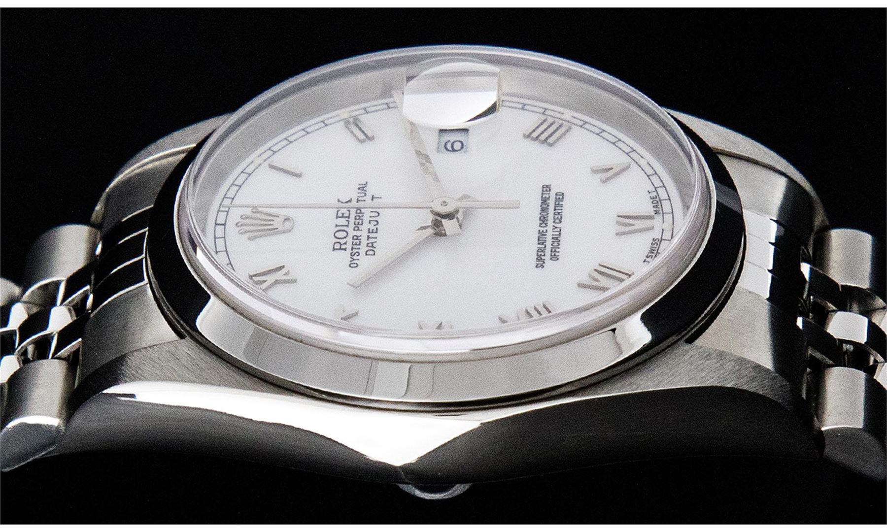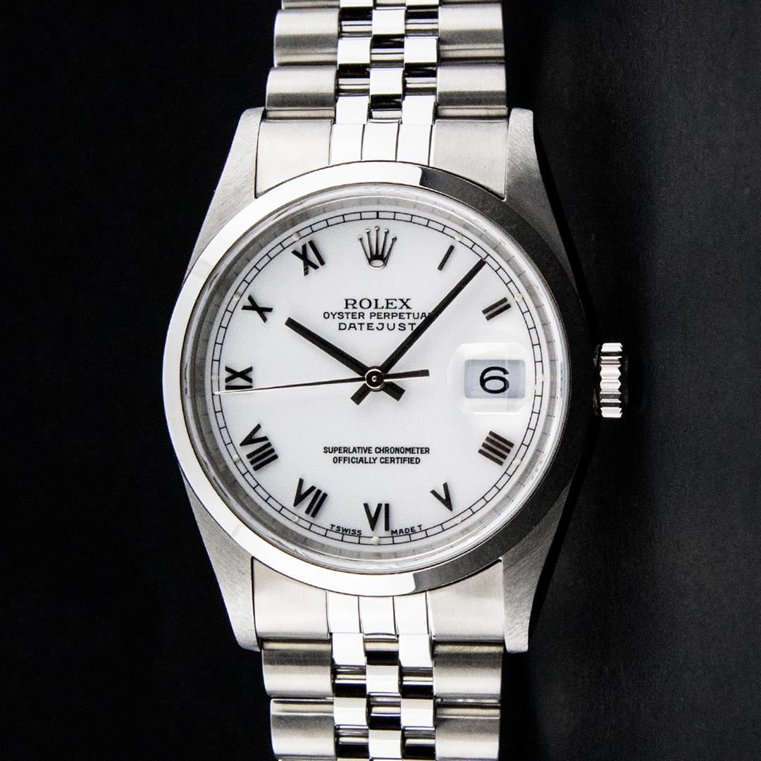 One Mens Rolex Pre Owned Quickset Stainless Steel Datejust Polished Bright with Satin Finish, Serviced & Electronically Tested, Rolex Stainless Steel Case: 36mm, Rolex Stainless Steel Crown, Rolex Bezel: Stainless Steel Smooth Bezel. Crystal: Sapphire With Magnified Date Window. Rolex Movement: Automatic Winding Movement Caliber 3135. Rolex Dial: White Roman With Square Track and Lumi Dot. Date Window: 3 O'Clock Position Date Display, Quickset, Model: Quickset Datejust. Condition: G-6 Extra Fine. Rolex Bracelet: Stainless Steel Jubilee Band. Bright Polish & Satin Finish. 7.0 Inch Length, Adjustable. Standard Clasp, With Rolex Logo. This Pre Owned Watch Has Been Serviced Time Tested And Is In Excellent Condition It Is Free Of All Scratches And Dents.