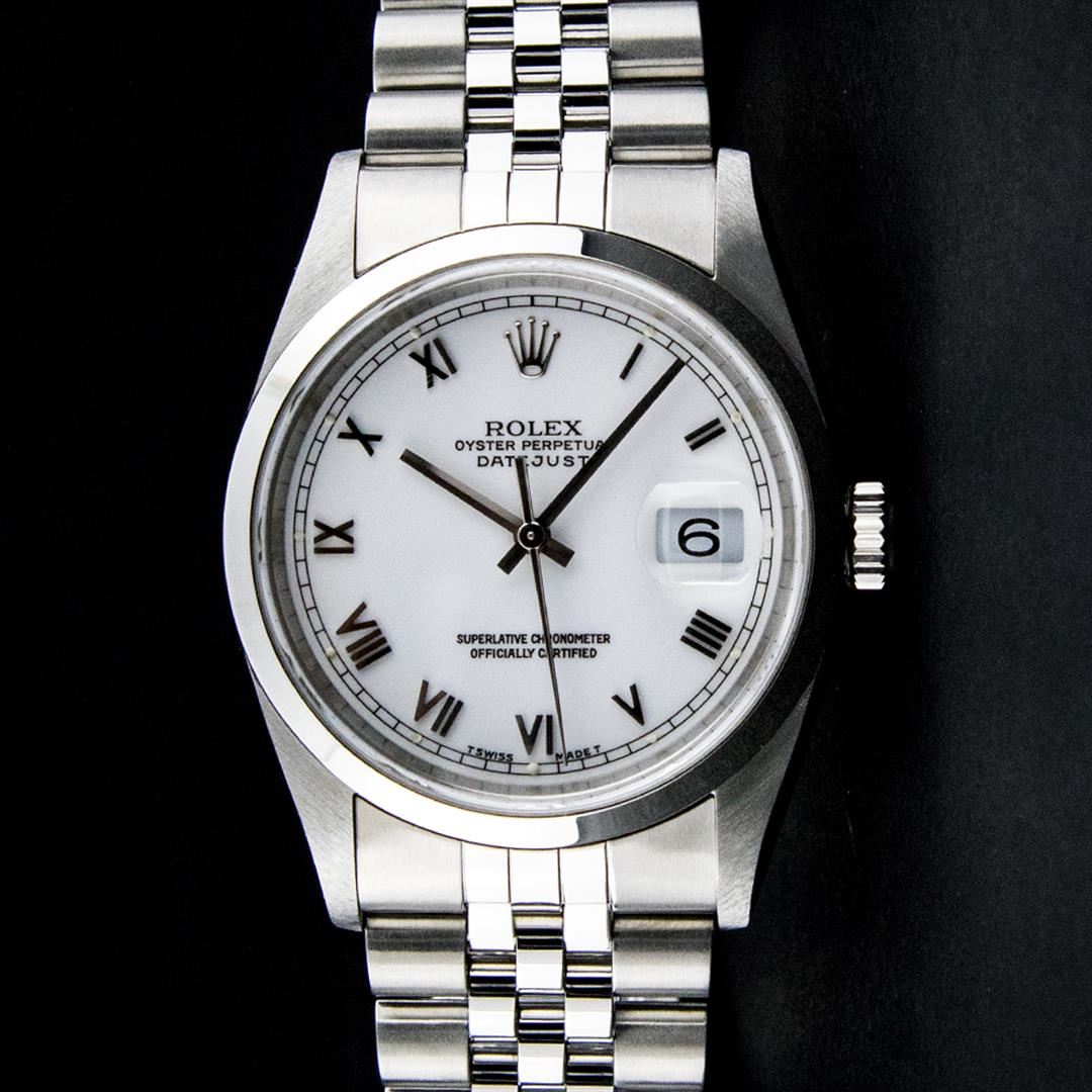 One Mens Rolex Pre Owned Quickset Stainless Steel Datejust Polished Bright with Satin Finish, Serviced & Electronically Tested, Rolex Stainless Steel Case: 36mm, Rolex Stainless Steel Crown, Rolex Bezel: Stainless Steel Smooth Bezel. Crystal: Sapphire With Magnified Date Window. Rolex Movement: Automatic Winding Movement Caliber 3135. Rolex Dial: White Roman With Square Track and Lumi Dot. Date Window: 3 O'Clock Position Date Display, Quickset, Model: Quickset Datejust. Condition: G-6 Extra Fine. Rolex Bracelet: Stainless Steel Jubilee Band. Bright Polish & Satin Finish. 7.0 Inch Length, Adjustable. Standard Clasp, With Rolex Logo. This Pre Owned Watch Has Been Serviced Time Tested And Is In Excellent Condition It Is Free Of All Scratches And Dents.