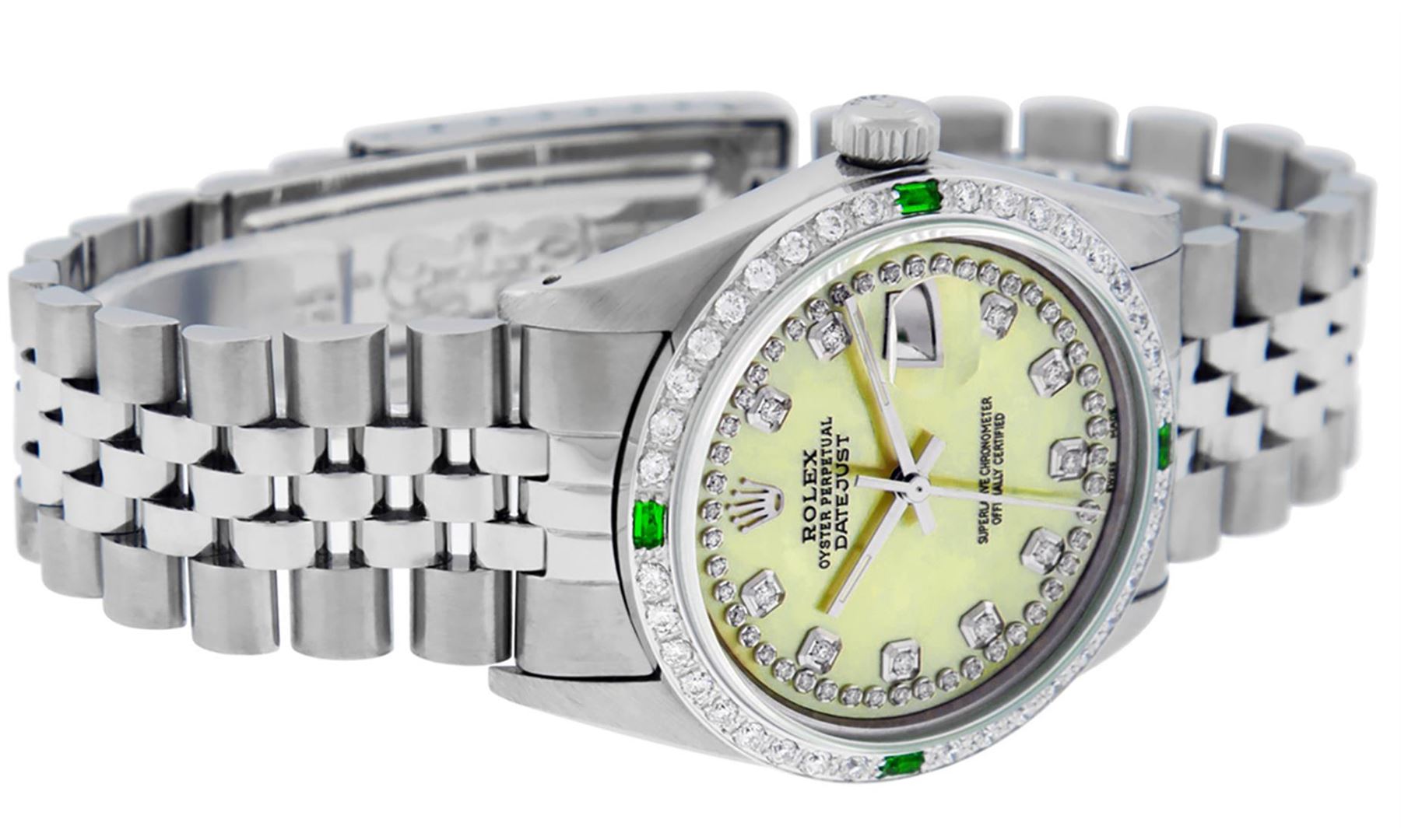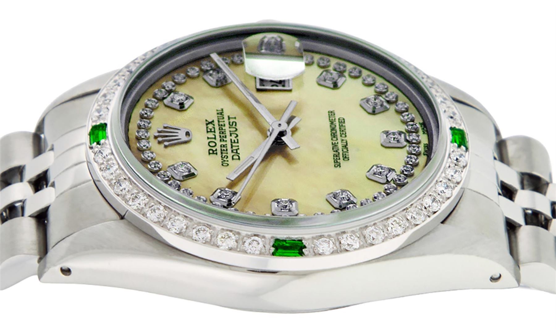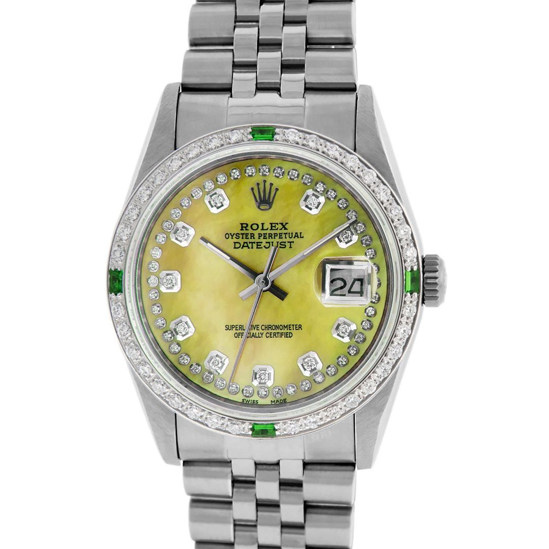 One Mens Rolex Datejust Polished Bright with Satin Finish, Serviced & Electronically Tested, Stainless Steel Case: 36mm, Custom Diamond Lugs: 28 Diamonds In Lugs, Color: G to H, Clarity: SI-VS. Stainless Steel Crown, New Custom Bezel: 18K White Gold Diamond + Emerald Beadset, Diamond Count: 36 Diamonds + 4 Emeralds, Total Weight 1.00 Carat, Clarity: SI-VS, Color: G to H. Custom Crystal: New Scratch Resistant Synthetic Sapphire Cyclops Lens. Custom Hands: New Luminescent Hands. Movement: Automatic Winding Movement Caliber 3035. Custom Dial: Yellow Mother Of Pearl String, Stone Count: 58 Diamonds In Dial, Diamond Color: G To H In Color, Clarity: VS. Date Window: 3 O'Clock Position Date Display, Quickset, Model: Datejust Condition: G-6 Extra Fine. Bracelet: Stainless Steel Jubilee Band. Bright Polish & Satin Finish. 7.0 Inch Length, Adjustable. Standard Clasp, With Rolex Logo. This Watch Has Been Serviced And Polished And Its Free Of All Dents And Scratches.
