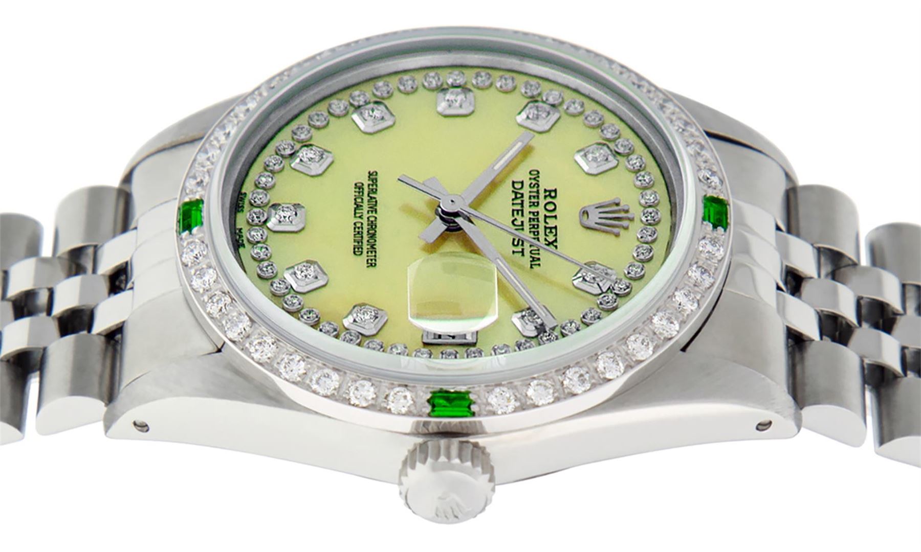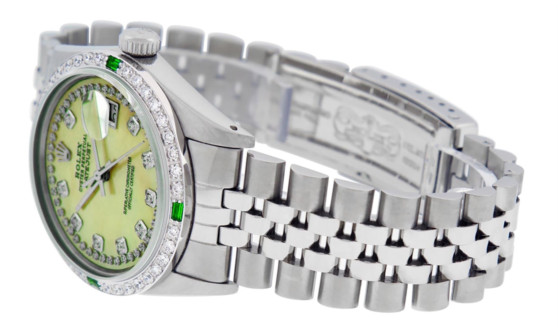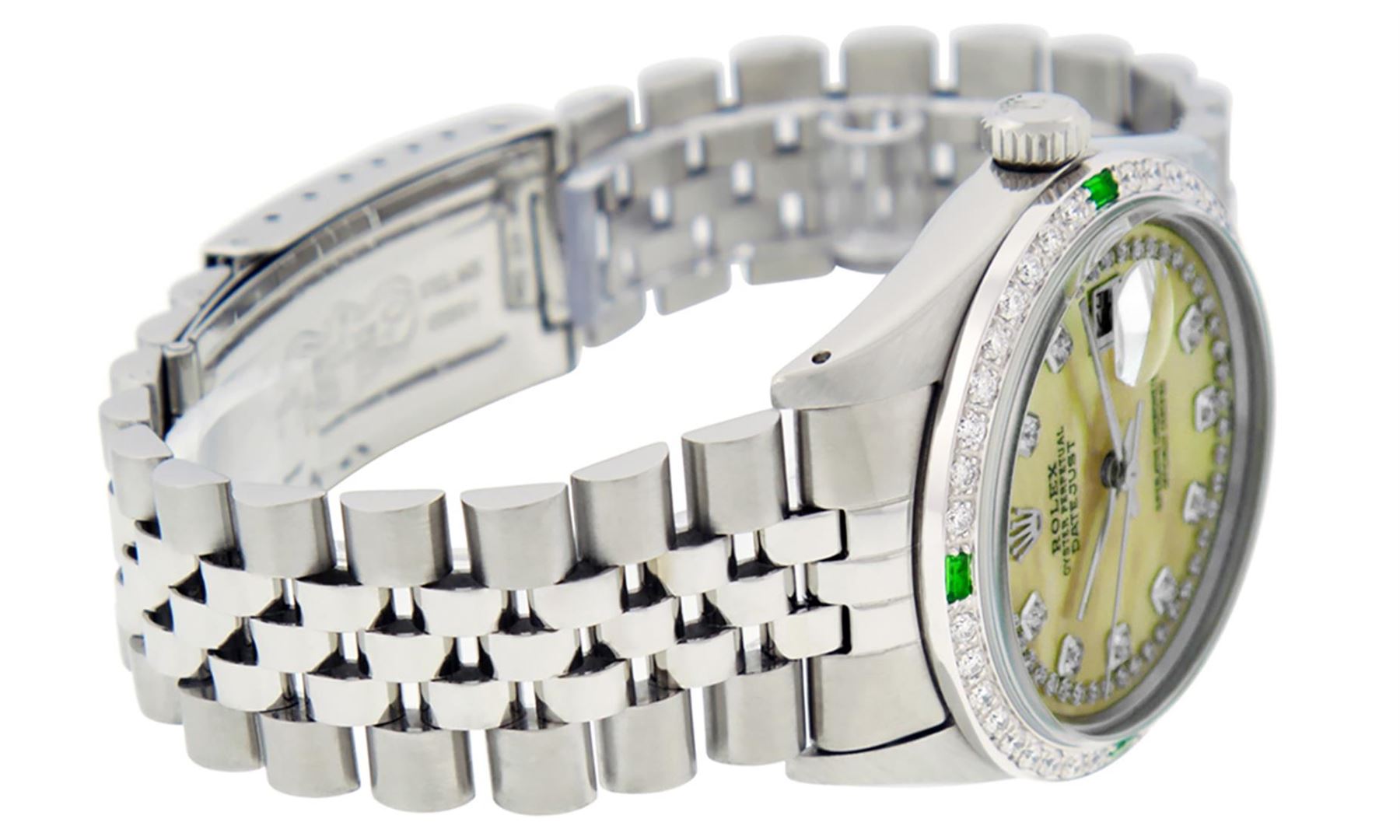 One Mens Rolex Datejust Polished Bright with Satin Finish, Serviced & Electronically Tested, Stainless Steel Case: 36mm, Custom Diamond Lugs: 28 Diamonds In Lugs, Color: G to H, Clarity: SI-VS. Stainless Steel Crown, New Custom Bezel: 18K White Gold Diamond + Emerald Beadset, Diamond Count: 36 Diamonds + 4 Emeralds, Total Weight 1.00 Carat, Clarity: SI-VS, Color: G to H. Custom Crystal: New Scratch Resistant Synthetic Sapphire Cyclops Lens. Custom Hands: New Luminescent Hands. Movement: Automatic Winding Movement Caliber 3035. Custom Dial: Yellow Mother Of Pearl String, Stone Count: 58 Diamonds In Dial, Diamond Color: G To H In Color, Clarity: VS. Date Window: 3 O'Clock Position Date Display, Quickset, Model: Datejust Condition: G-6 Extra Fine. Bracelet: Stainless Steel Jubilee Band. Bright Polish & Satin Finish. 7.0 Inch Length, Adjustable. Standard Clasp, With Rolex Logo. This Watch Has Been Serviced And Polished And Its Free Of All Dents And Scratches.