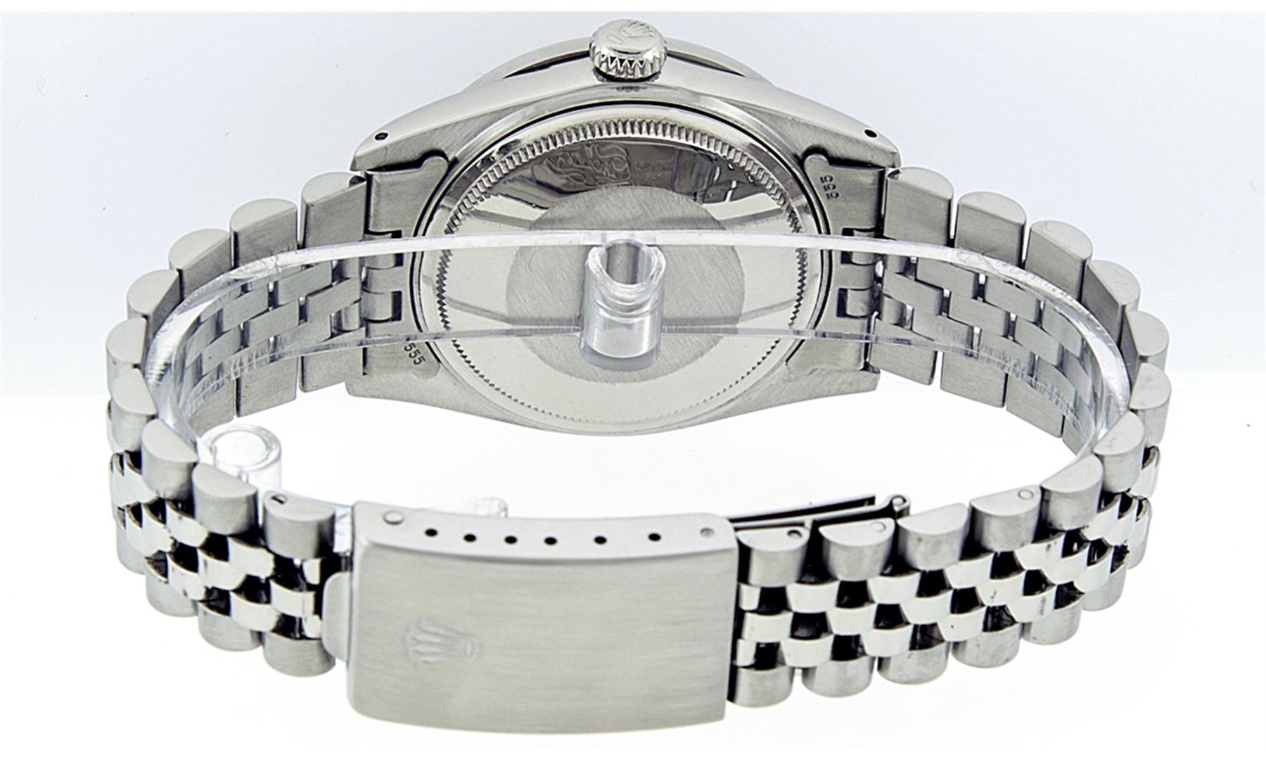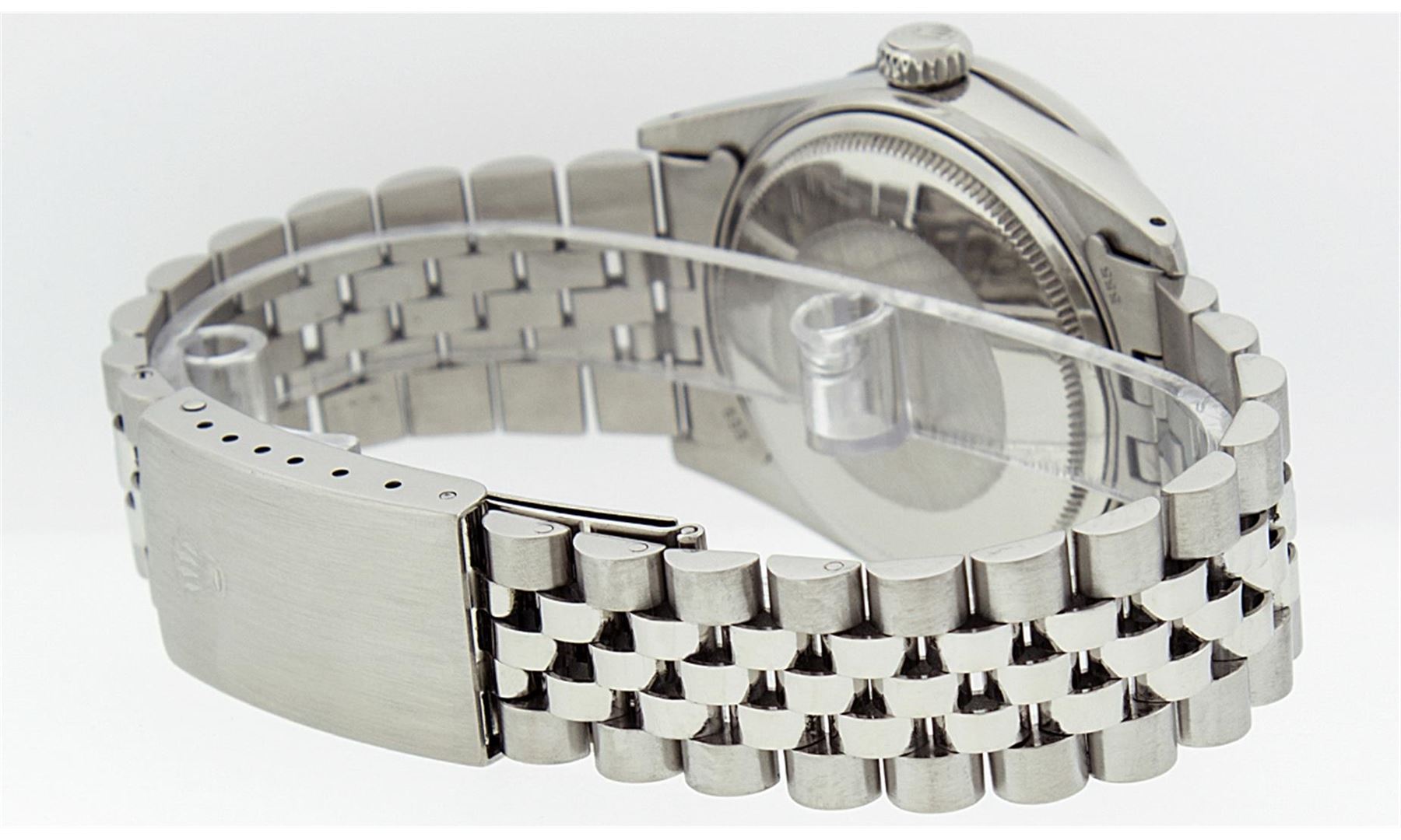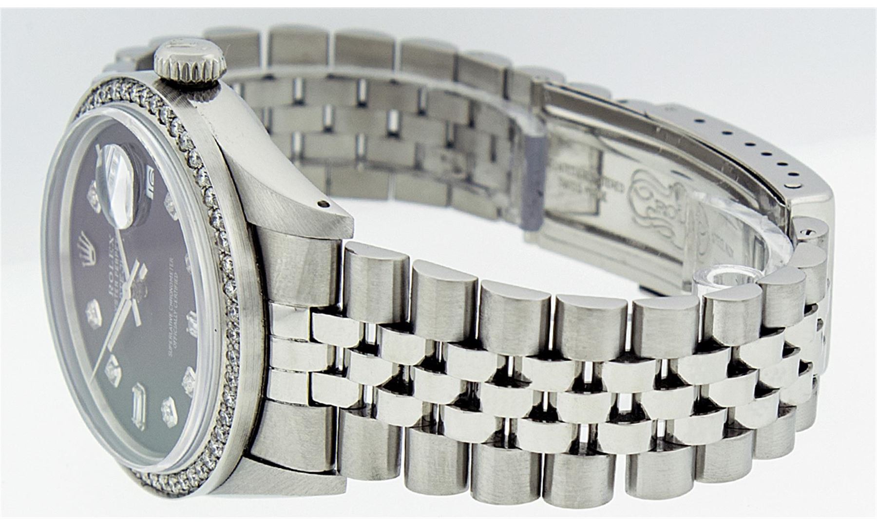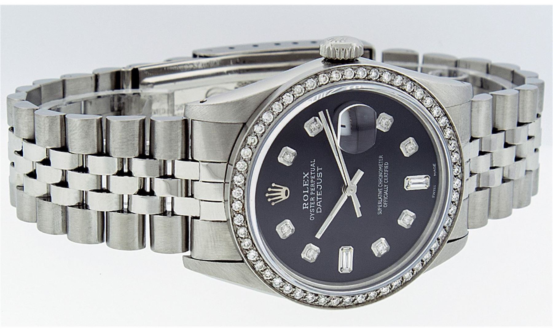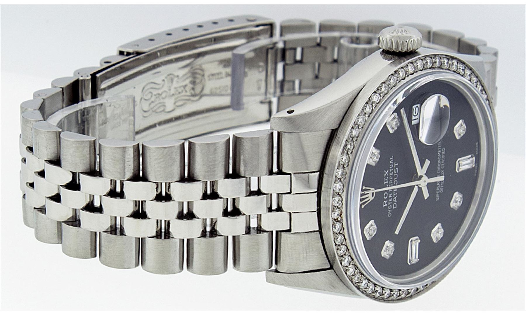 One Mens Rolex Datejust Polished Bright with Satin Finish, Serviced & Electronically Tested, Stainless Steel Case:36mm, Stainless Steel Crown, Custom Bezel: Stainless Steel Beadset Diamond Bezel, Diamond Count: 54 Diamonds Total Weight .90 Carat, Clarity: SI-VS, Color: G to H. Custom Crystal: Synthetic Sapphire Cyclops Lens. Movement: Automatic Winding Movement Caliber 3035. Custom Dial: Black Diamond 8 + 2, Diamond Count: 8 Diamonds + 2 Baguettes, Diamond Color: G to H, VS2 Si1. Date Window: 3 O'Clock Position Date Display, Quickset, Model: Datejust. Condition: G-6 Extra Fine. Bracelet:Stainless Steel Jubilee. Bright Polish & Satin Finish. 7.0 Inch Length, Adjustable. Standard Clasp, With Rolex Logo.