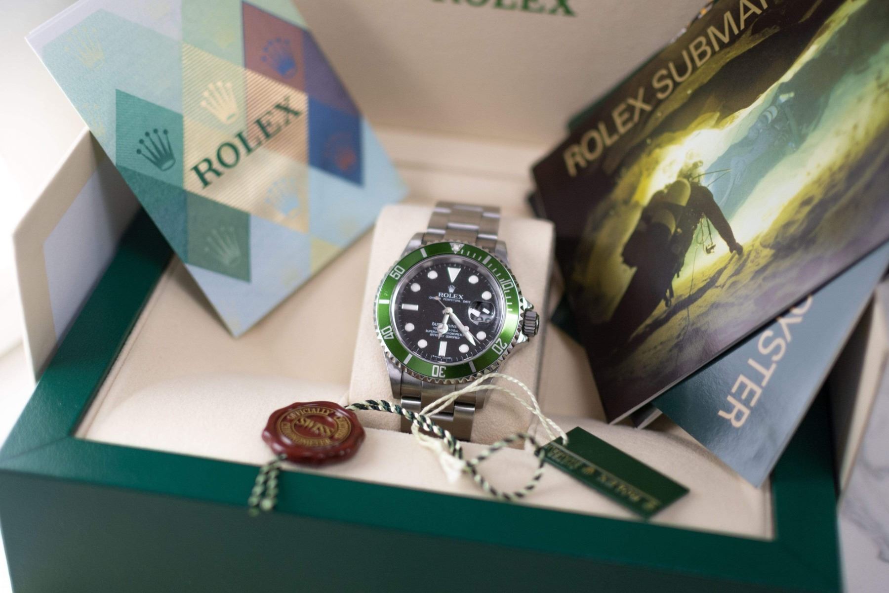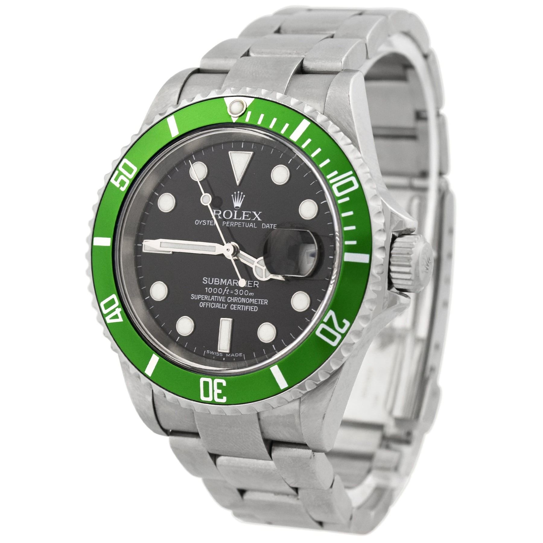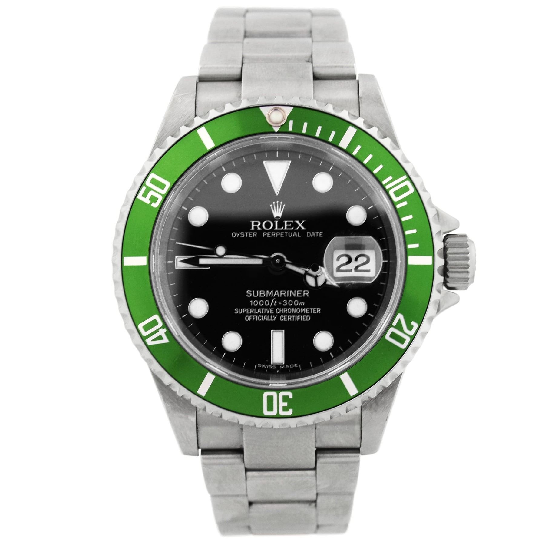 Model: Submariner Date Kermit. Reference #: 16610LV . Case: Stainless Steel. Case Size: 40mm. Bracelet: Oyster Bracelet. Dial: Black Dial w/ Dot Hour Markers. Bezel: Unidirectional Rotatable 60-Minute Green Aluminum Bezel. Date Window: 3 O'clock Position w/ Cyclops Lens. Movement: Automatic Winding Movement . Water Resistant: Yes 300 Meters/1000 Feet. Crystal: Scratch-Resistant Sapphire Crystal. Condition: Pre-Owned. Box, Original Hang Tags, & Papers Included! (Complete Set!). Circa: 2006. All Pre-Owned watches are guaranteed to be 100% genuine. Your watch will come with a 2-year limited warranty, original box, and appraisal.